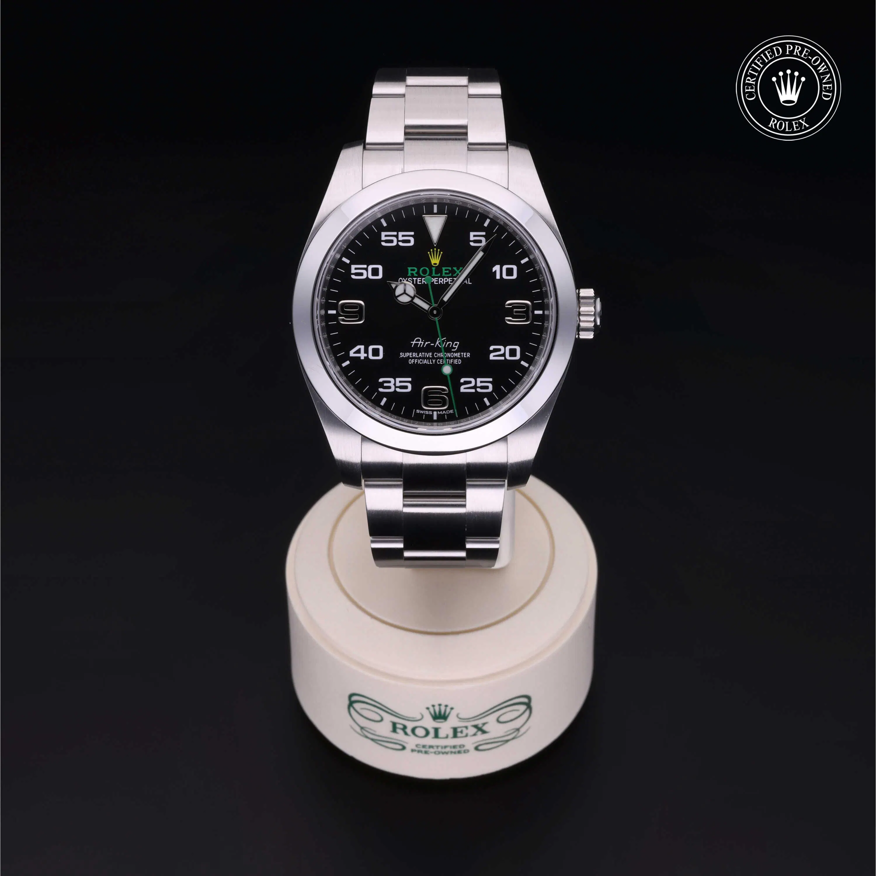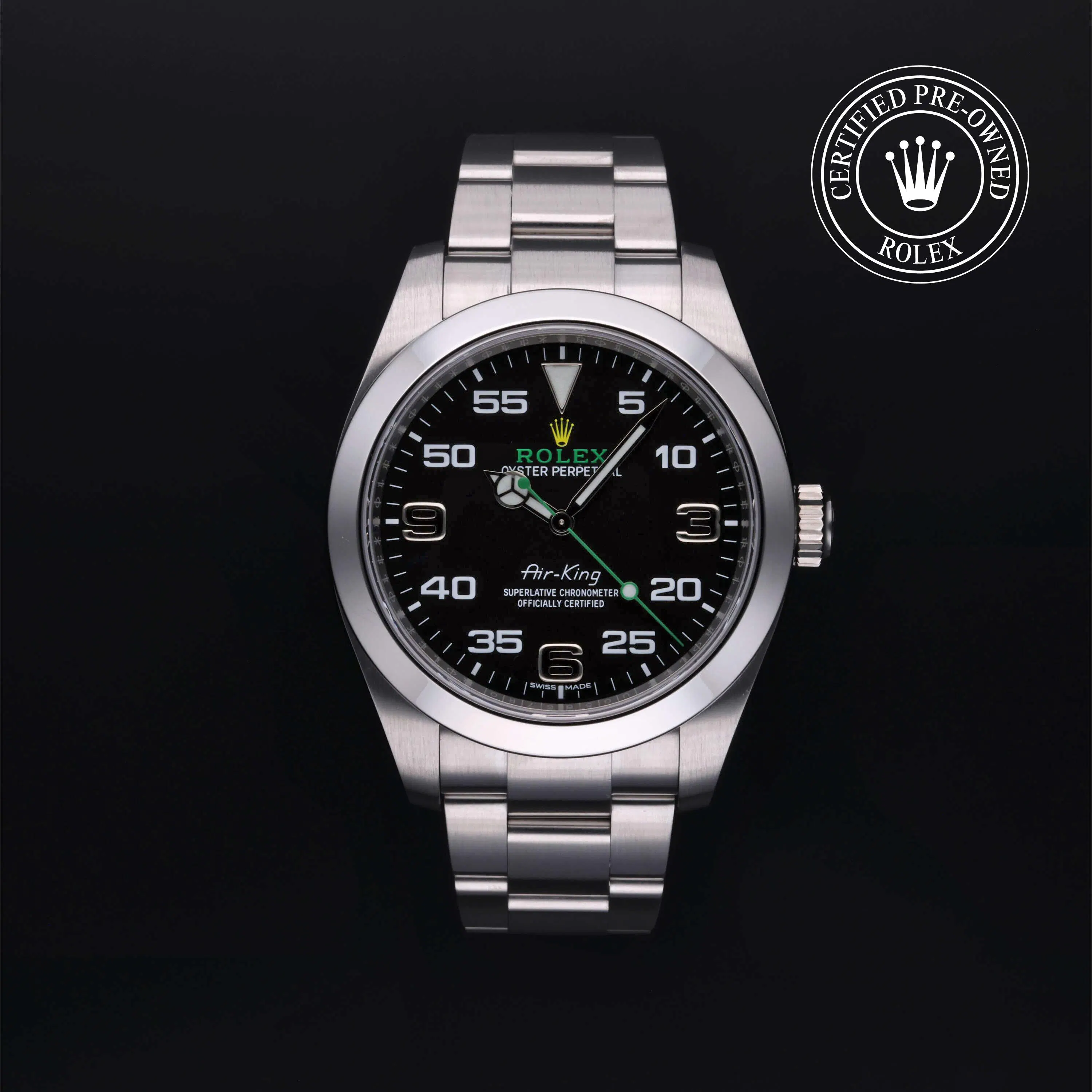 Rolex Certified Pre-Owned Air-King (116900) self - winding automatic watch, features a 40mm stainless steel case and smooth bezel surrounding a black dial The watch is secured on a stainless steel Oyster bracelet complete with a folding bucjke. Functions include hours, minutes and seconds. This watch has received Rolex-authorized service and certification. It comes with the original box and papers, and includes a custom Rolex Certified Pre-Owned hang tag, travel pouch and RCPO international warranty card.