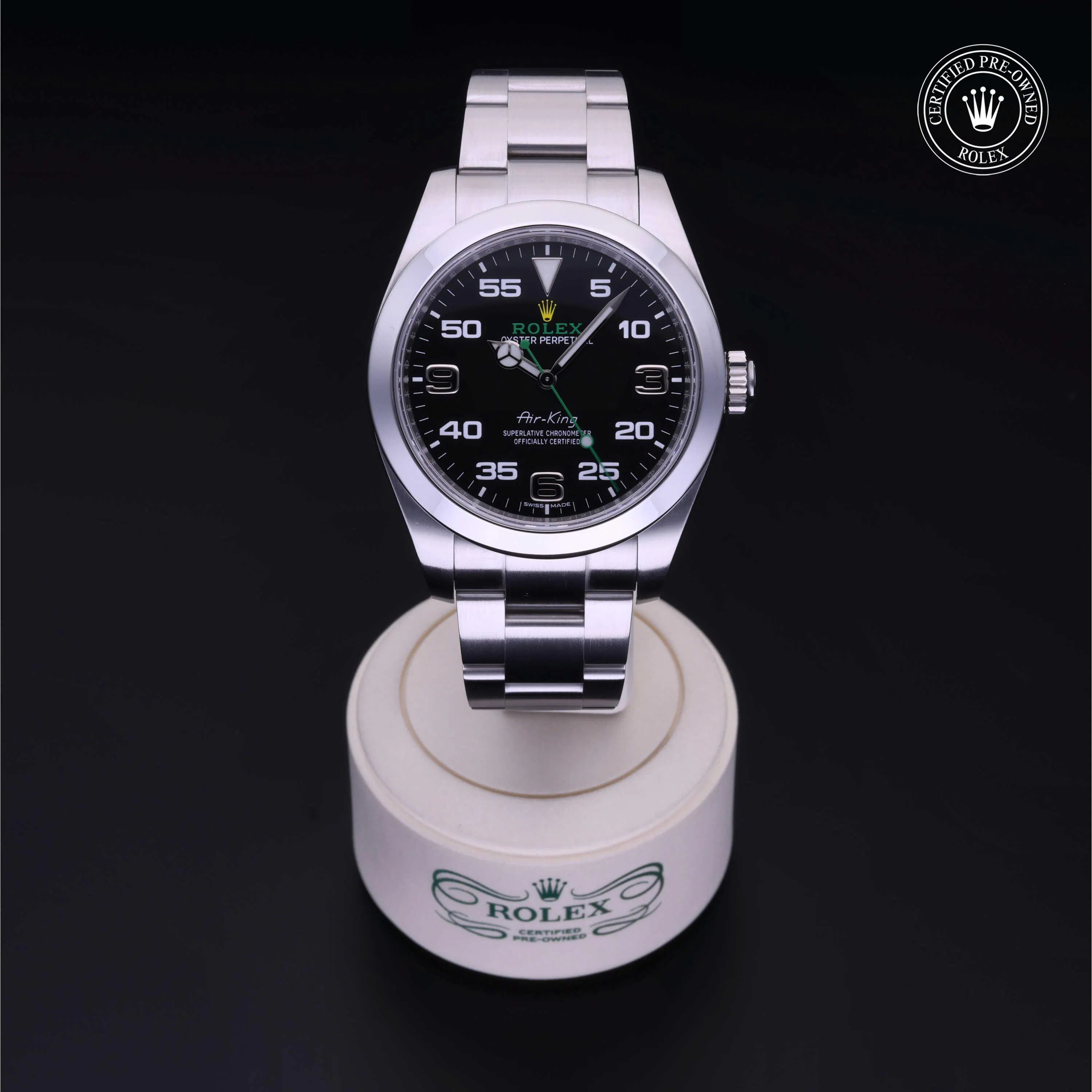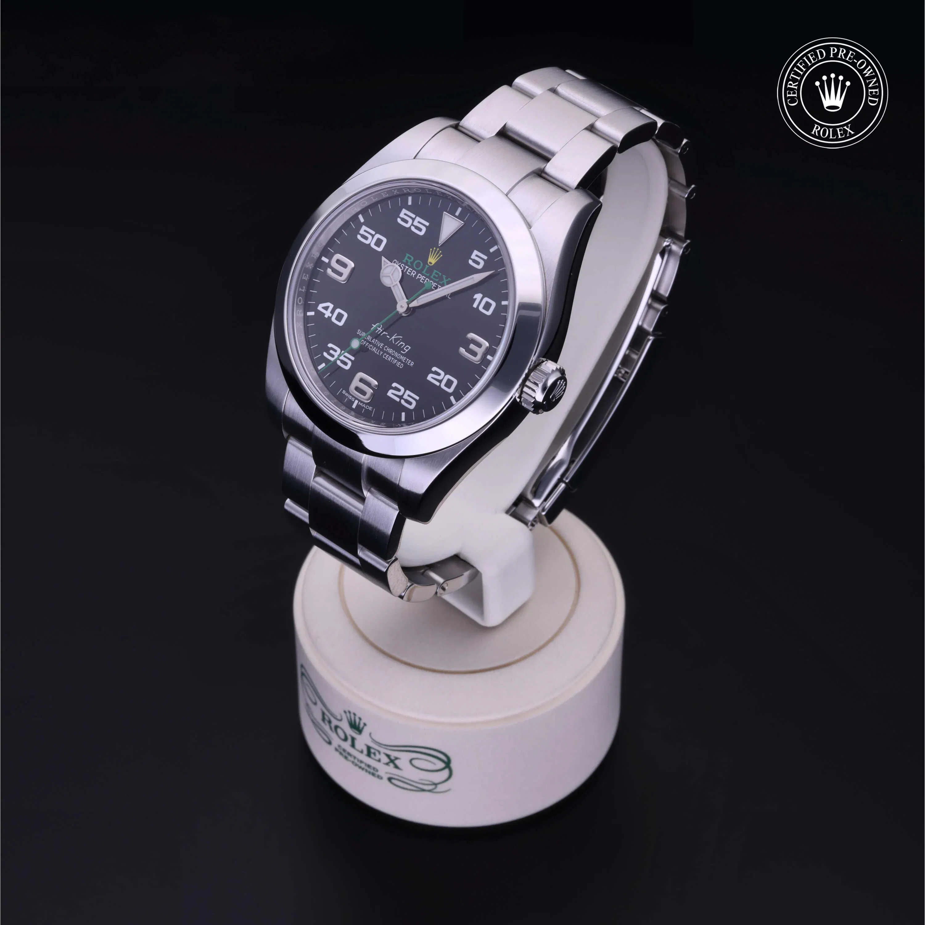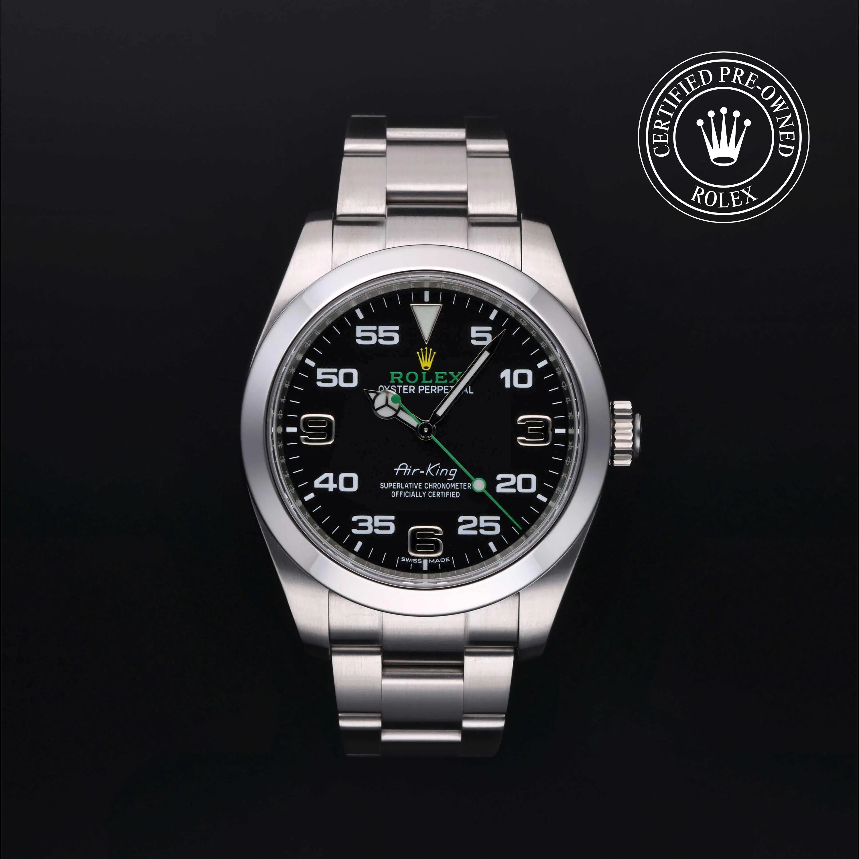 Rolex Certified Pre-Owned Air-King (116900) self - winding automatic watch, features a 40mm stainless steel case and smooth bezel surrounding a black dial. The watch is secured on a stainless steel Oyster bracelet complete with a folding buckle. Functions include hours, minutes and seconds. This watch has received Rolex-authorized service and certification. It does not come with the original box or papers, but includes a custom Rolex Certified Pre-Owned hang tag, travel pouch and RCPO international warranty card.