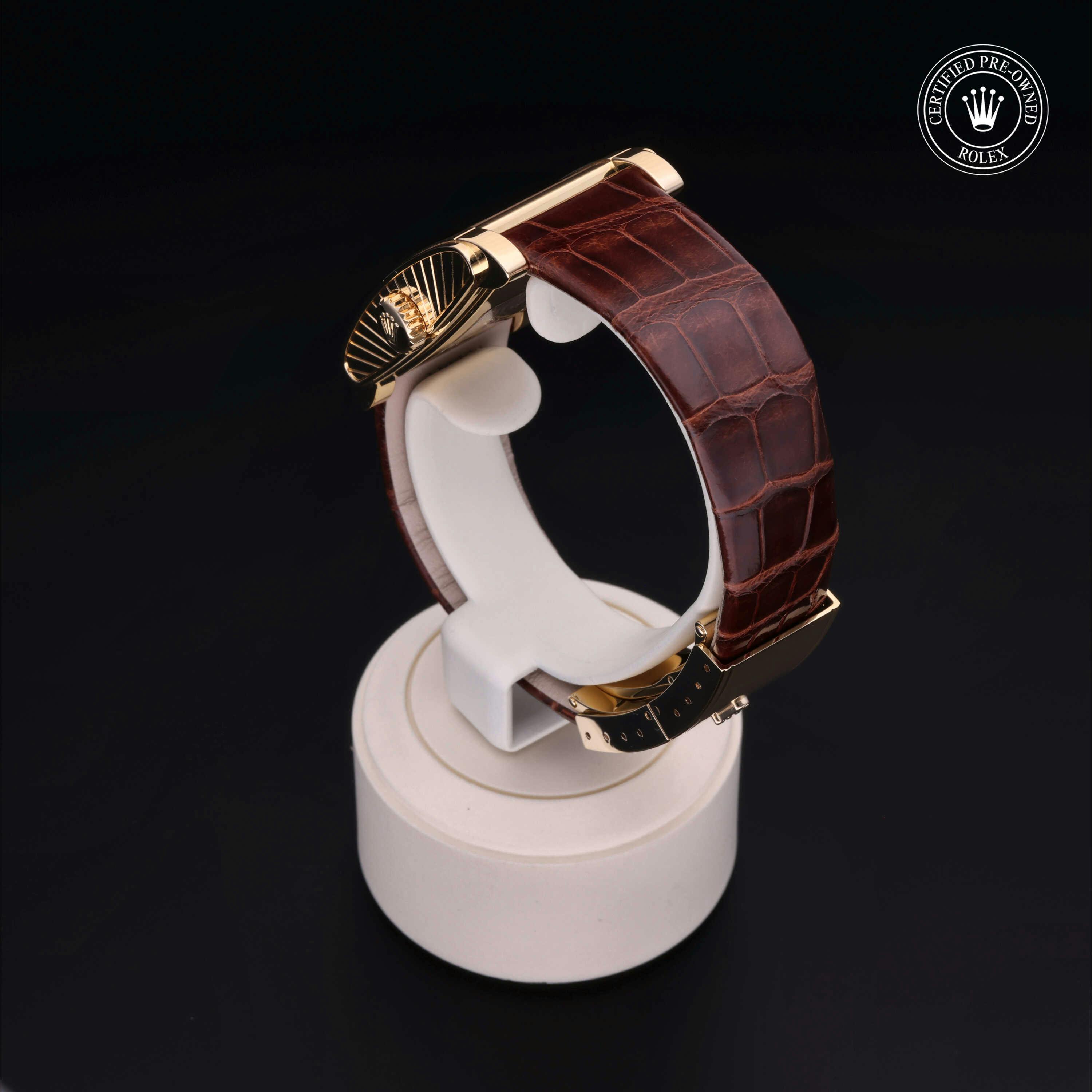 Rolex Certified Pre-Owned Cellini Prince (54408) manual wind watch, features a 35x28mm 18k yellow gold case surrounding a champagne dial on a brown alligator strap with an 18k yellow gold deployant buckle. Functions include hours, minutes and seconds. This watch has received Rolex-authorized service and certification. It does not come with the original box or papers, but includes a custom Rolex Certified Pre-Owned hang tag, travel pouch and RCPO international warranty card.