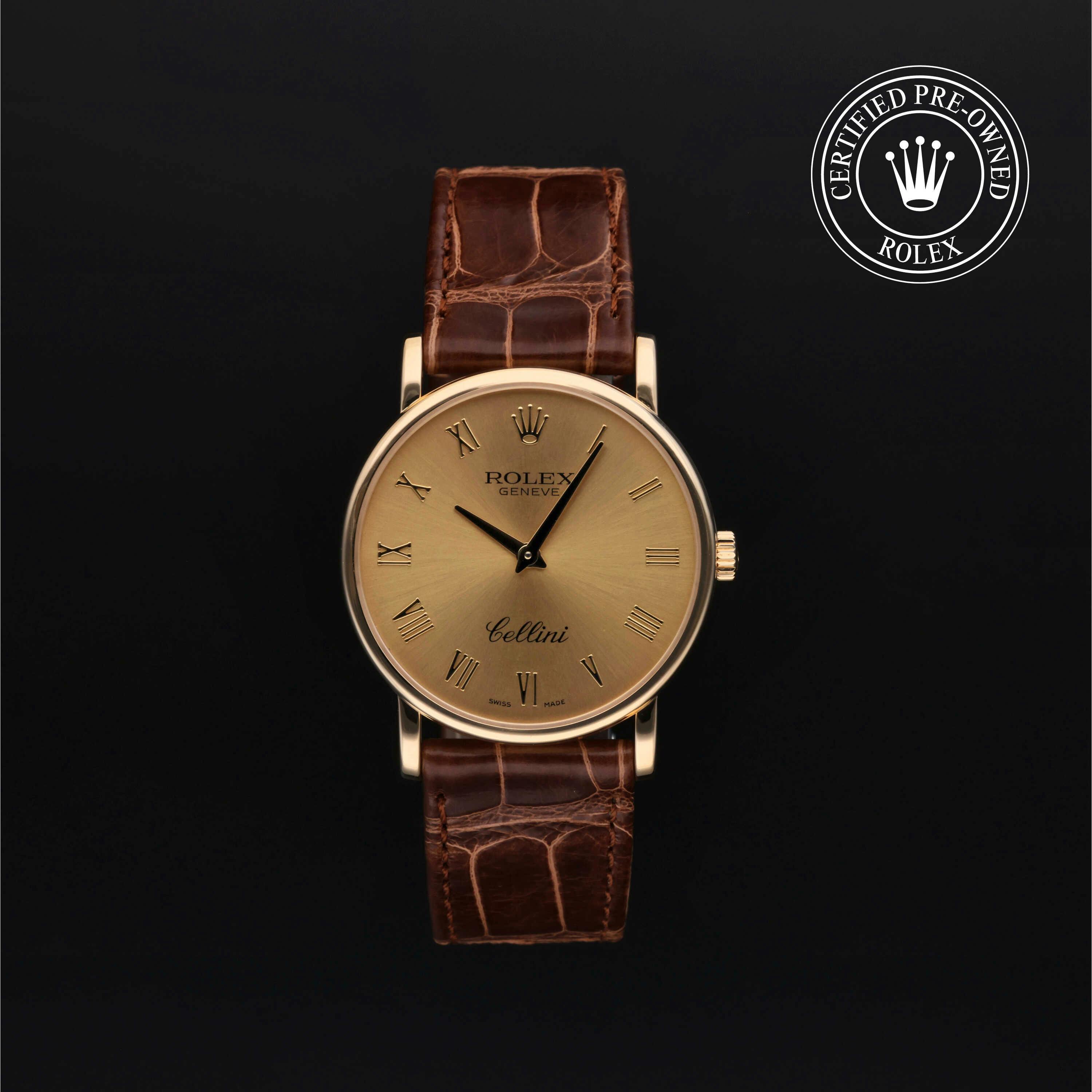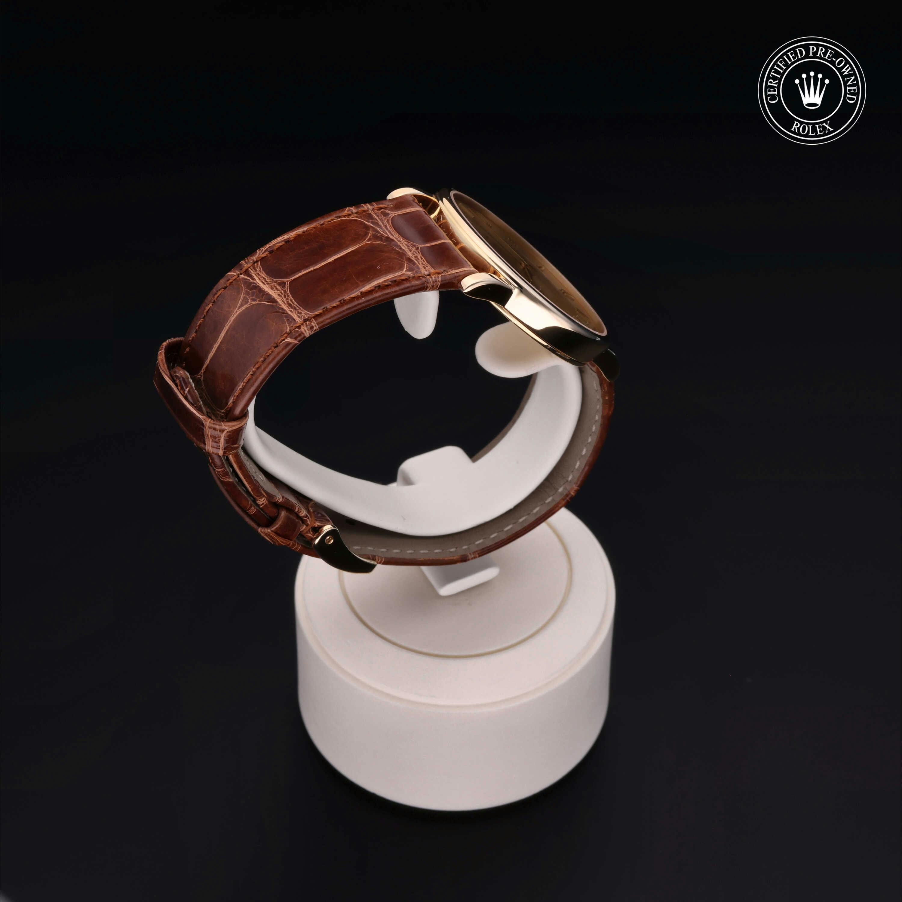 Rolex Certified Pre-Owned Cellini (5115CHPROMTB) manual wind watch, features a 31.8mm 18k yellow gold case and smooth bezel surrounding a champagne dial on a brown alligator strap with an 18k yellow gold tang buckle. Functions include hours and minutes. This watch has received Rolex-authorized service and certification. It does not come with the original box or papers, but includes a custom Rolex Certified Pre-Owned hang tag, travel pouch and RCPO international warranty card.