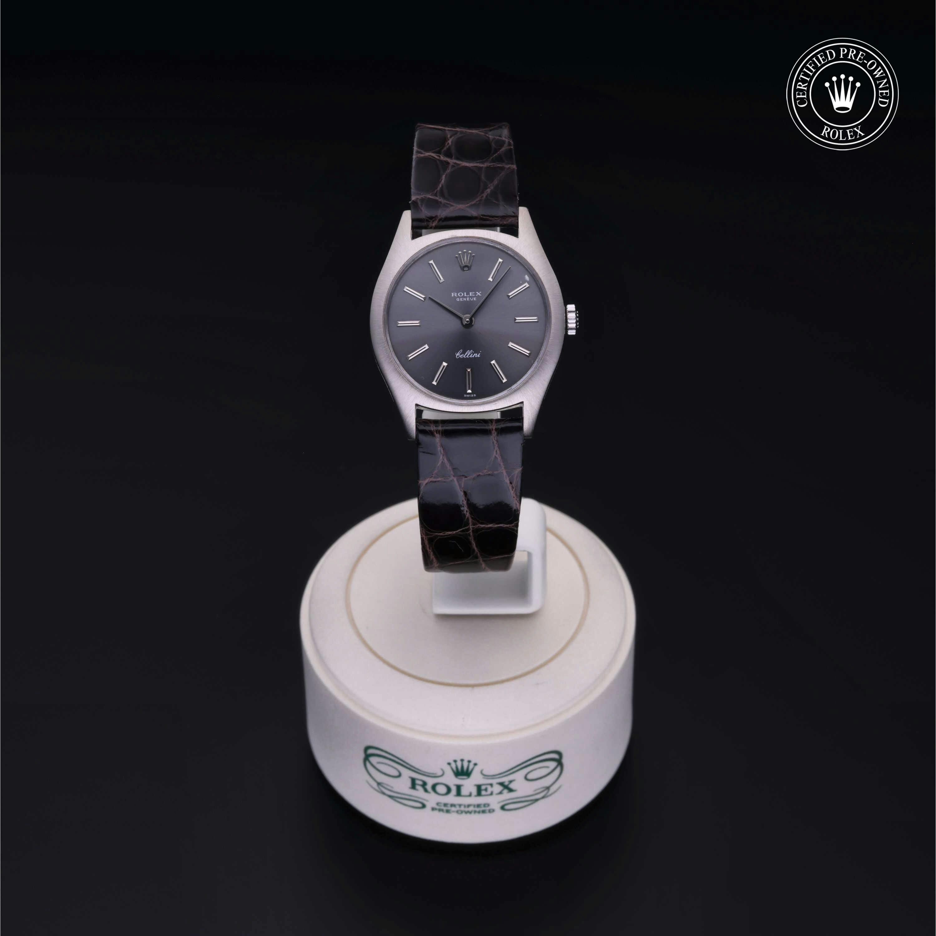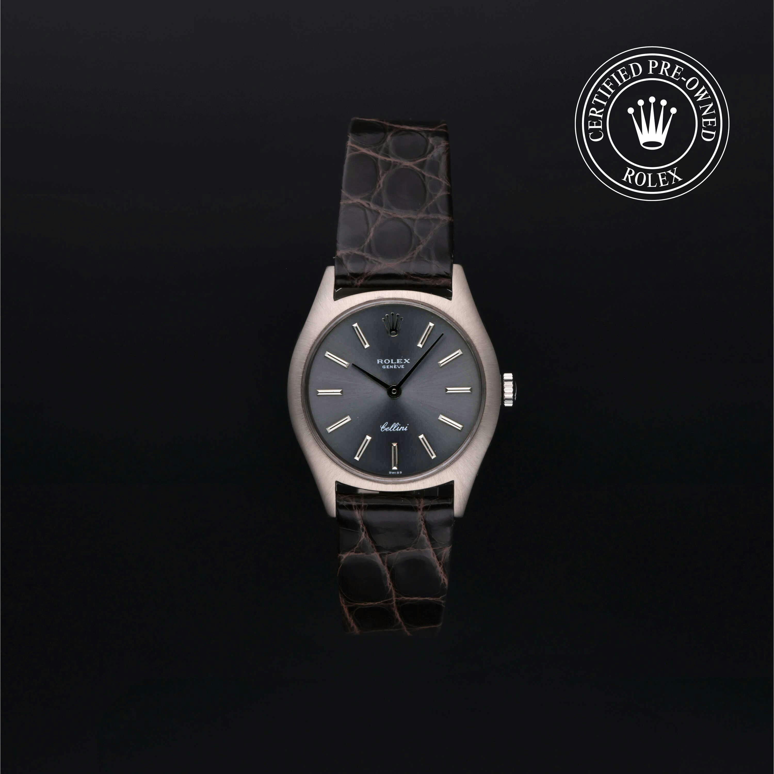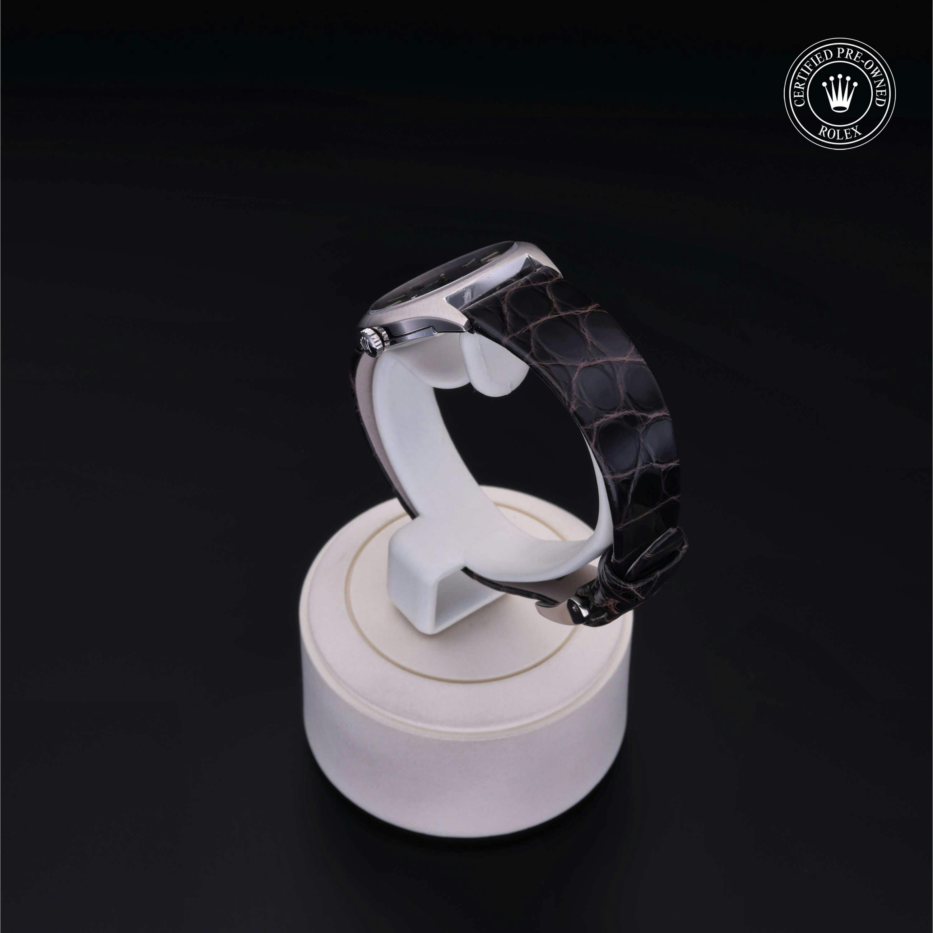 Rolex Certified Pre-Owned Cellini (3800) manual wind watch, features a 26mm 18k white gold case surrounding a slate dial on a gray/brown alligator strap with an 18k white gold tang buckle. Functions include hours, minutes and seconds. This watch has received Rolex-authorized service and certification. It does not come with the original box or papers, but includes a custom Rolex Certified Pre-Owned hang tag, travel pouch and RCPO international warranty card.