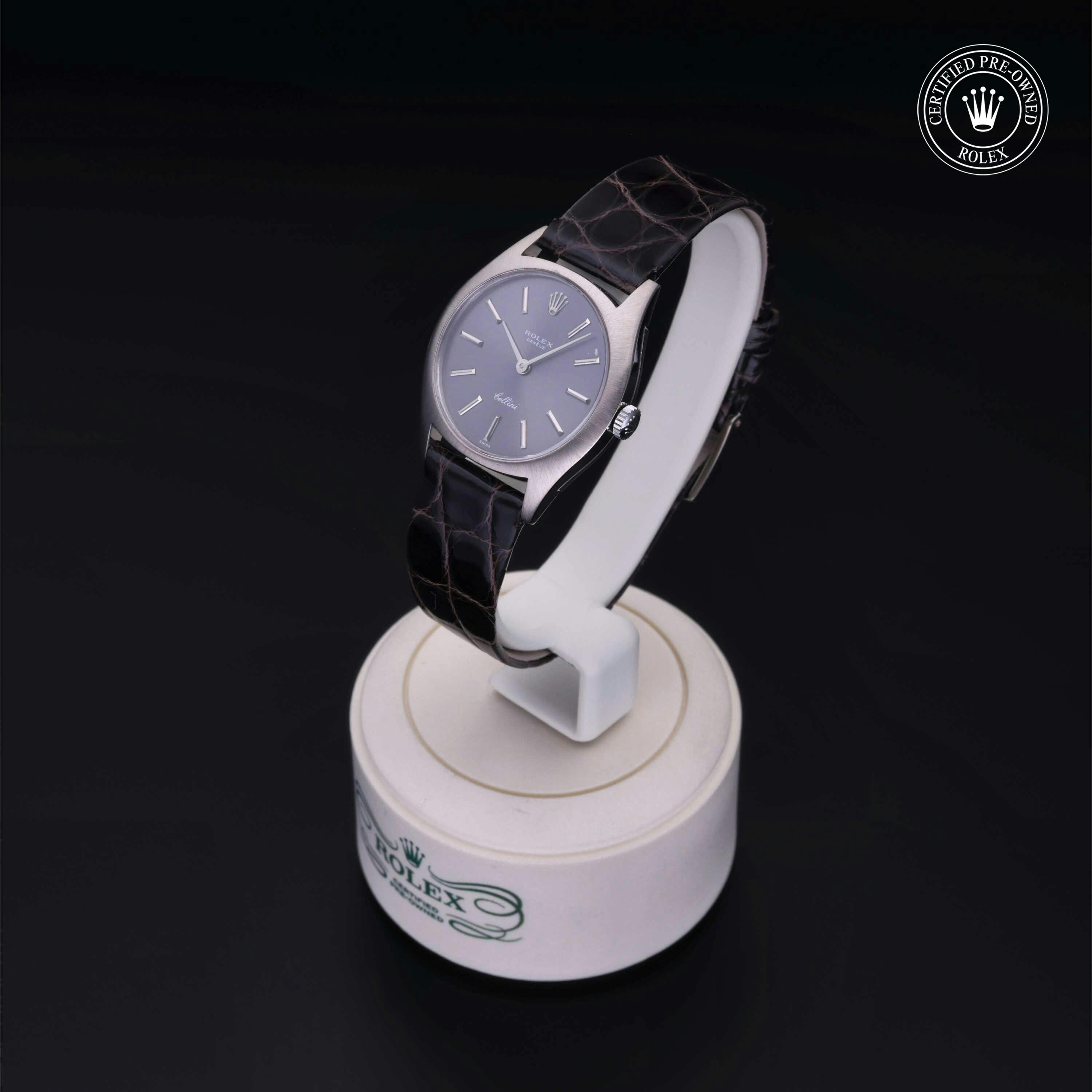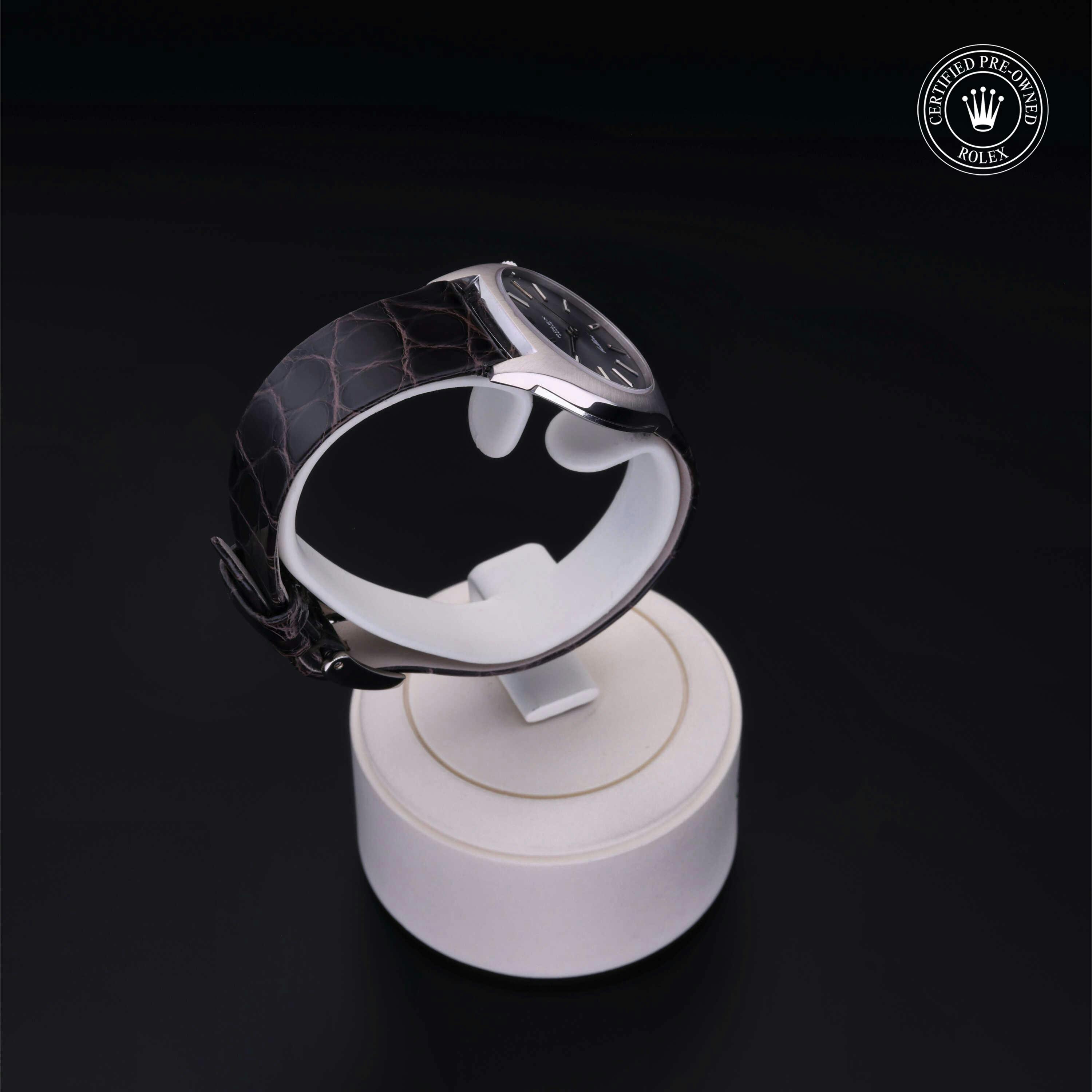 Rolex Certified Pre-Owned Cellini (3800) manual wind watch, features a 26mm 18k white gold case surrounding a slate dial on a gray/brown alligator strap with an 18k white gold tang buckle. Functions include hours, minutes and seconds. This watch has received Rolex-authorized service and certification. It does not come with the original box or papers, but includes a custom Rolex Certified Pre-Owned hang tag, travel pouch and RCPO international warranty card.