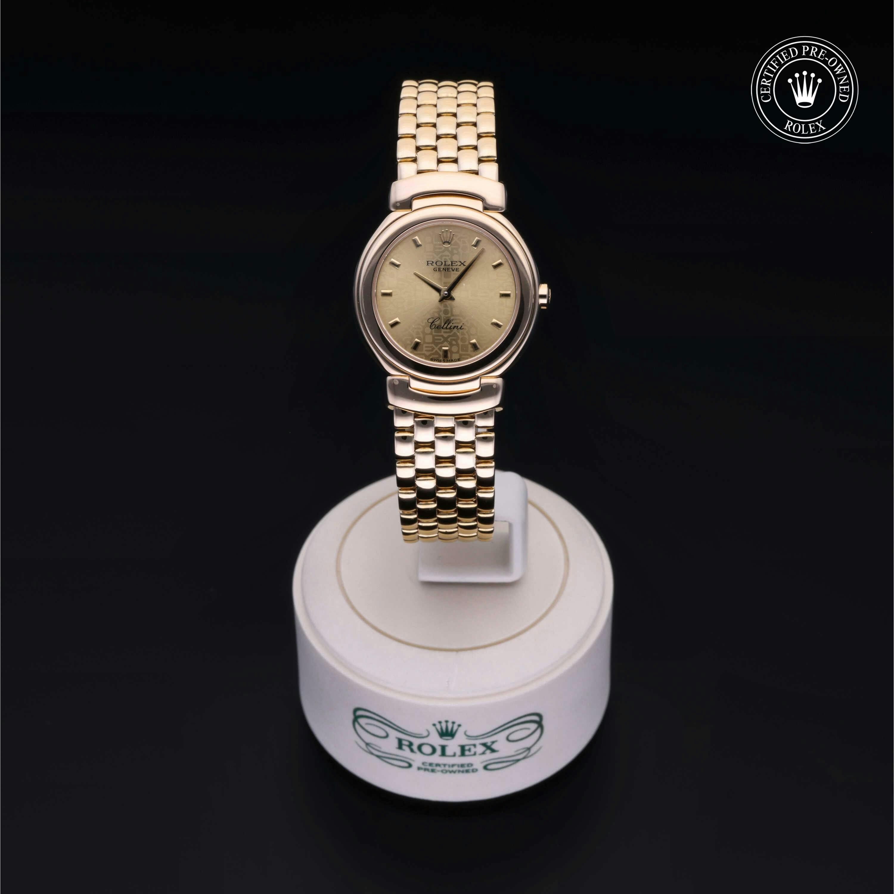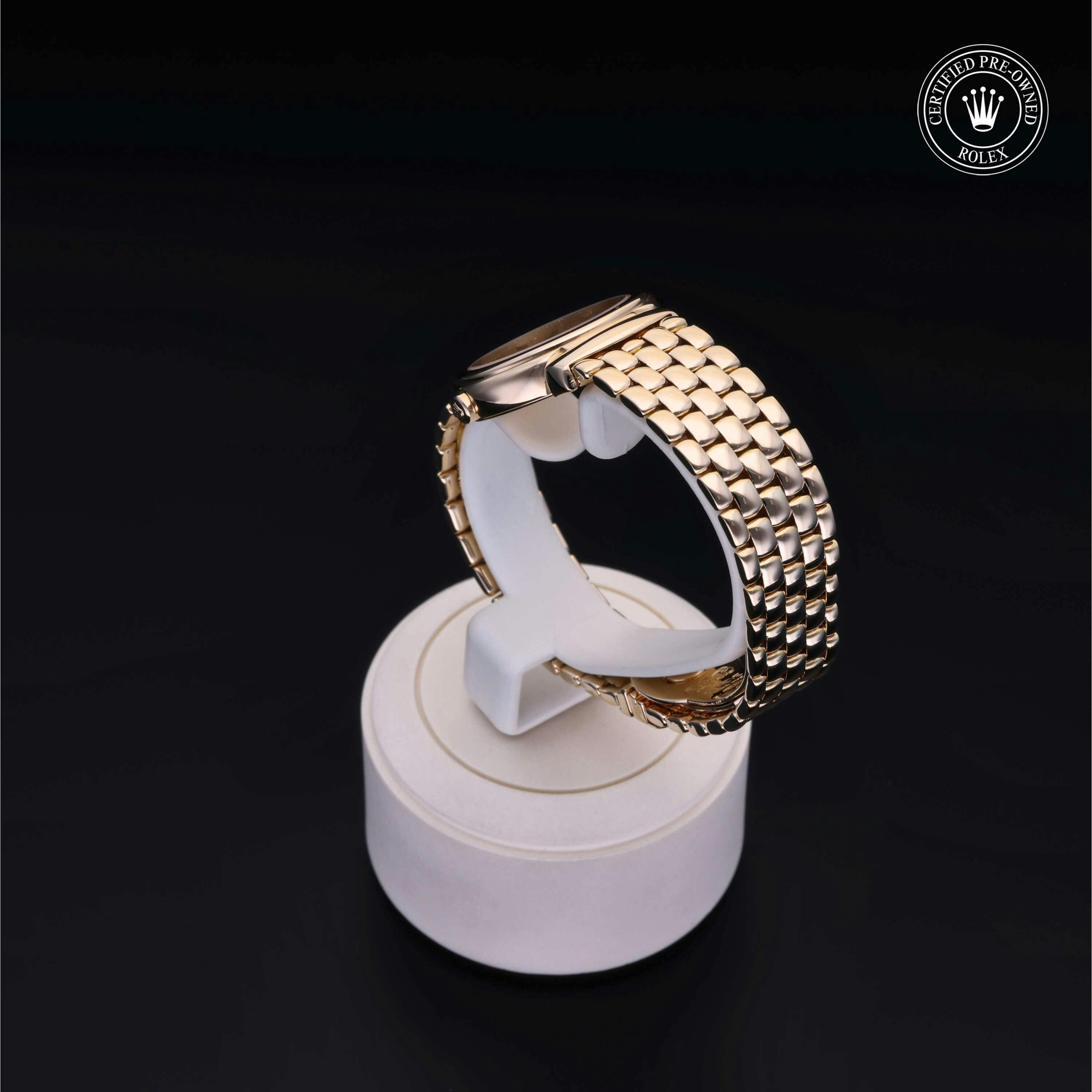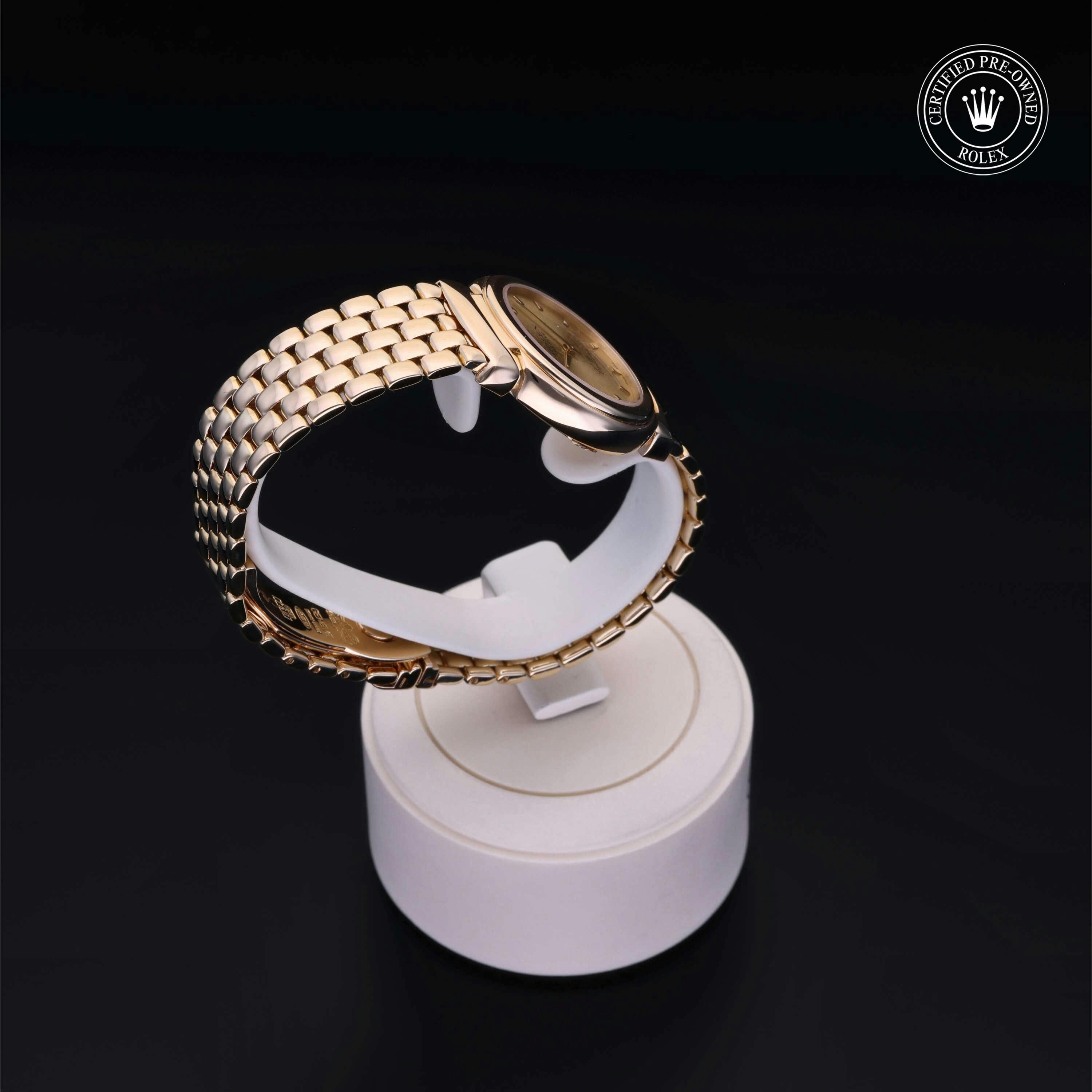 Rolex Certified Pre-Owned Cellini (66218) quartz watch, features a 26mm 18k yellow gold case and smooth bezel surrounding a champagne Jubilee dial on an 18k yellow gold bracelet. Functions include hours and minutes. This watch has received Rolex-authorized service and certification. It does not come with the original box or papers, but includes a custom Rolex Certified Pre-Owned hang tag, travel pouch and RCPO international warranty card.