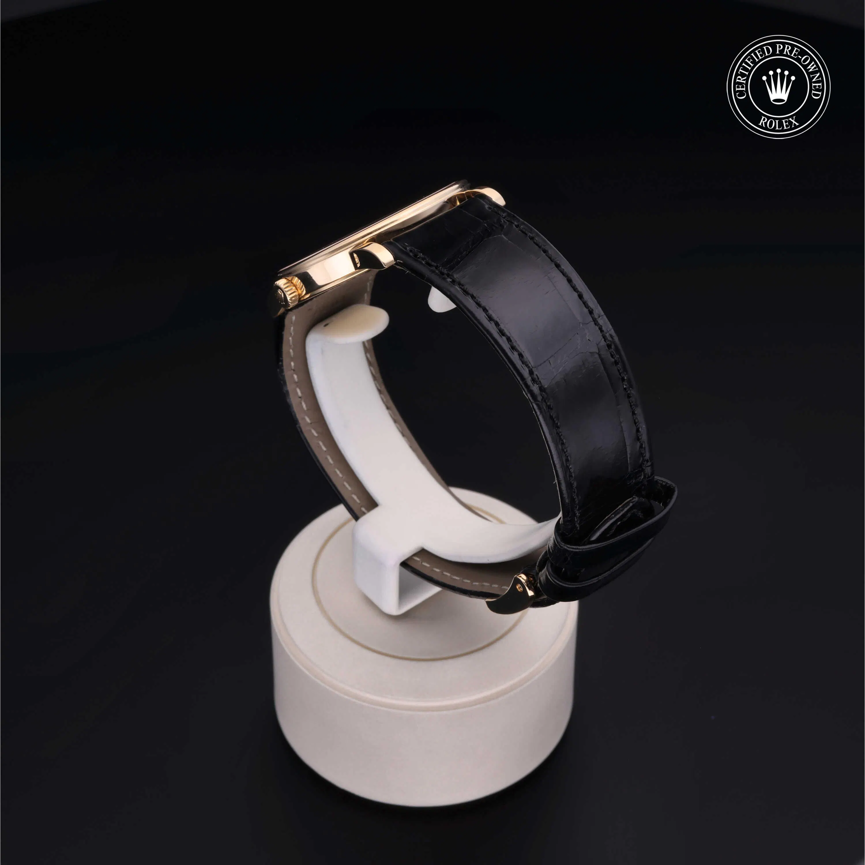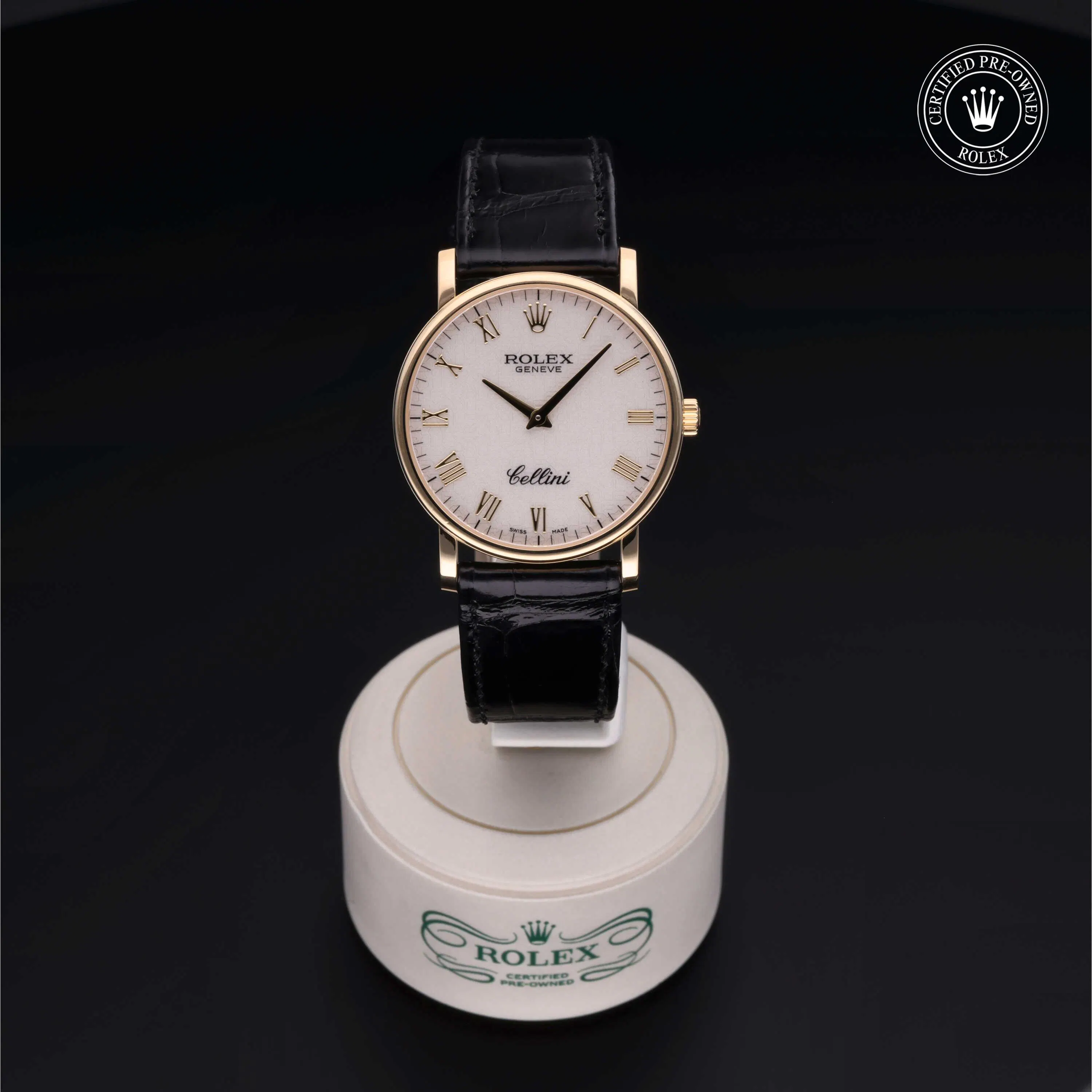 Rolex Certified Pre-Owned Cellini (5115) manual wind watch, features a 32mm 18k yellow gold case surrounding an ivory Jubilee dial on a black alligator strap with an 18k yellow gold tang buckle. Functions include hours and minutes. This watch has received Rolex-authorized service and certification. It does not come with the original box or papers, but includes a custom Rolex Certified Pre-Owned hang tag, travel pouch and RCPO international warranty card.