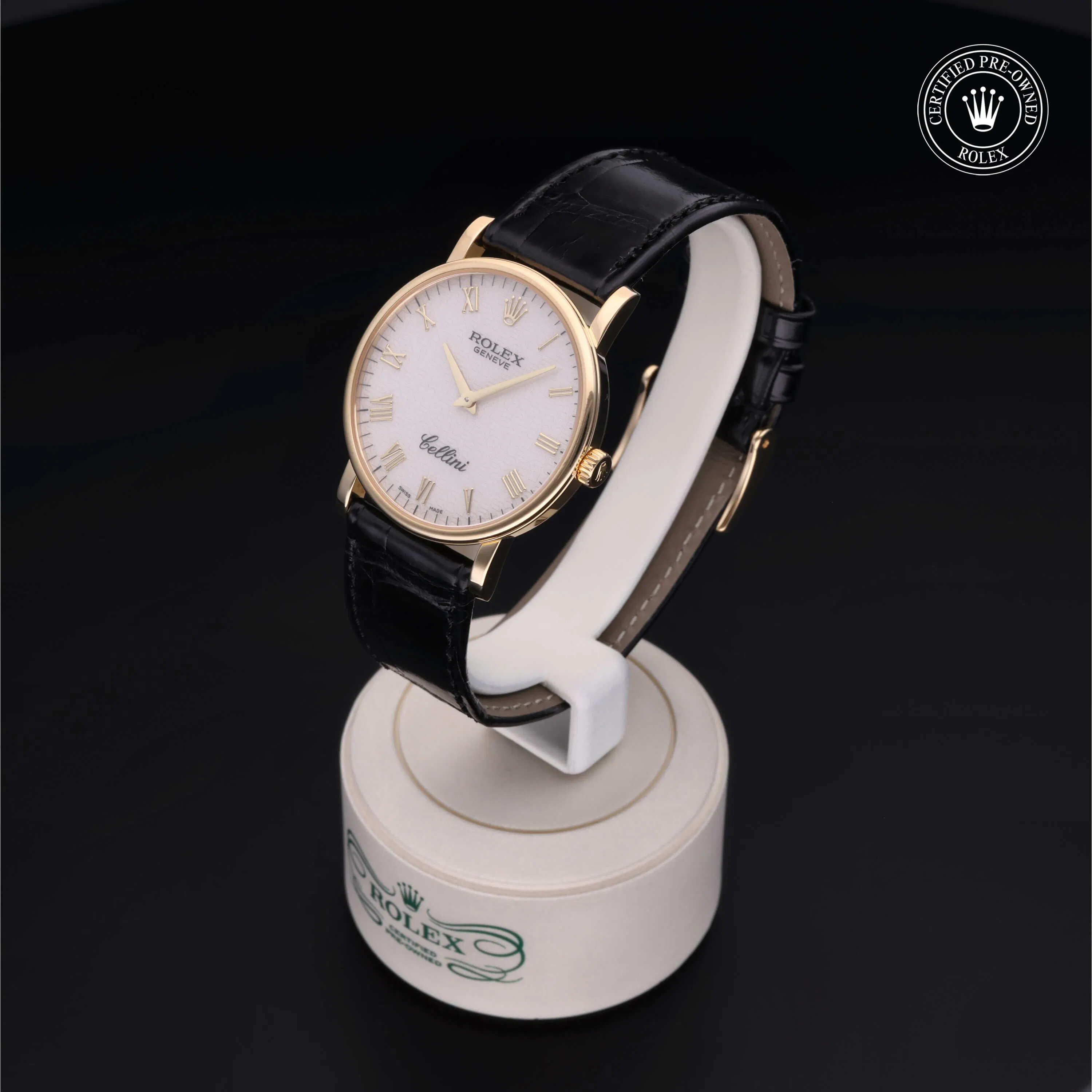 Rolex Certified Pre-Owned Cellini (5115) manual wind watch, features a 32mm 18k yellow gold case surrounding an ivory Jubilee dial on a black alligator strap with an 18k yellow gold tang buckle. Functions include hours and minutes. This watch has received Rolex-authorized service and certification. It does not come with the original box or papers, but includes a custom Rolex Certified Pre-Owned hang tag, travel pouch and RCPO international warranty card.