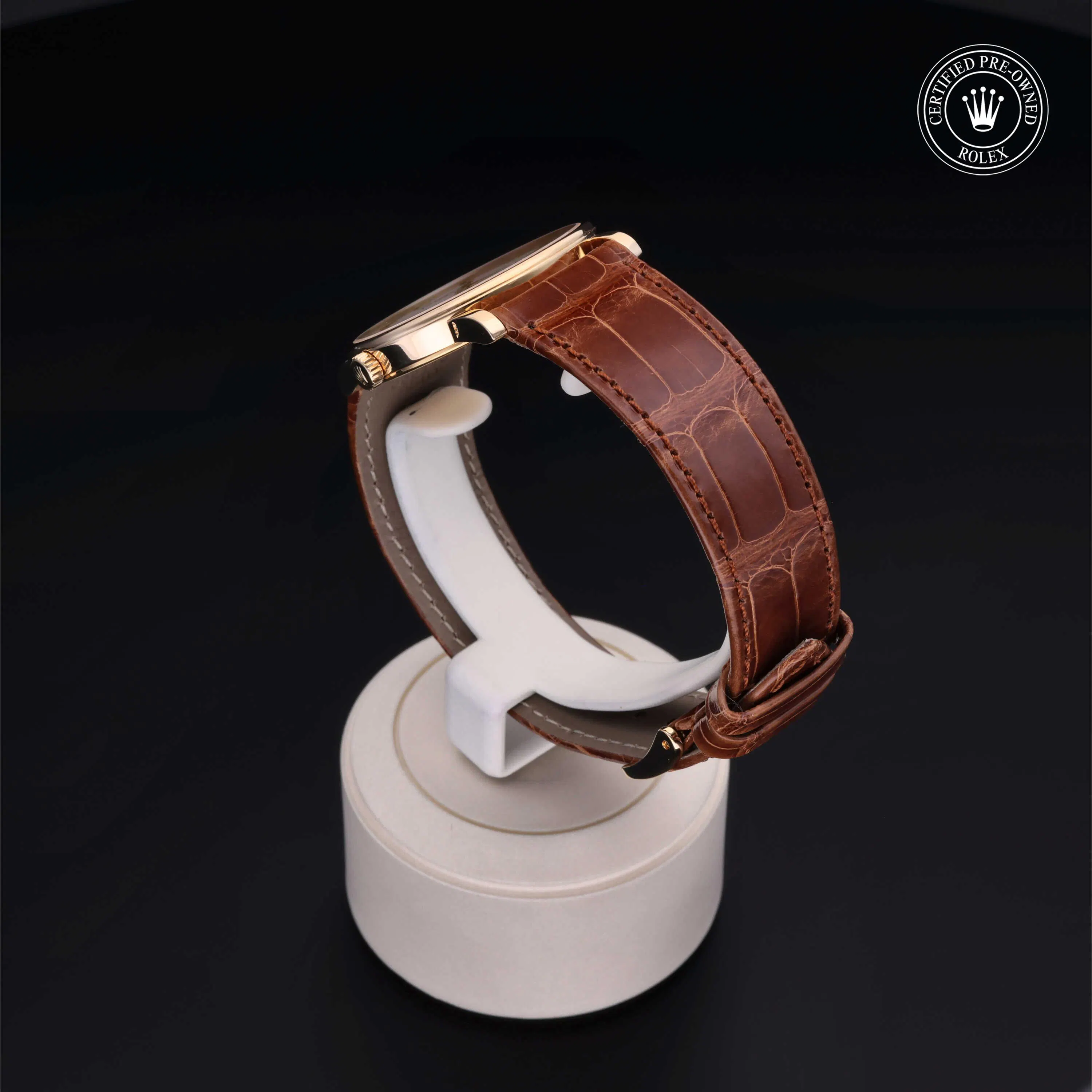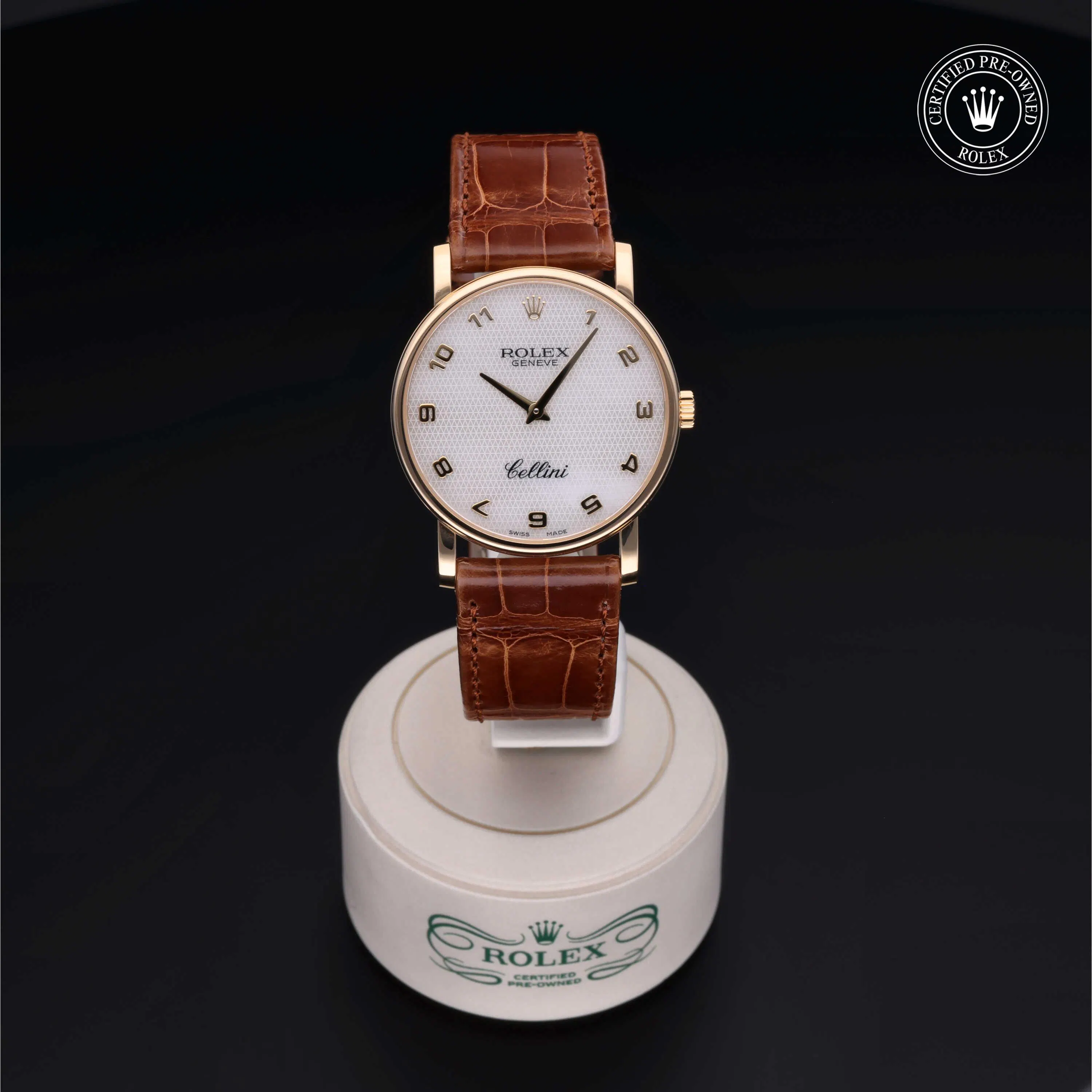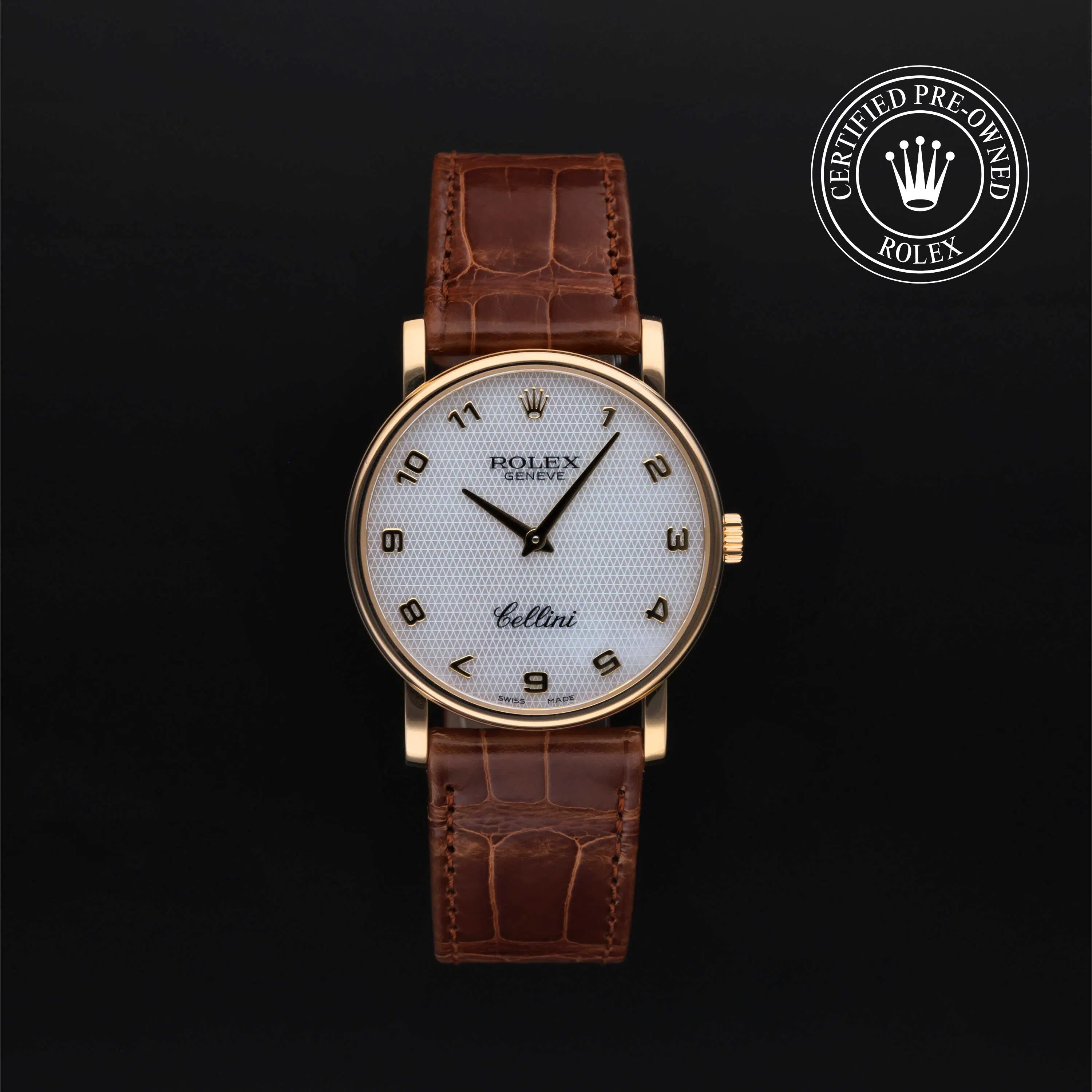 Rolex Certified Pre-Owned Cellini (5115) manual wind watch, features a 32mm 18k yellow gold case surrounding a white decorated, mother of pearl dial on a brown alligator strap with an 18k yellow gold tang buckle. Functions include hours and minutes. This watch has received Rolex-authorized service and certification. It does not come with the original box or papers, but includes a custom Rolex Certified Pre-Owned hang tag, travel pouch and RCPO international warranty card.