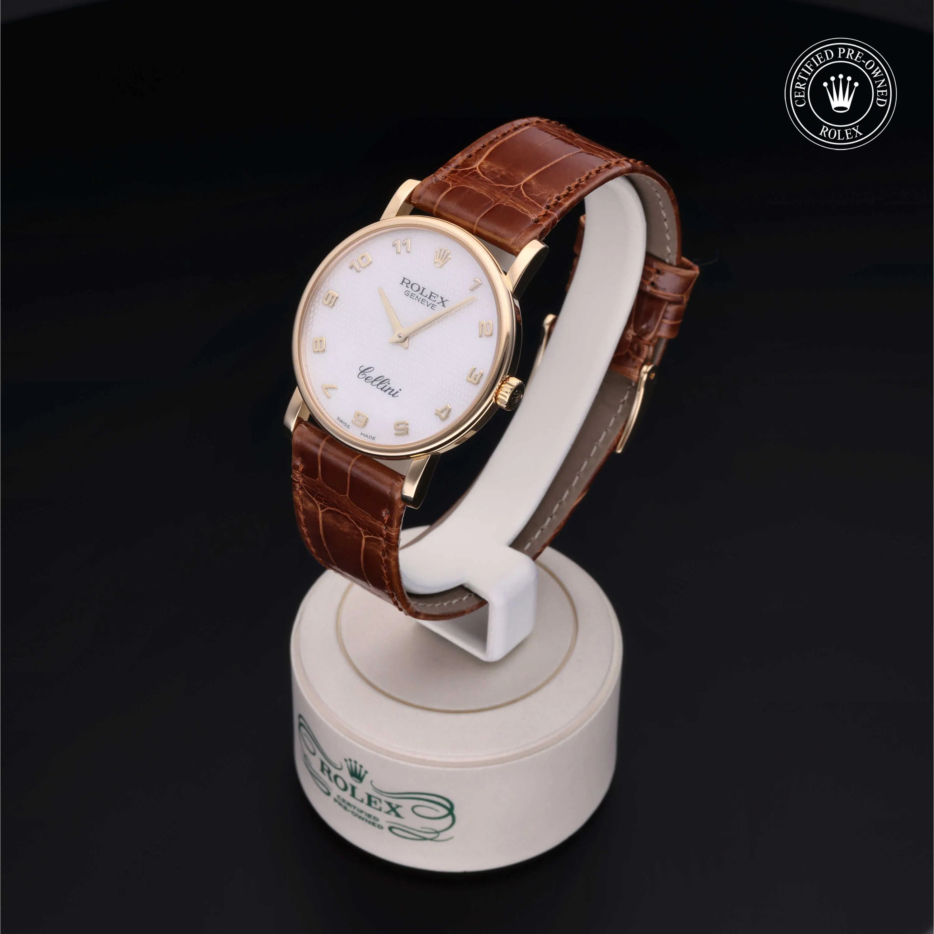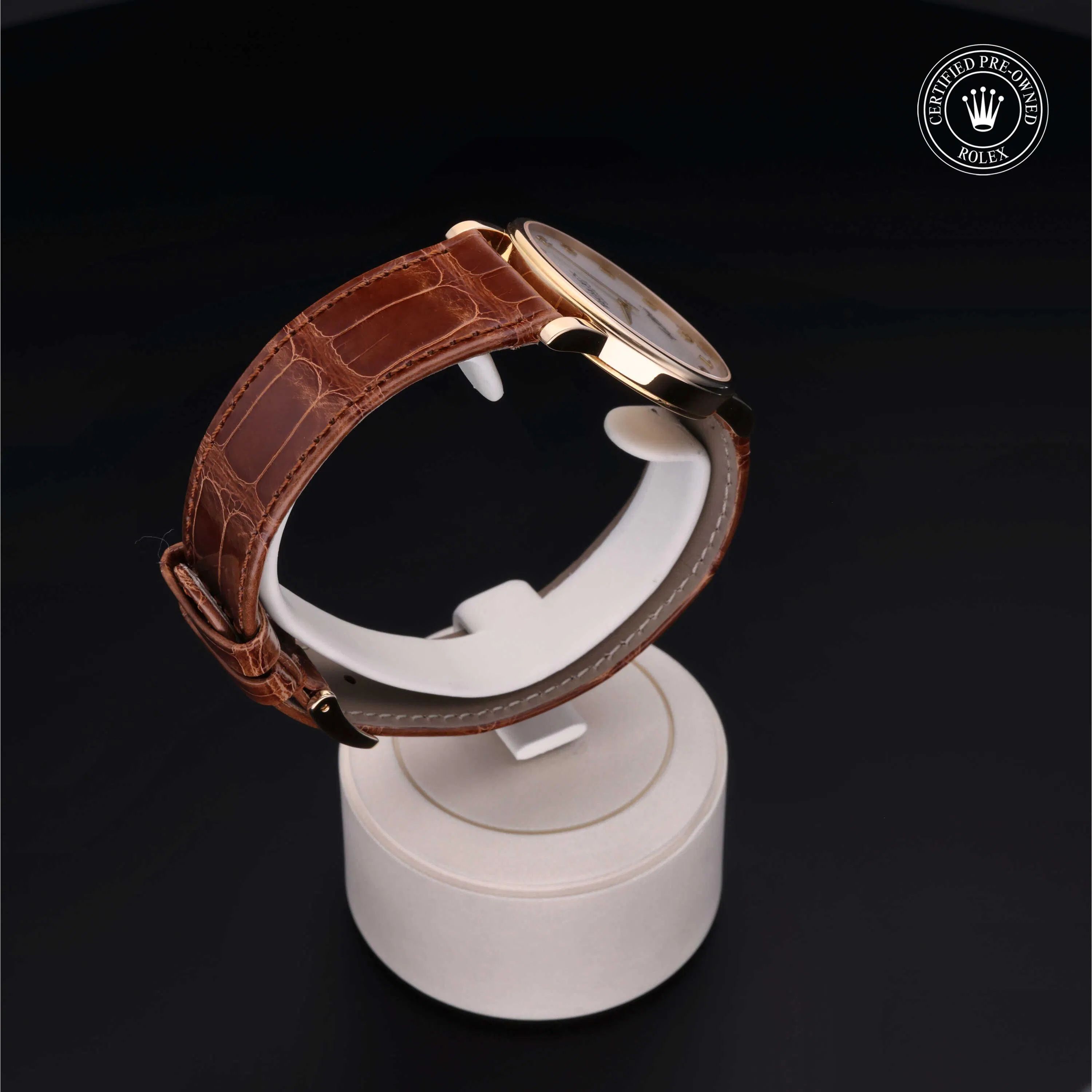 Rolex Certified Pre-Owned Cellini (5115) manual wind watch, features a 32mm 18k yellow gold case surrounding a white decorated, mother of pearl dial on a brown alligator strap with an 18k yellow gold tang buckle. Functions include hours and minutes. This watch has received Rolex-authorized service and certification. It does not come with the original box or papers, but includes a custom Rolex Certified Pre-Owned hang tag, travel pouch and RCPO international warranty card.