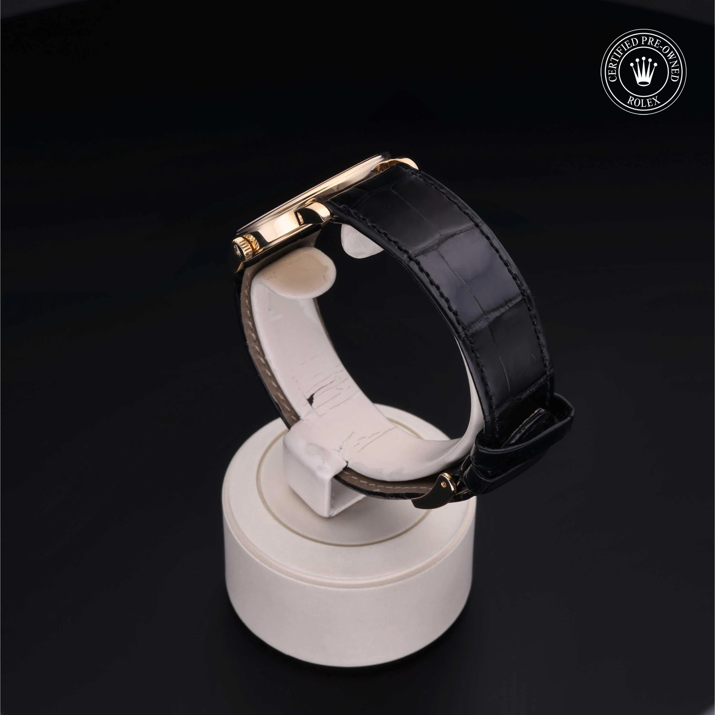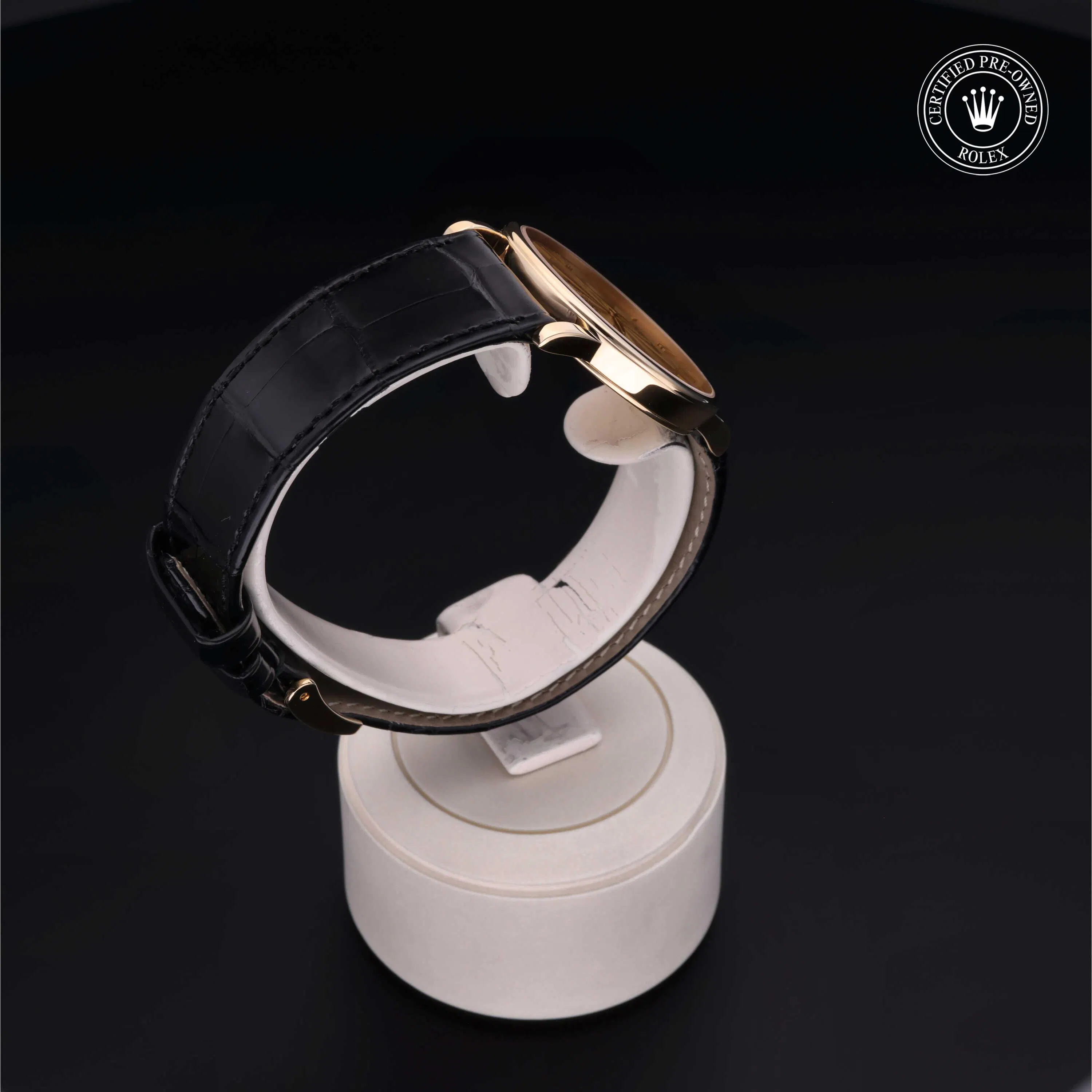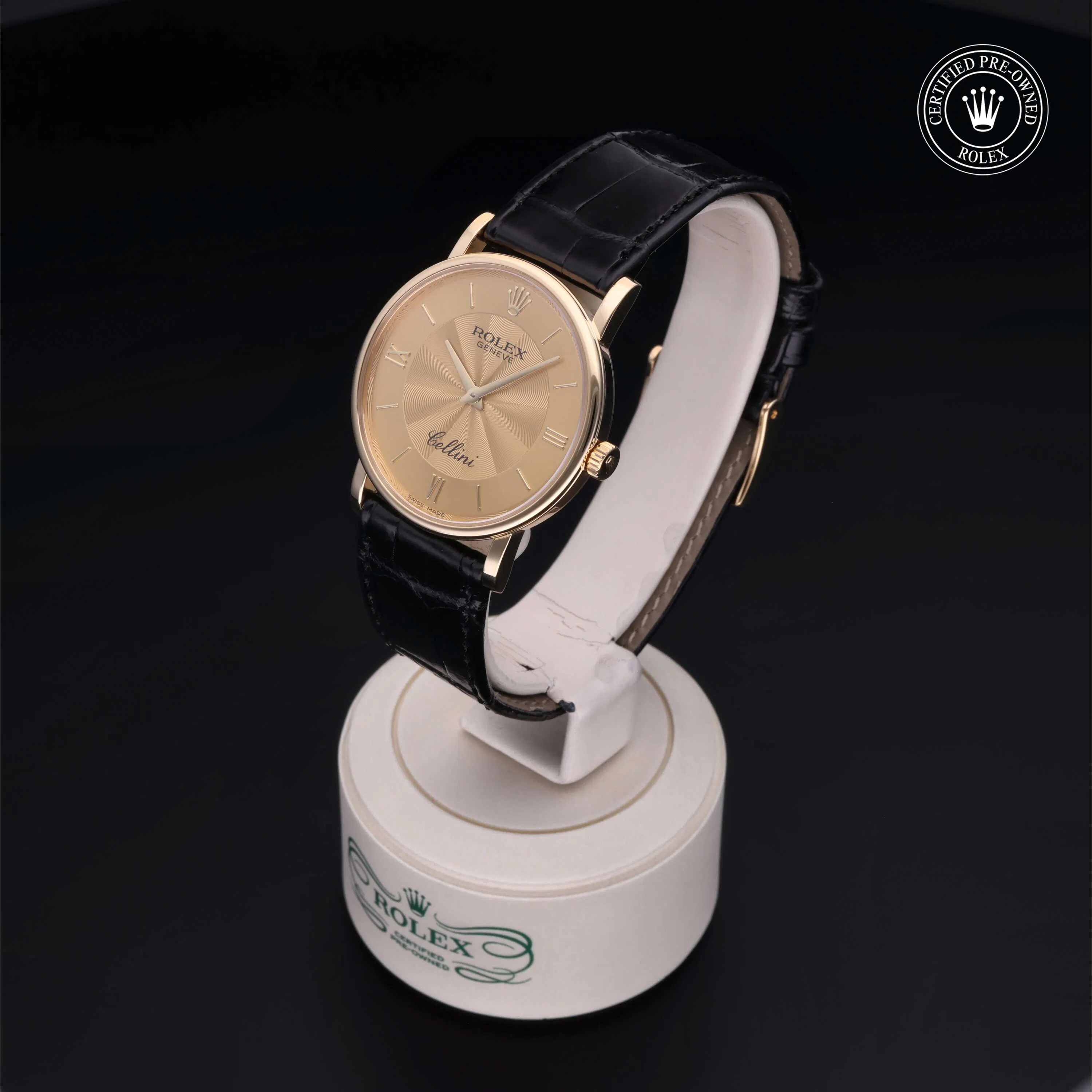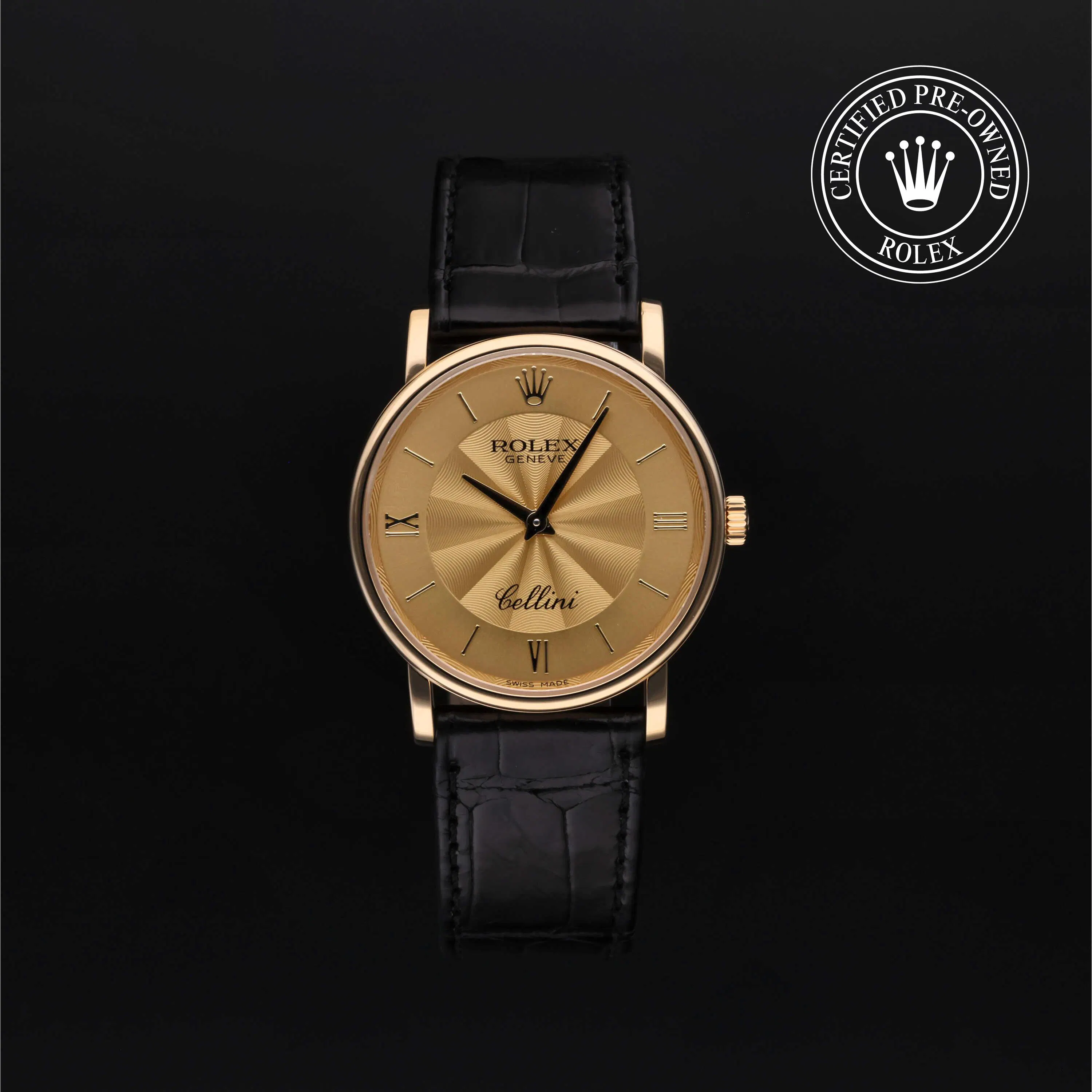 Rolex Certified Pre-Owned Cellini (5115) manual wind watch, features a 31mm 18k yellow gold case surrounding a champagne dial on a black alligator strap with an 18k yellow gold tang buckle. Functions include hours and minutes. This watch has received Rolex-authorized service and certification. It does not come with the original box or papers, but includes a custom Rolex Certified Pre-Owned hang tag, travel pouch and RCPO international warranty card.