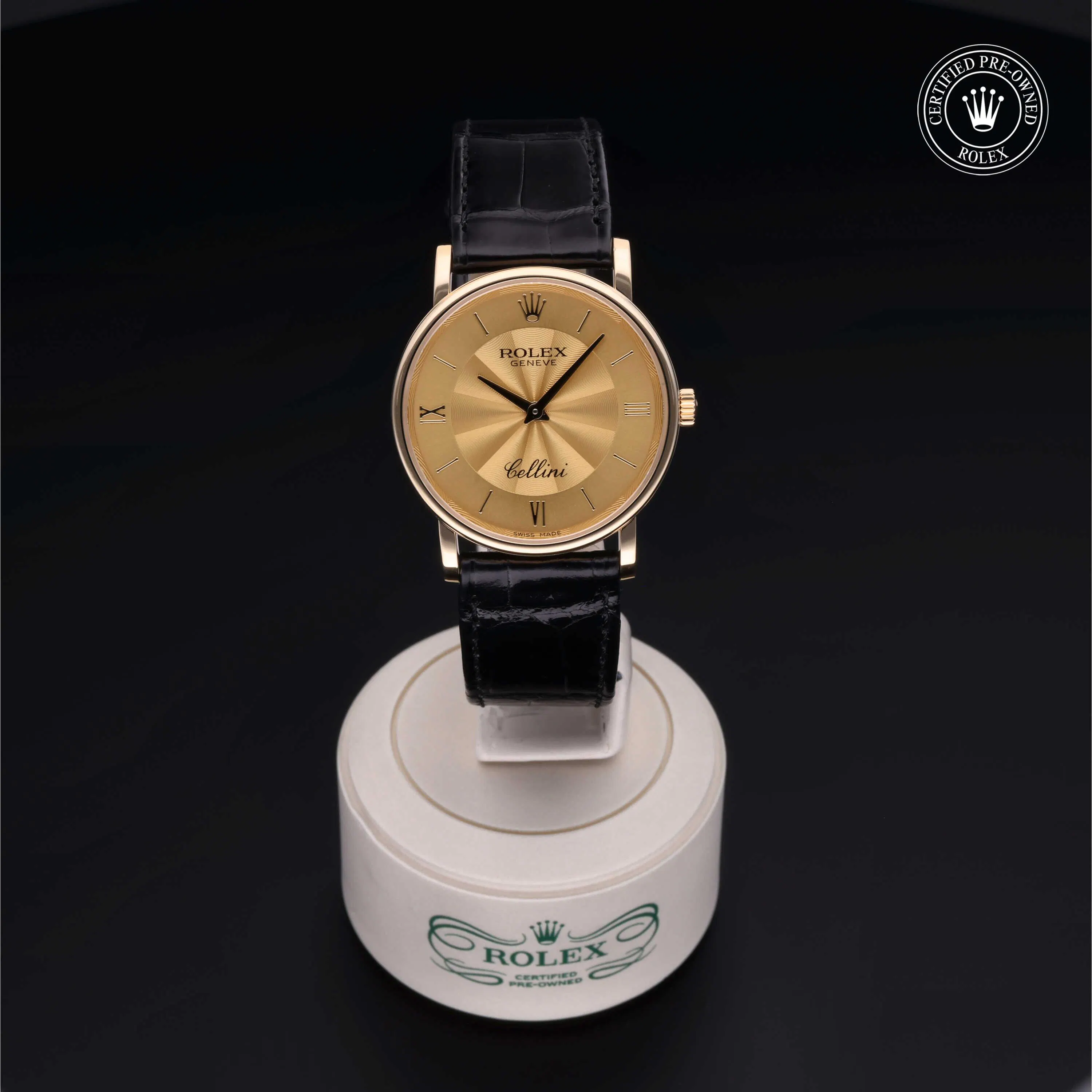 Rolex Certified Pre-Owned Cellini (5115) manual wind watch, features a 31mm 18k yellow gold case surrounding a champagne dial on a black alligator strap with an 18k yellow gold tang buckle. Functions include hours and minutes. This watch has received Rolex-authorized service and certification. It does not come with the original box or papers, but includes a custom Rolex Certified Pre-Owned hang tag, travel pouch and RCPO international warranty card.