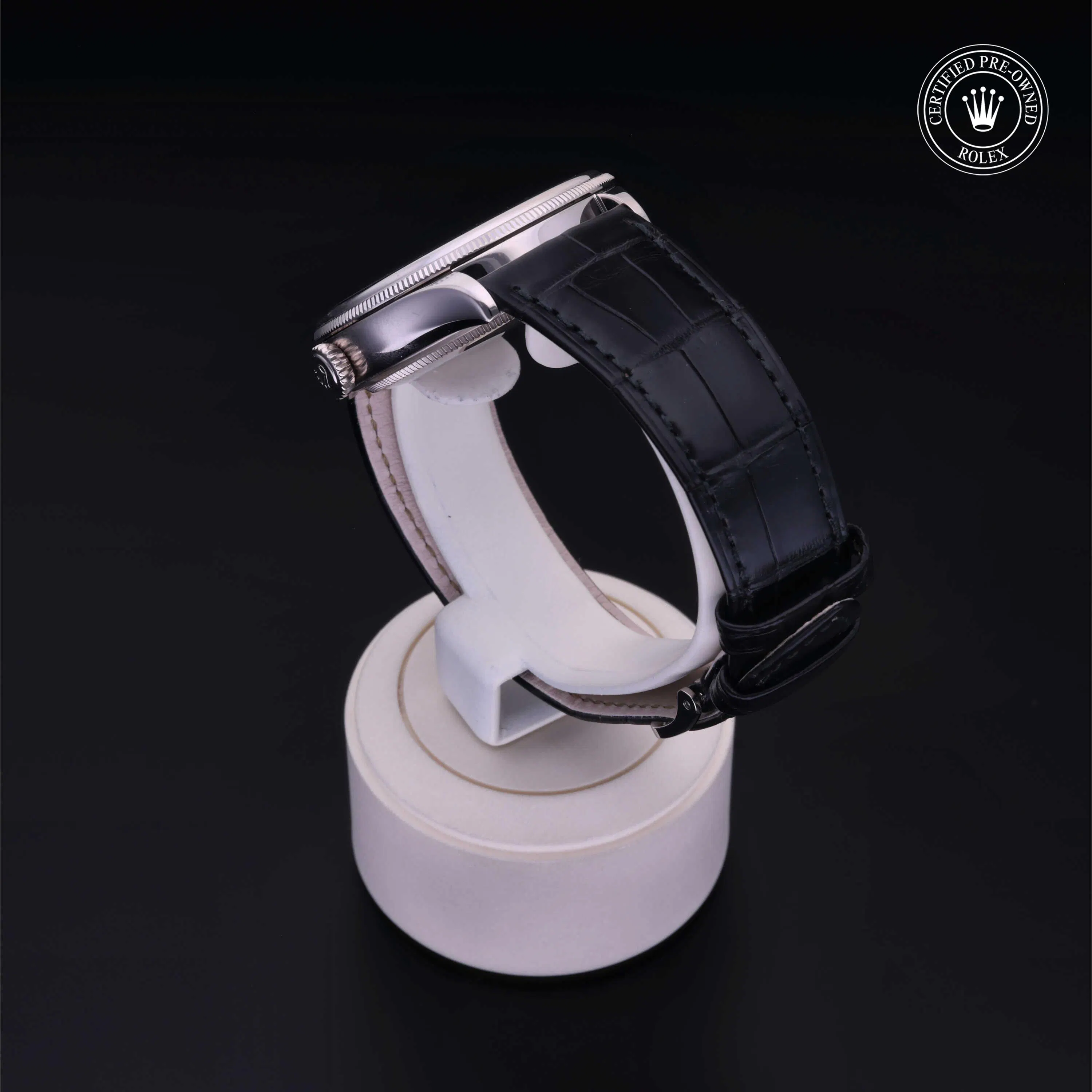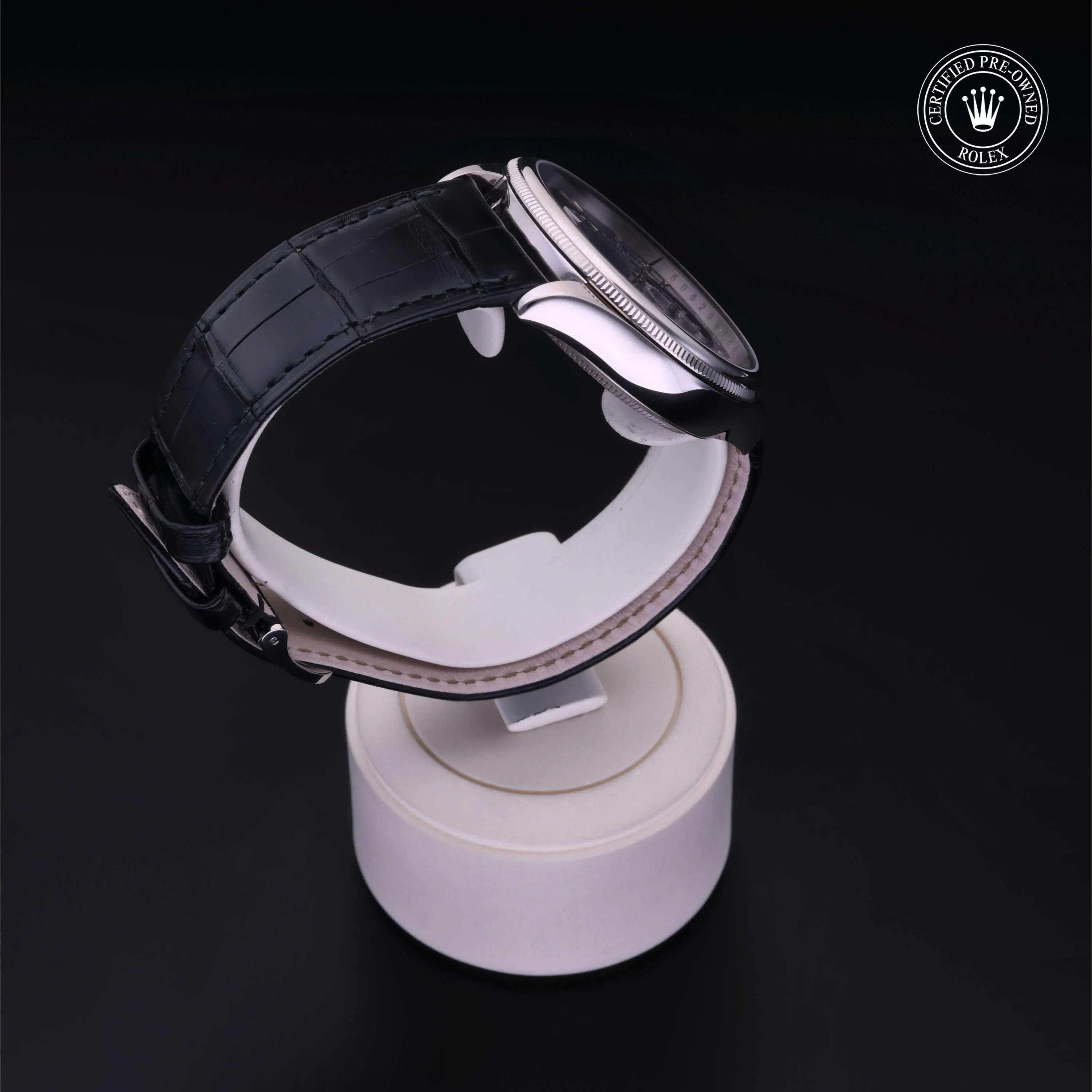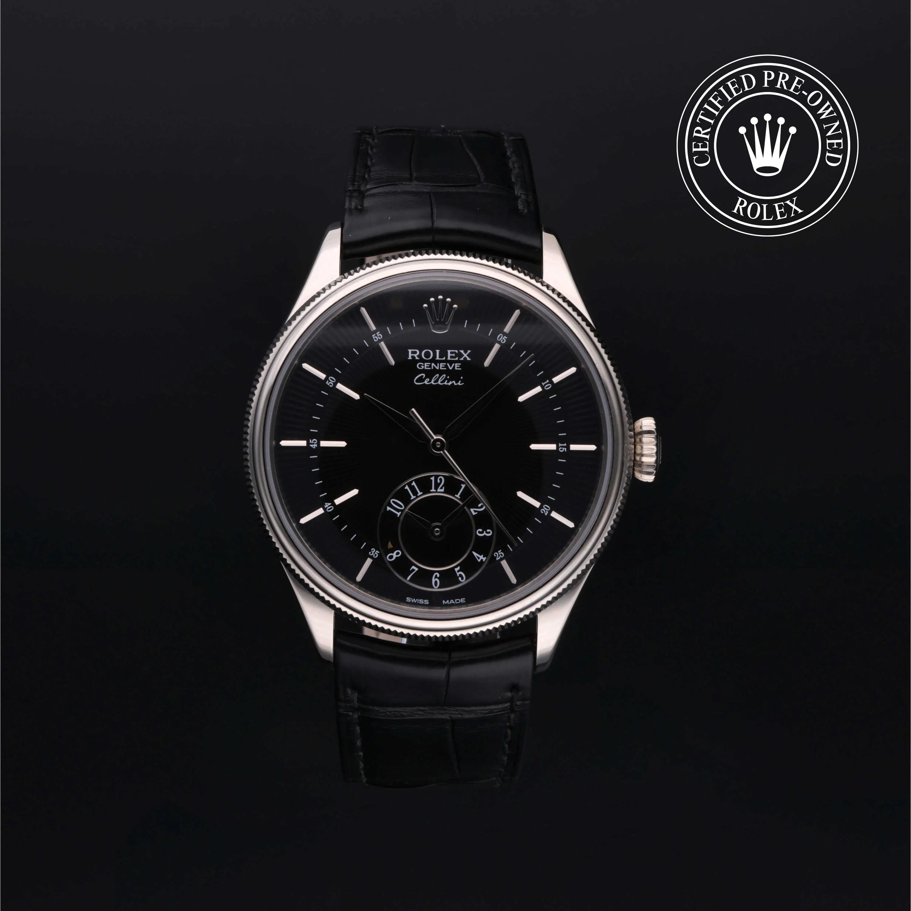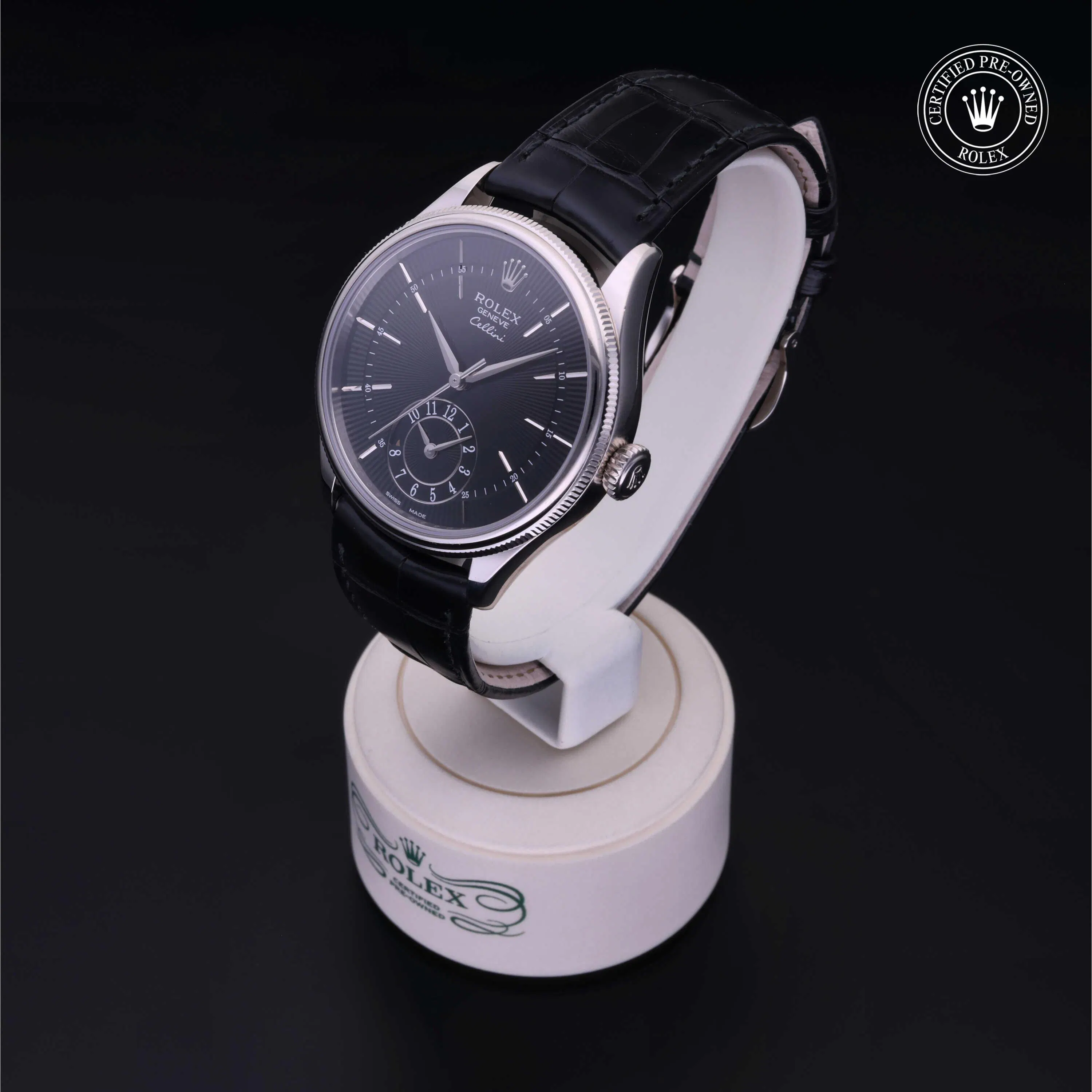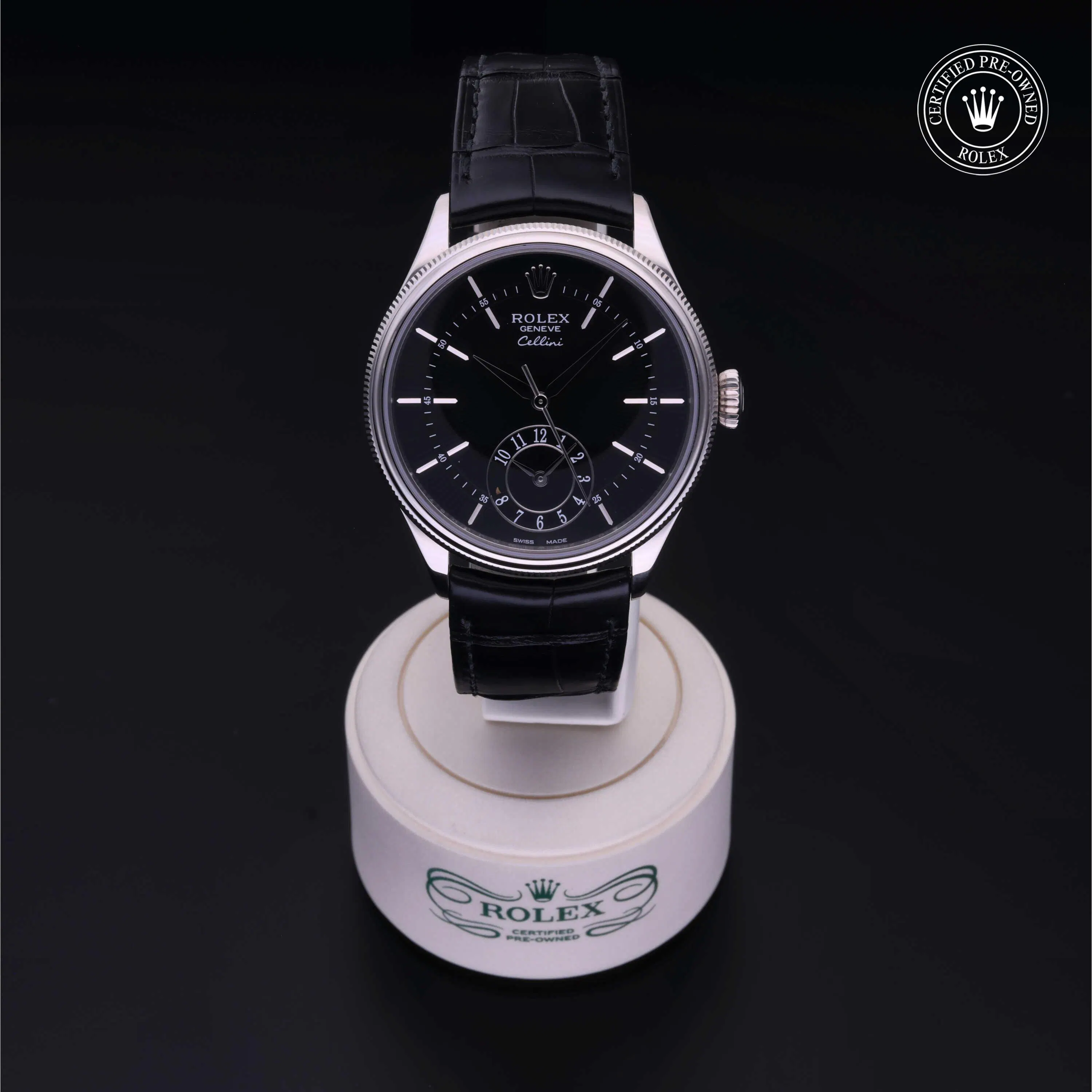 Rolex Certified Pre-Owned Cellini Dual Time (50529) self - winding automatic watch, features a 39mm 18k white gold case surrounding a black guilloche dial on a black alligator strap with an 18k white gold tang buckle. Functions include hours, minutes, seconds, day/night indicator and gmt/world time. This watch has received Rolex-authorized service and certification. It comes with the original papers, and includes a custom Rolex Certified Pre-Owned hang tag, travel pouch and RCPO international warranty card.