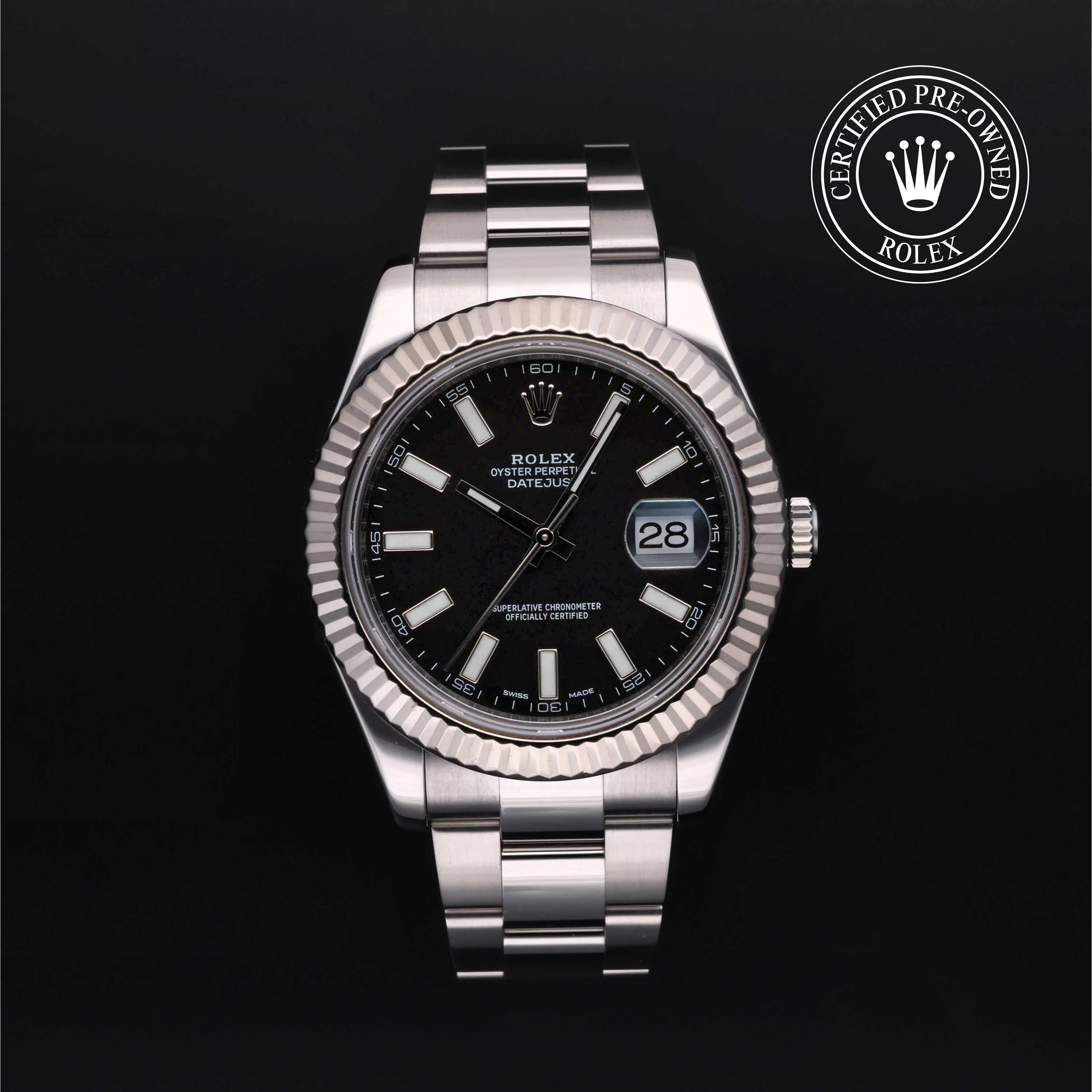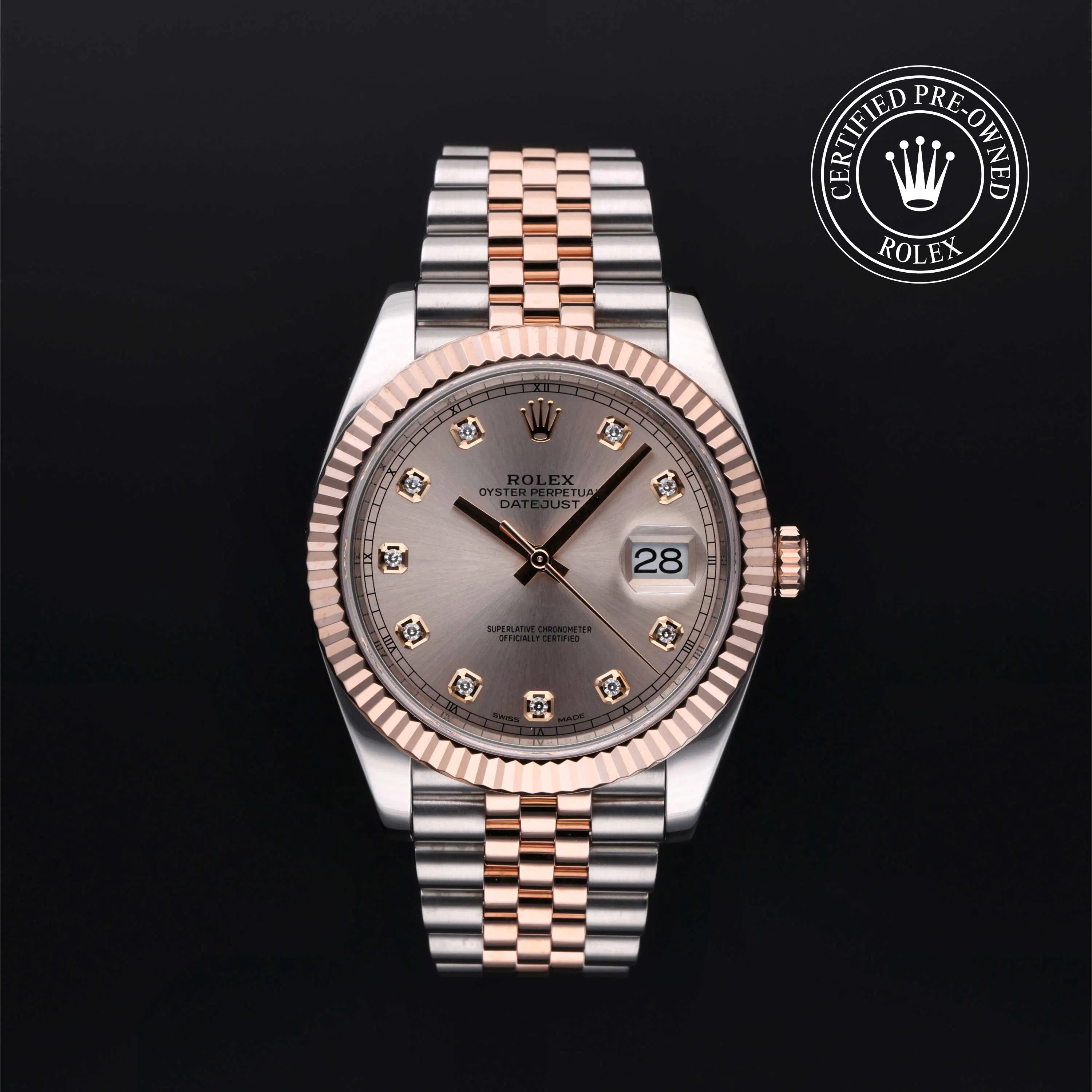 The Oyster Perpetual Datejust 41 reference 126334 measures 41mm and features an Oystersteel case with an 18k white gold fluted bezel. Some models include mother-of-pearl dials with diamond hour markers, while others showcase more minimal sunburst finishes. All are highly desirable in any pre-owned Rolex Datejust 41 collection.