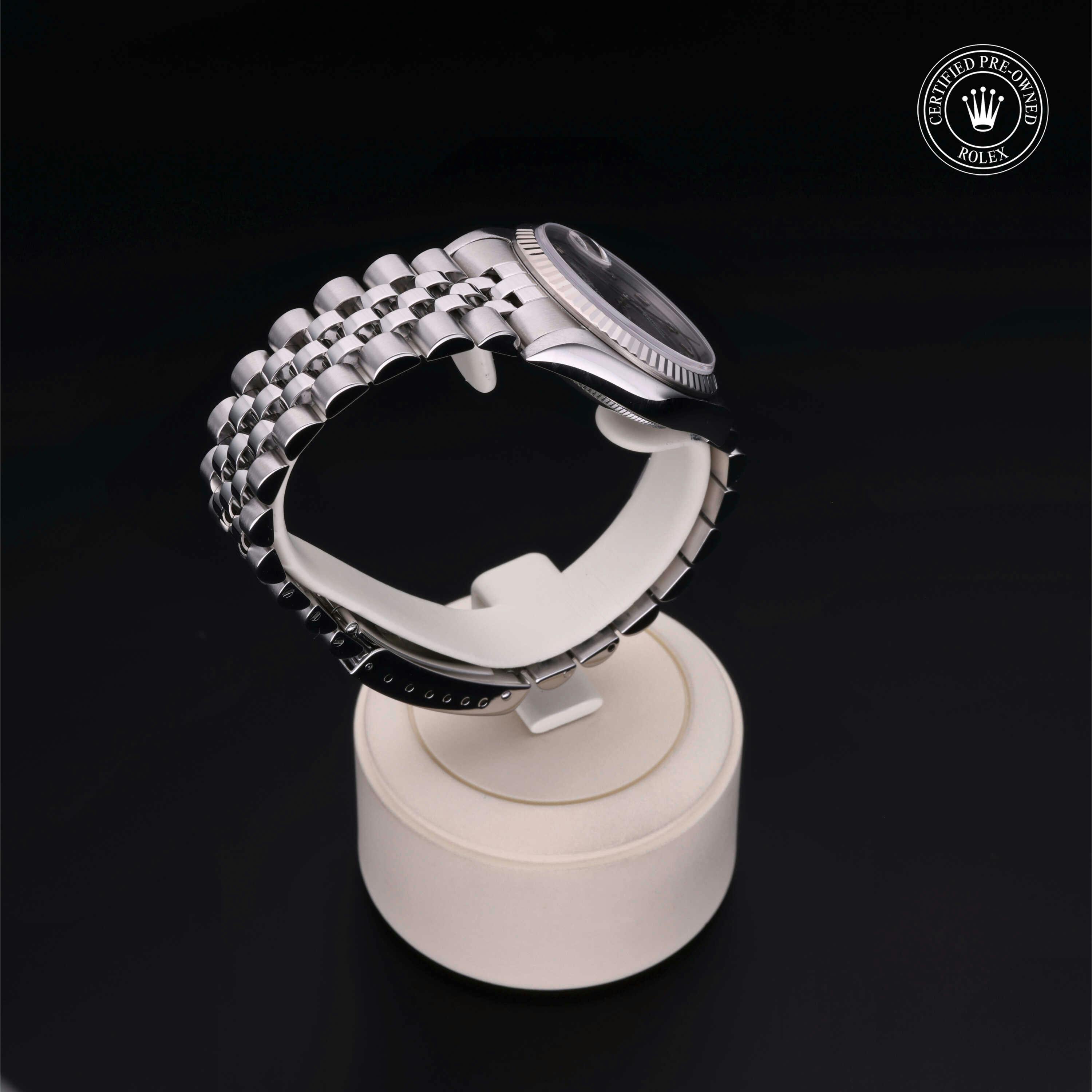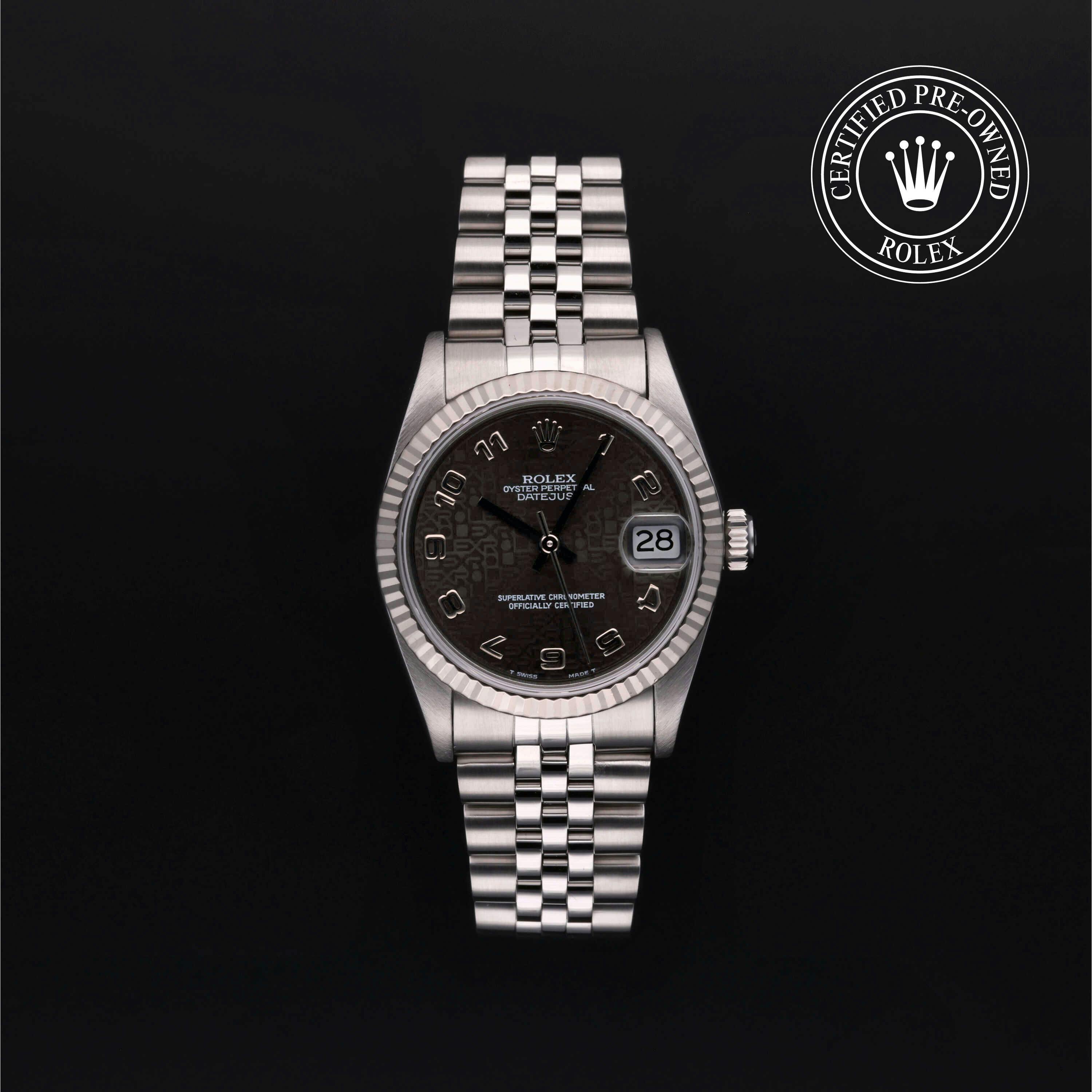 Rolex Certified Pre-Owned Datejust (68274) self-winding automatic watch, features a 31mm stainless steel case with an 18k white gold fluted bezel surrounding a slate Jubilee dial on a stainless steel jubilee bracelet. Functions include hours, minutes, seconds and date. This watch has received Rolex-authorized service and certification. It does not come with the original box or papers, but includes a custom Rolex Certified Pre-Owned hang tag, travel pouch and RCPO international warranty card.