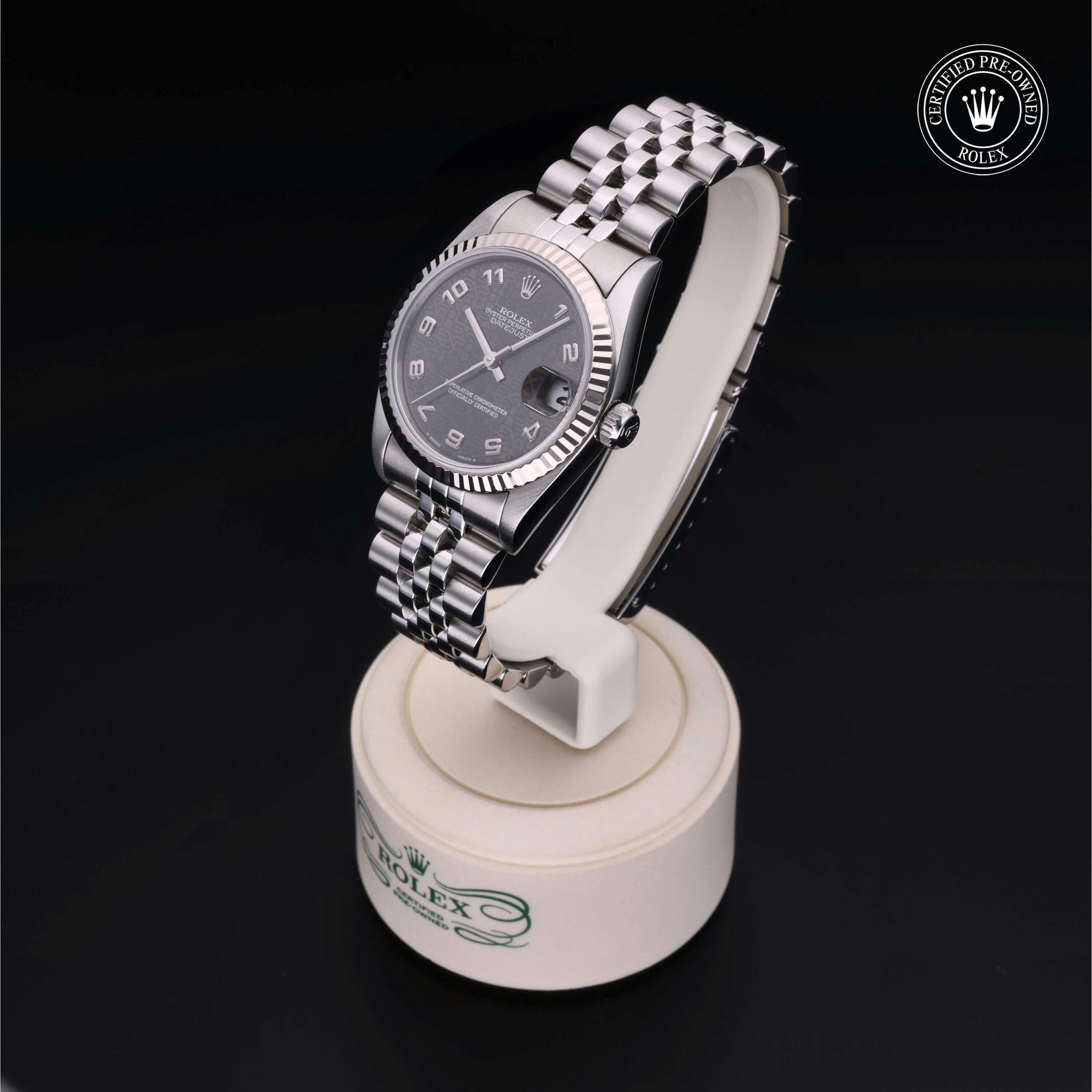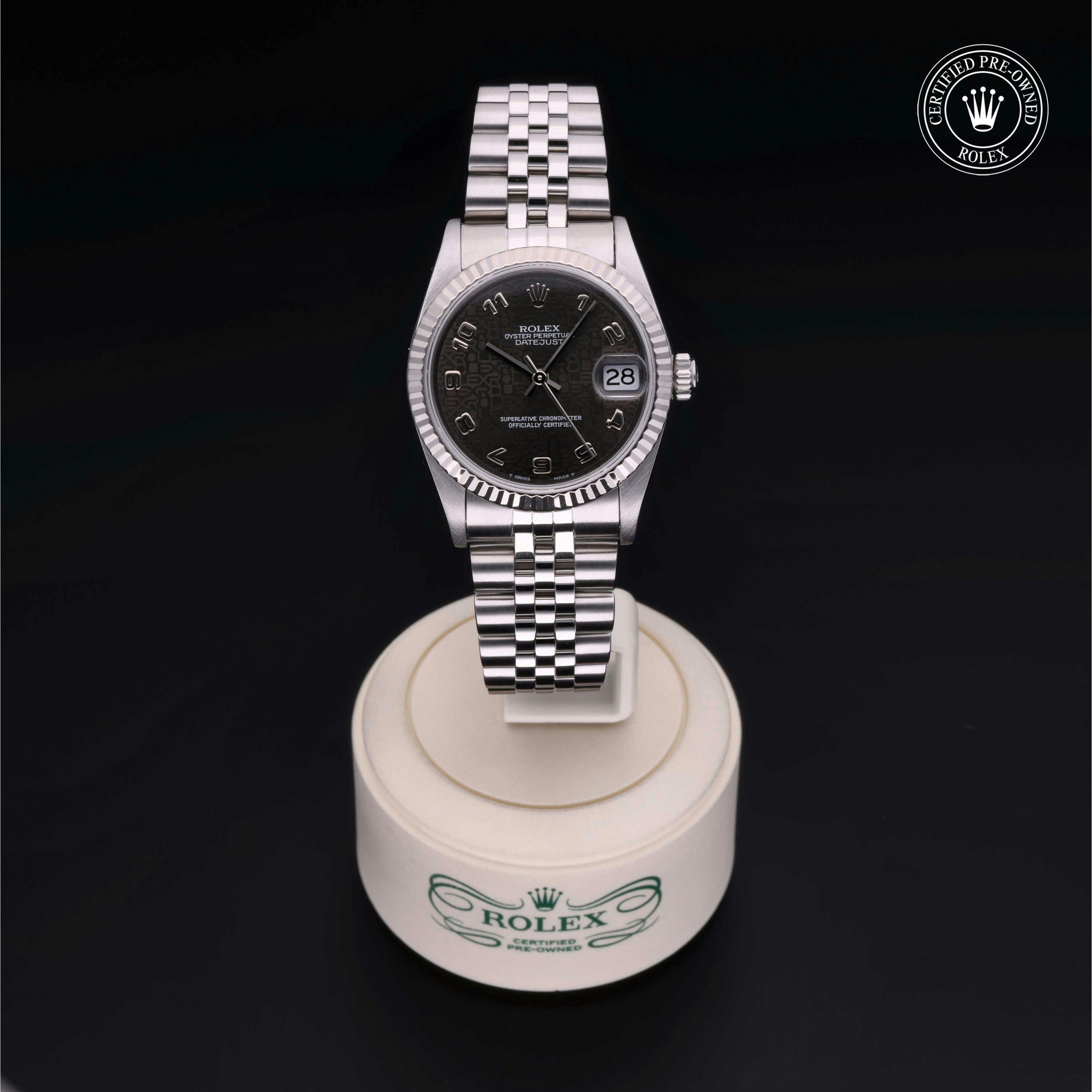 Rolex Certified Pre-Owned Datejust (68274) self-winding automatic watch, features a 31mm stainless steel case with an 18k white gold fluted bezel surrounding a slate Jubilee dial on a stainless steel jubilee bracelet. Functions include hours, minutes, seconds and date. This watch has received Rolex-authorized service and certification. It does not come with the original box or papers, but includes a custom Rolex Certified Pre-Owned hang tag, travel pouch and RCPO international warranty card.