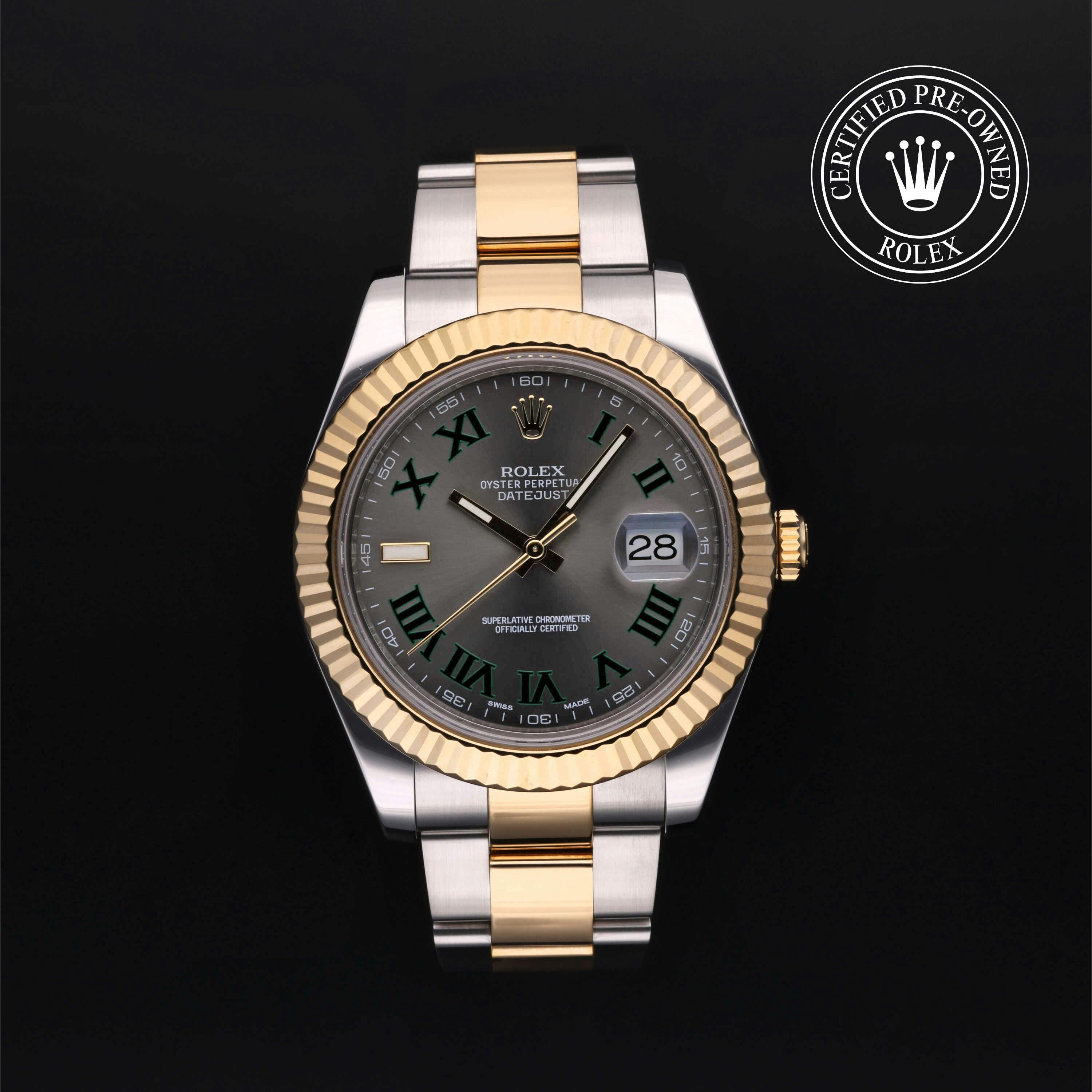 The two-tone Rolex Datejust reference 126301 features a 41mm Rolesor case in Oystersteel and Everose gold. The green Roman numerals on its slate gray dial have earned this version the nickname "Wimbledon dial", a nod to its grass-green detailing reminiscent of tennis courts.