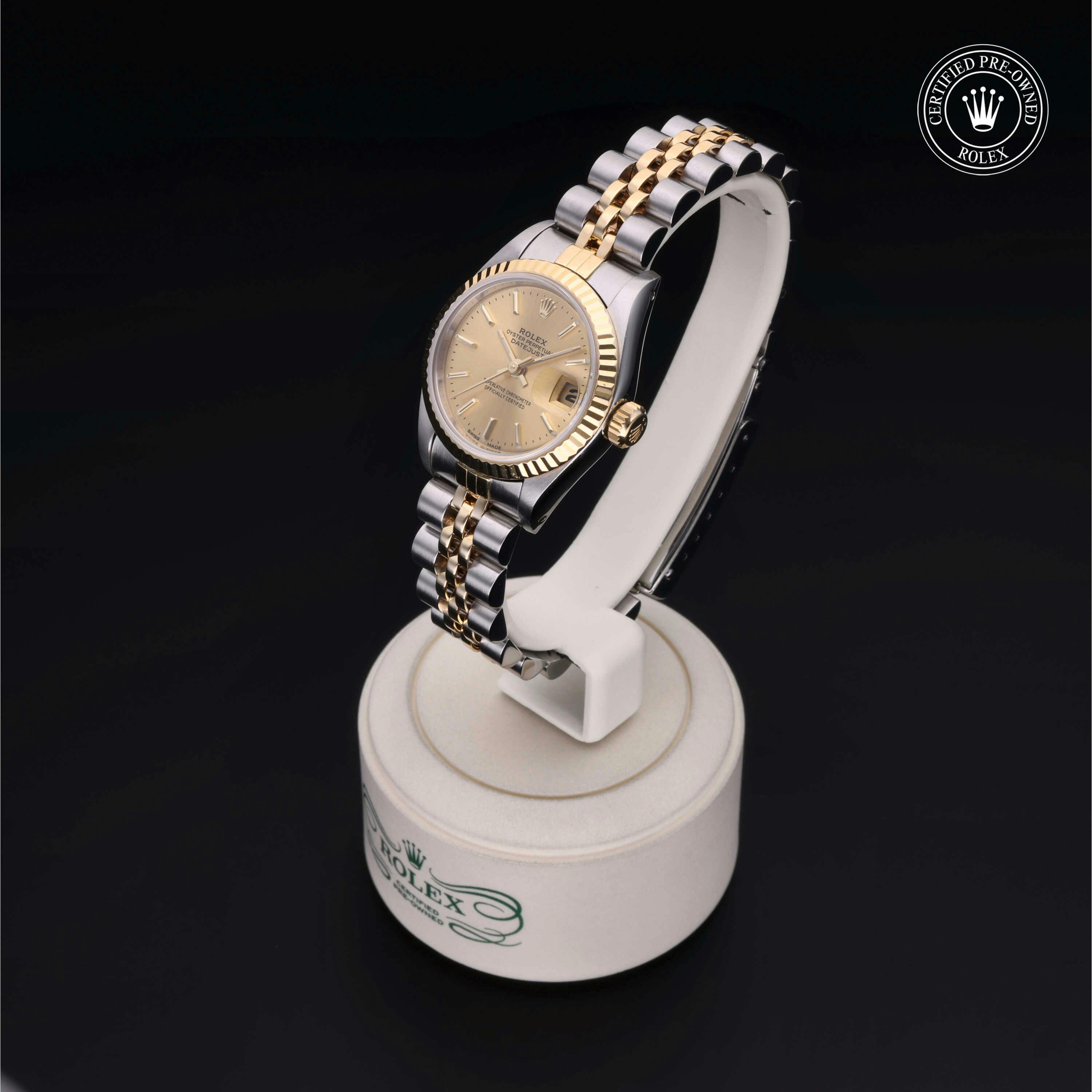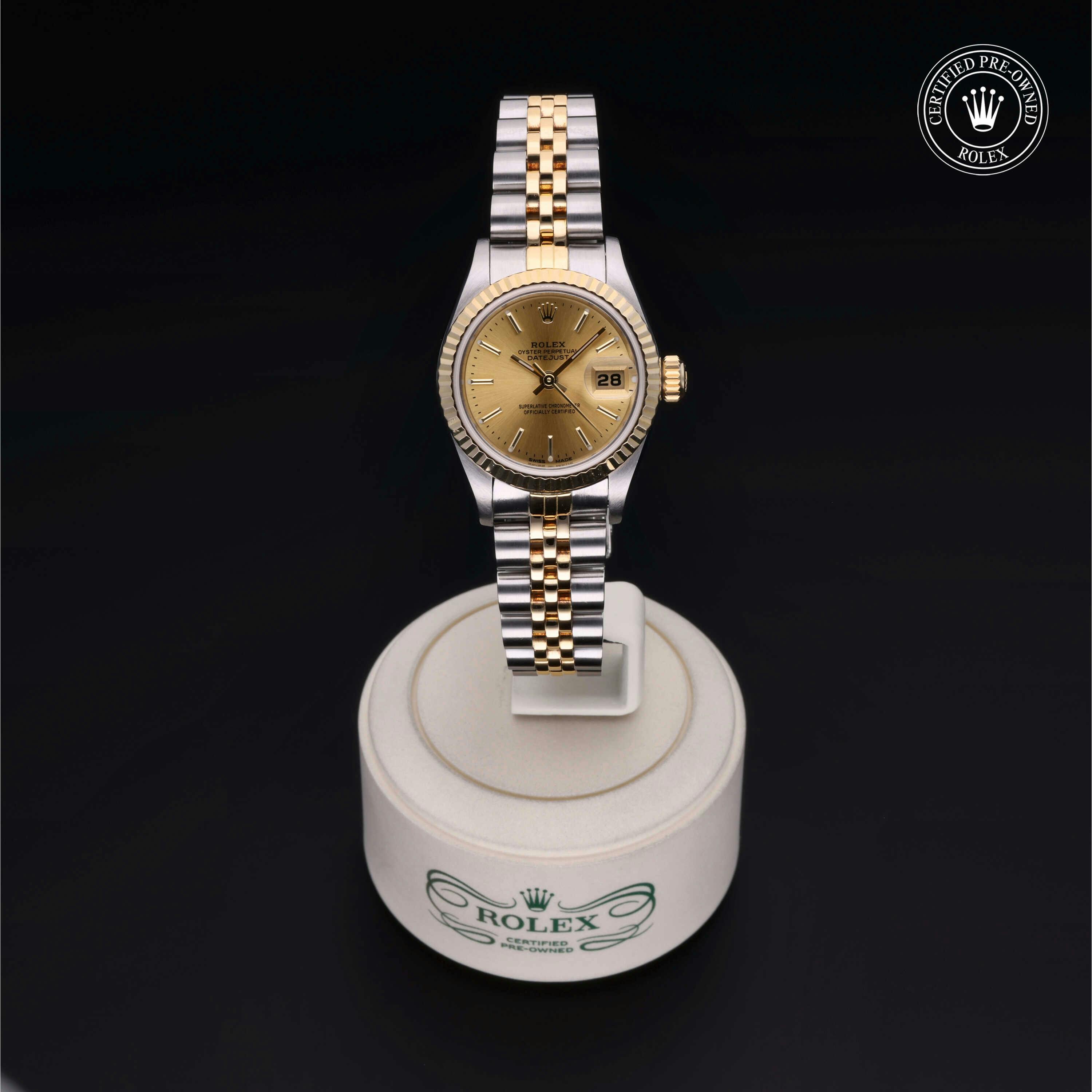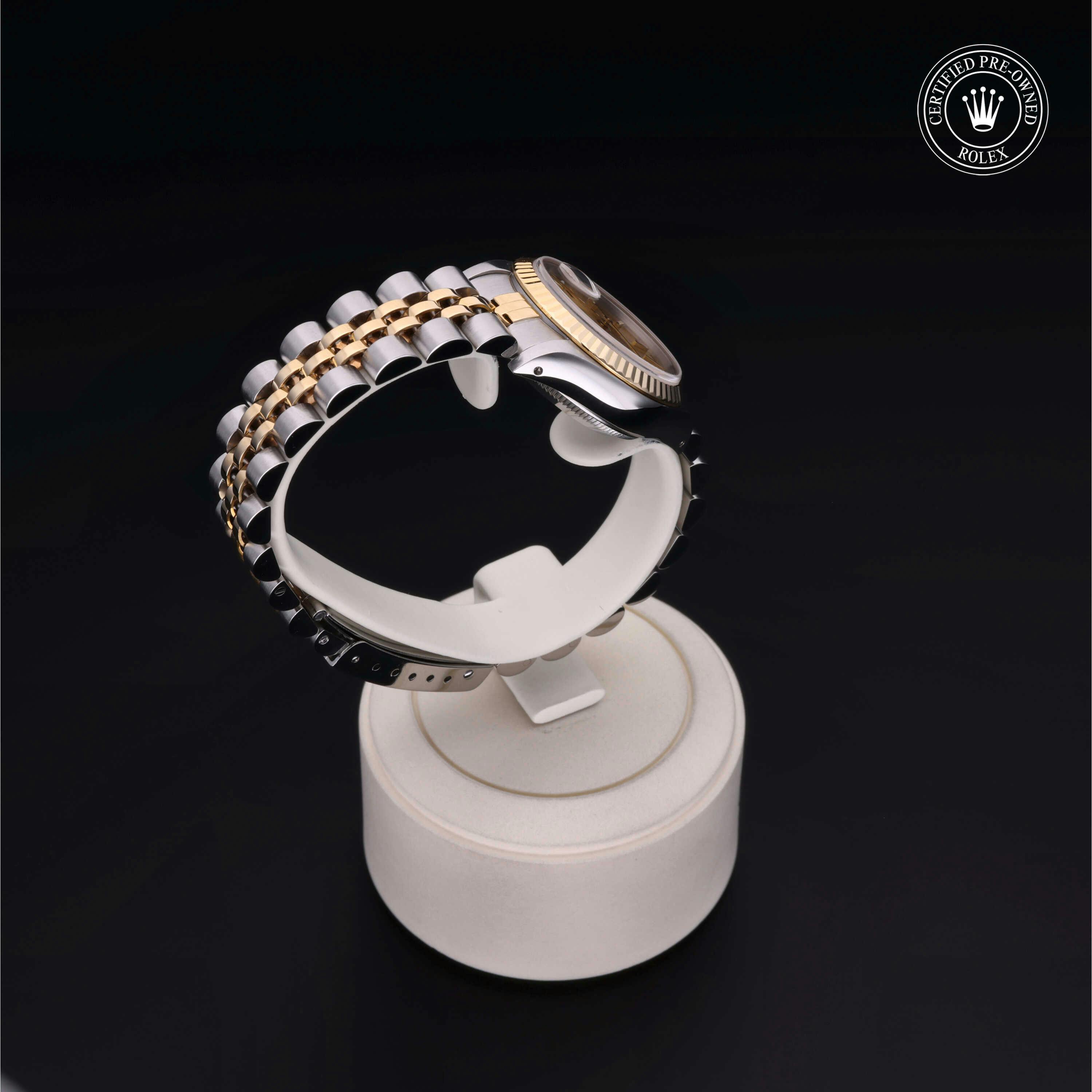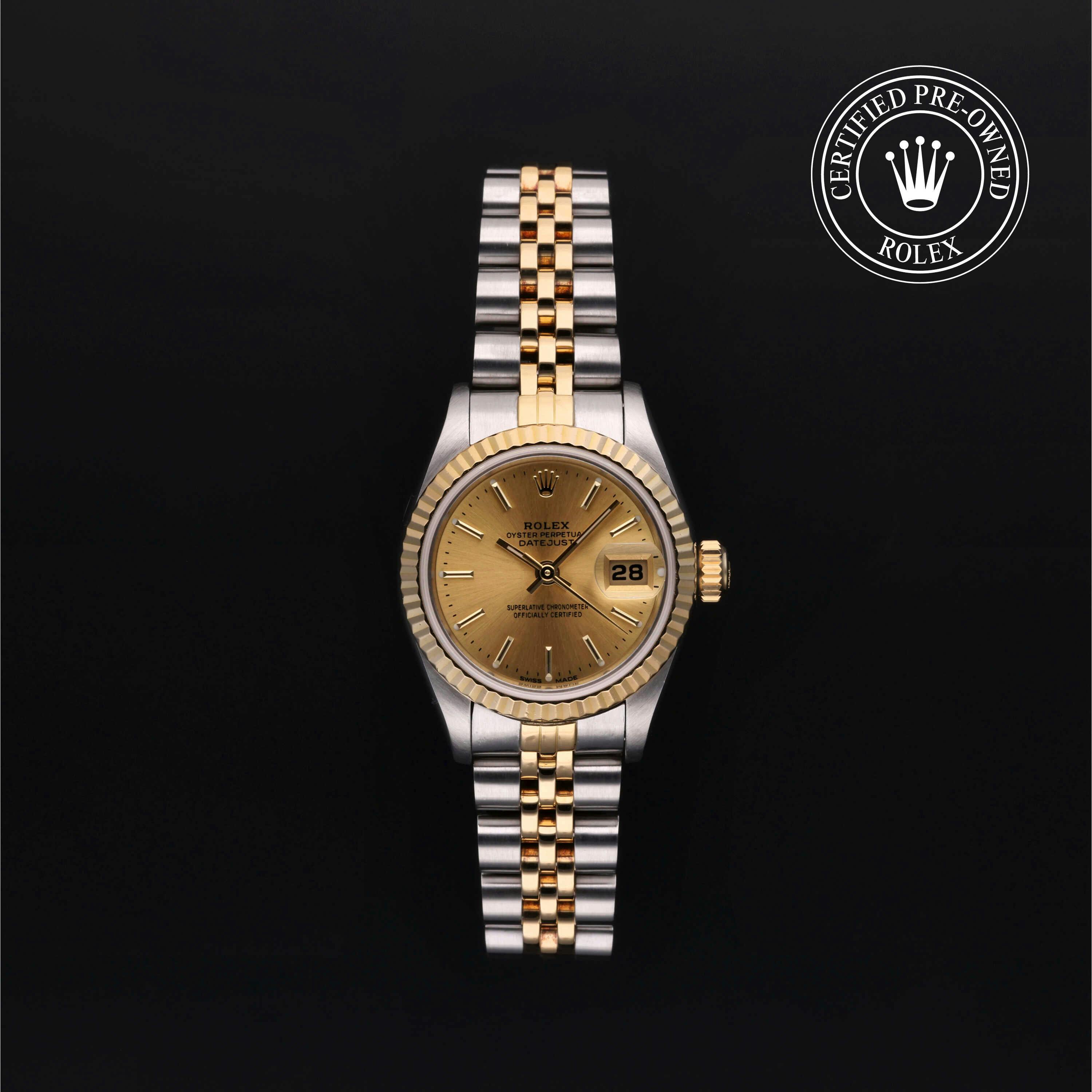 Rolex Certified Pre-Owned Datejust (69173) self - winding automatic watch, features a 26mm stainless steel case with an 18k yellow gold fluted bezel surrounding a champagne dial on a stainless steel and 18k yellow gold jubilee bracelet. Functions include hours, minutes, seconds and date. This watch has received Rolex-authorized service and certification. It does not come with the original box or papers, but includes a custom Rolex Certified Pre-Owned hang tag, travel pouch and RCPO international warranty card.