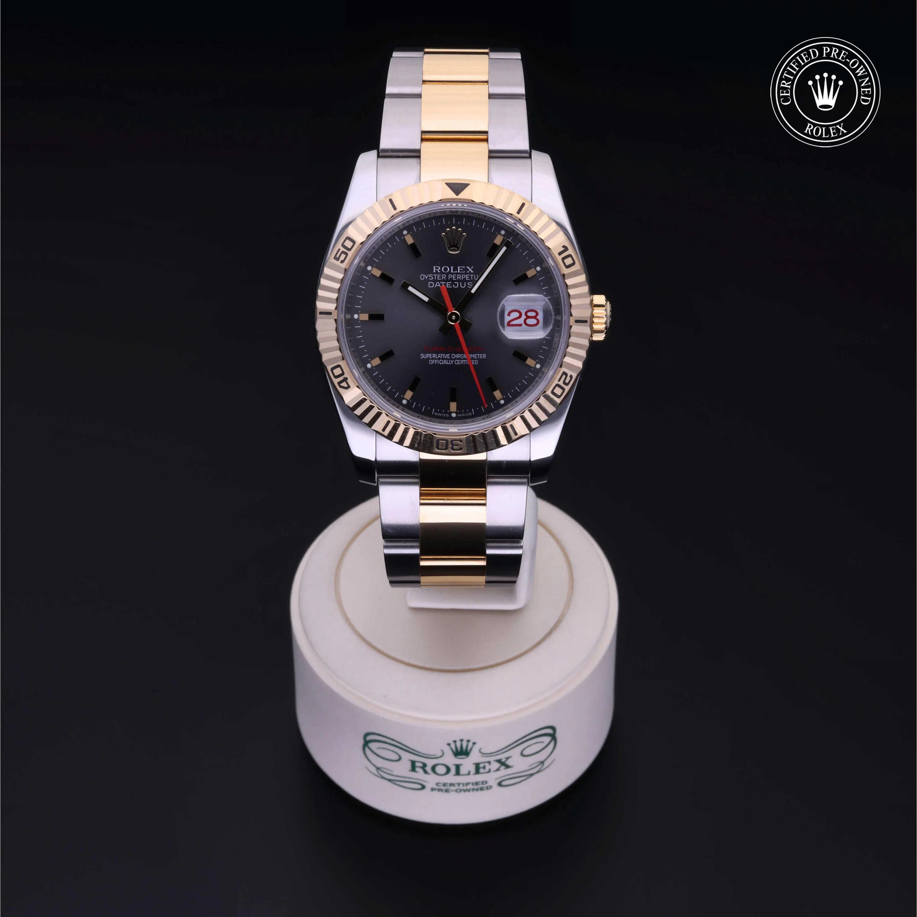 Rolex Certified Pre-Owned Datejust Turn-O-Graph (116263) self-winding automatic watch, features a 36mm stainless steel case with an 18k yellow gold fluted bezel surrounding a slate dial on a stainless steel and 18k yellow gold oyster bracelet. Functions include hours, minutes, seconds and date. This watch has received Rolex-authorized service and certification. It does not come with the original box or papers, but includes a custom Rolex Certified Pre-Owned hang tag, travel pouch and RCPO international warranty card.
