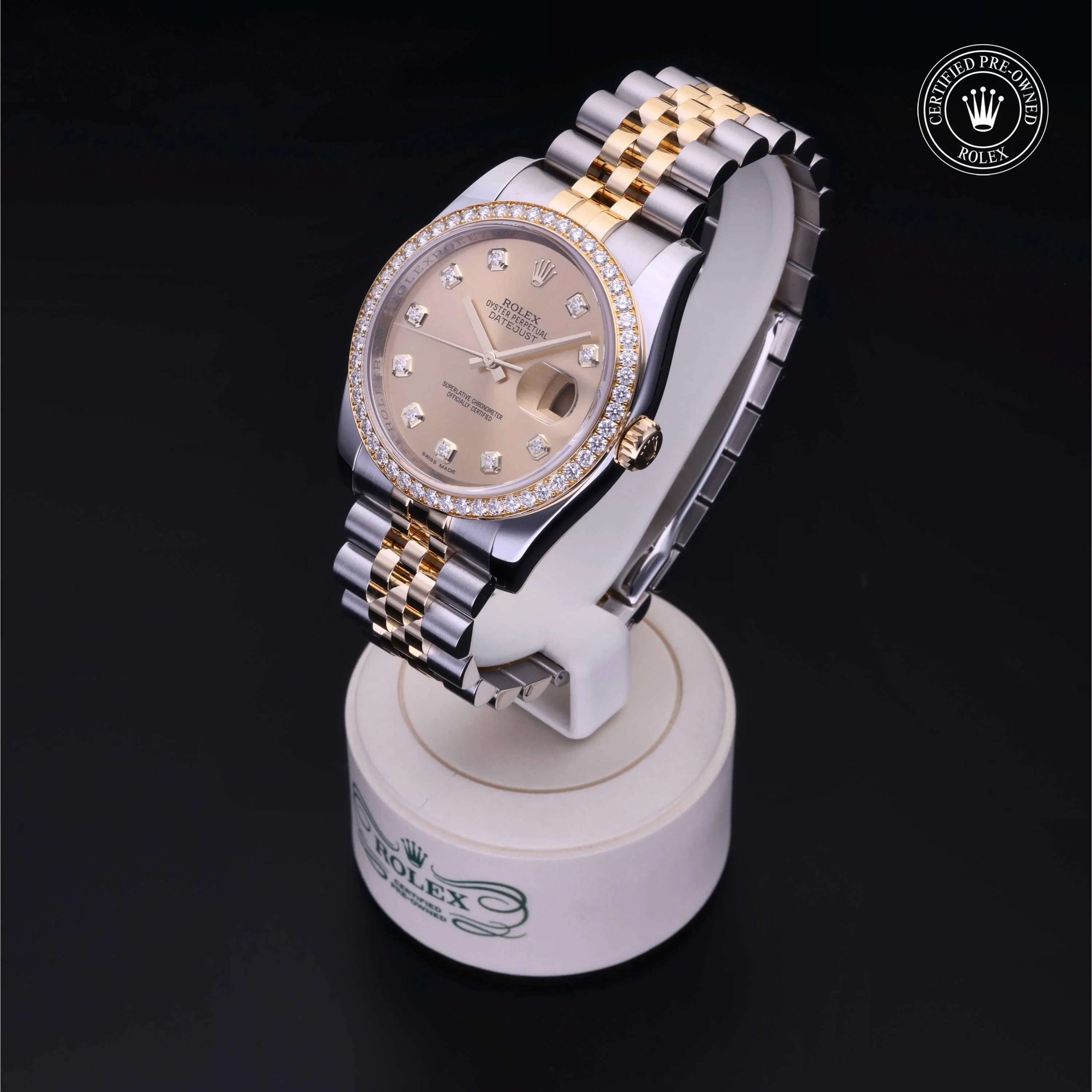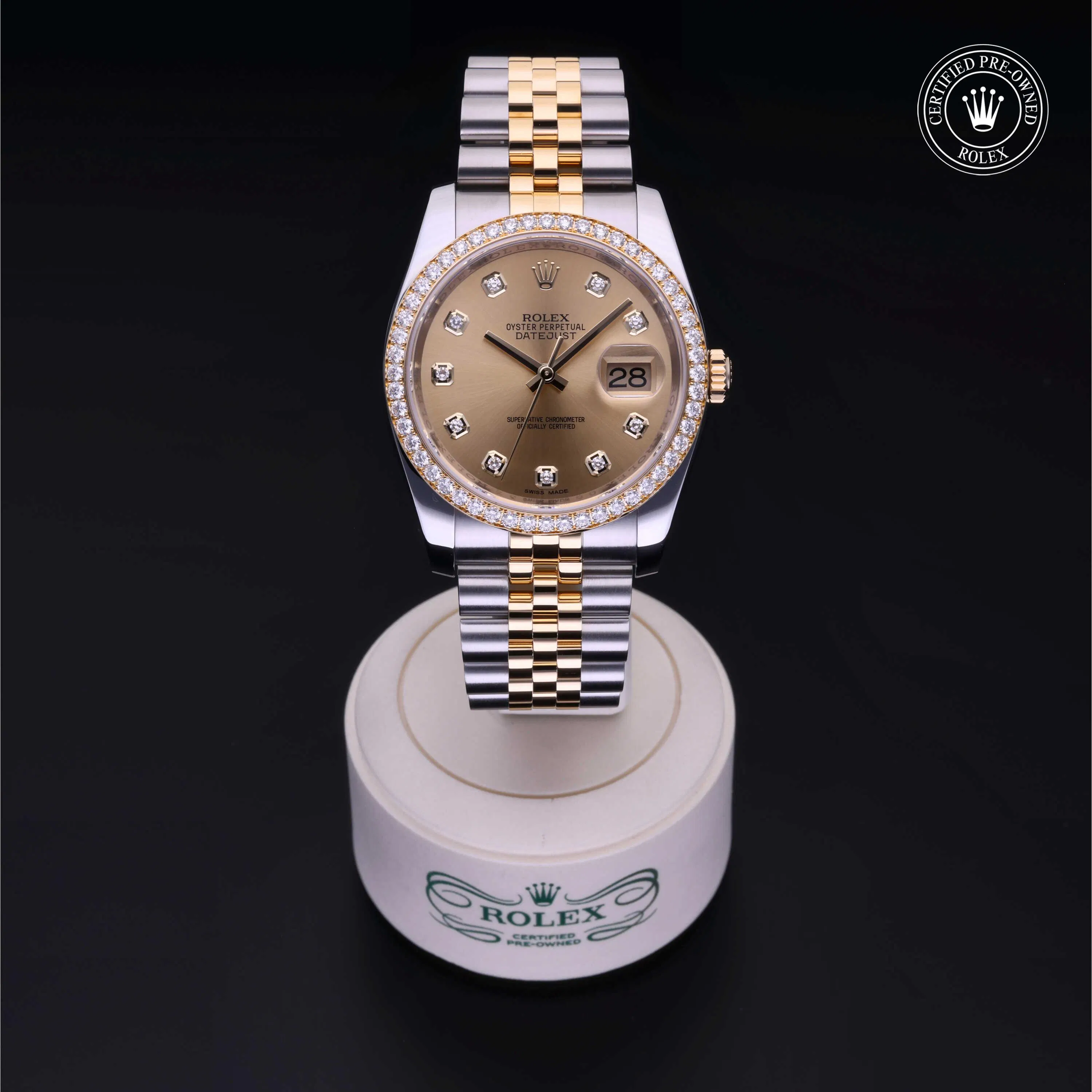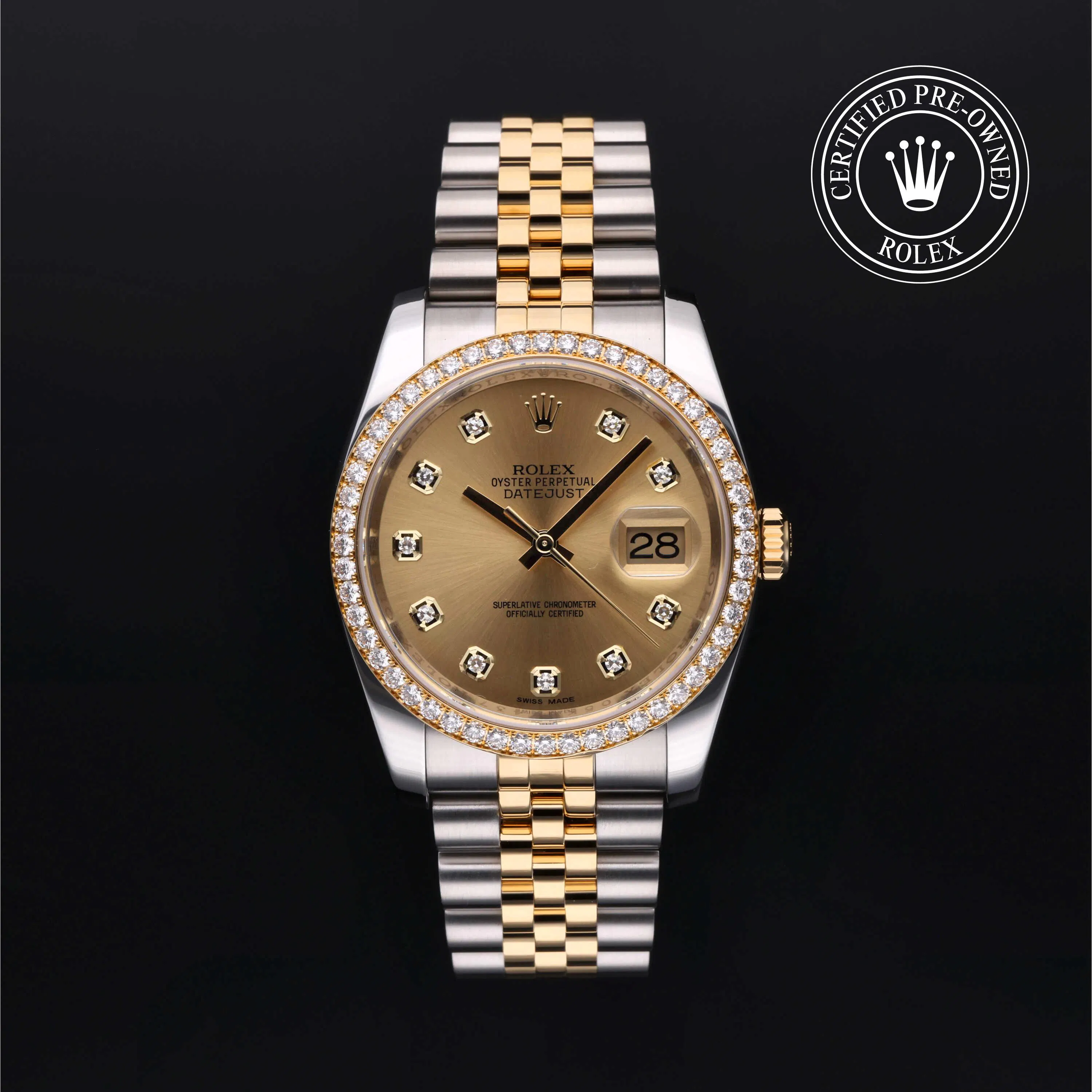 Rolex Certified Pre-Owned Datejust (116243) self - winding automatic watch, features a 36mm stainless steel case with an 18k yellow gold diamond set bezel surrounding a champagne diamond set dial on a stainless steel and 18k yellow gold jubilee bracelet. Functions include hours, minutes, seconds and date. This watch has received Rolex-authorized service and certification. It does not come with the original box or papers, but includes a custom Rolex Certified Pre-Owned hang tag, travel pouch and RCPO international warranty card.