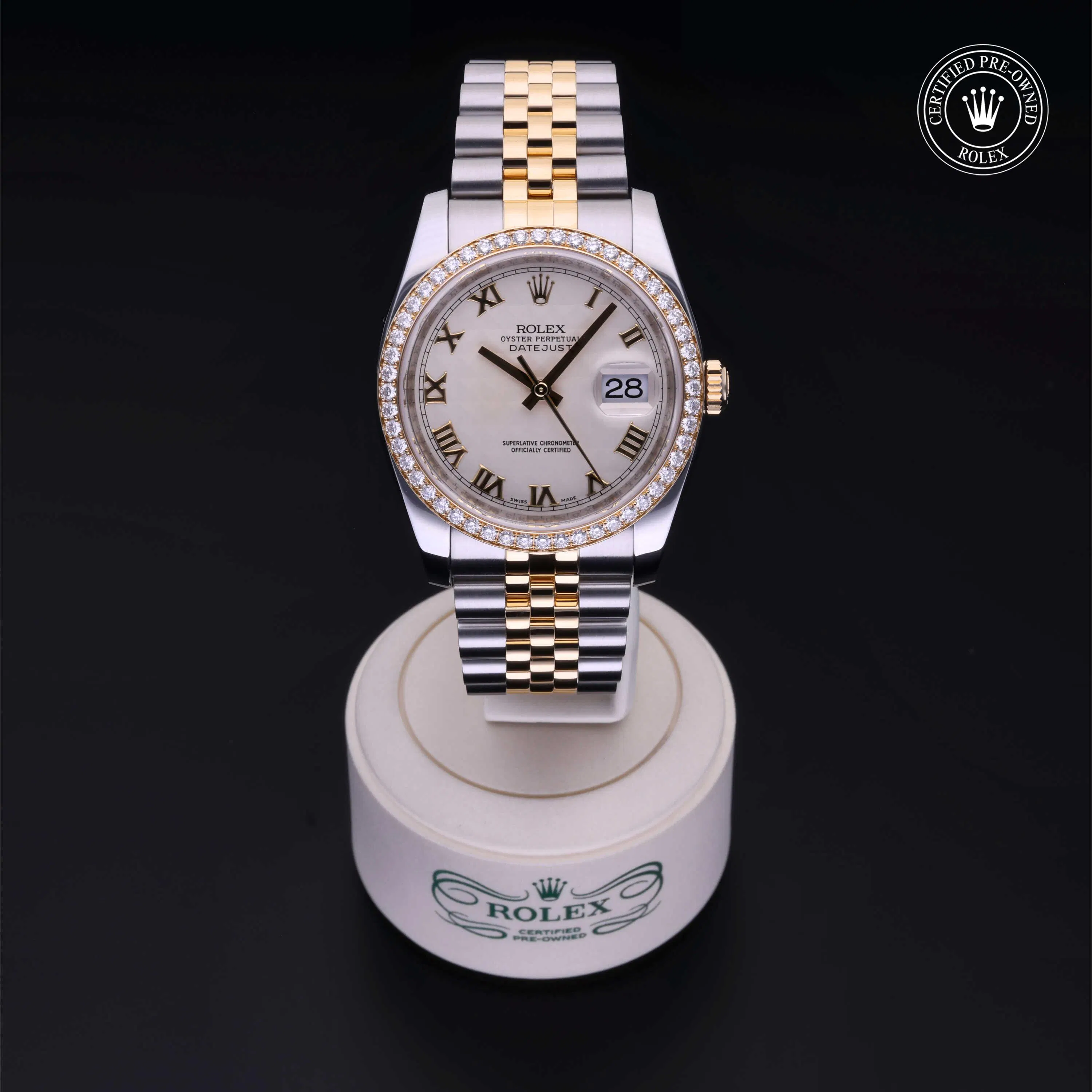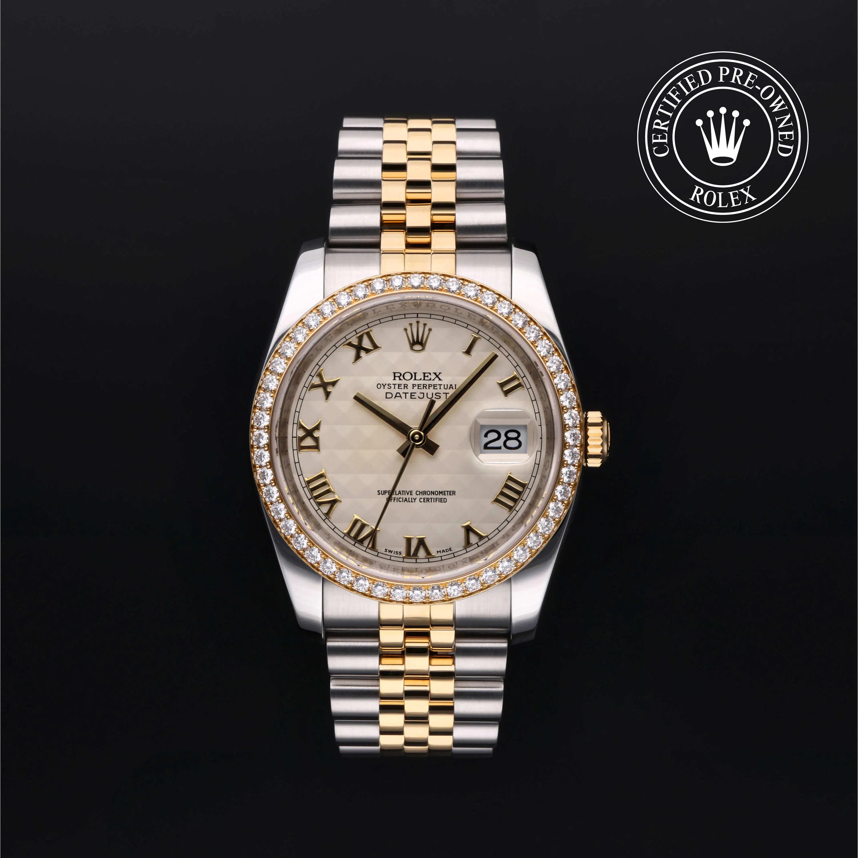 Rolex Certified Pre-Owned Datejust (116243) self - winding automatic watch, features a 36mm stainless case with an 18k yellow gold diamond set bezel surrounding an ivory pyramid dial on a stainless steel and 18k yellow gold jubilee bracelet. Functions include hours, minutes, seconds and date. This watch has received Rolex-authorized service and certification. It does not come with the original box or papers, but includes a custom Rolex Certified Pre-Owned hang tag, travel pouch and RCPO international warranty card.