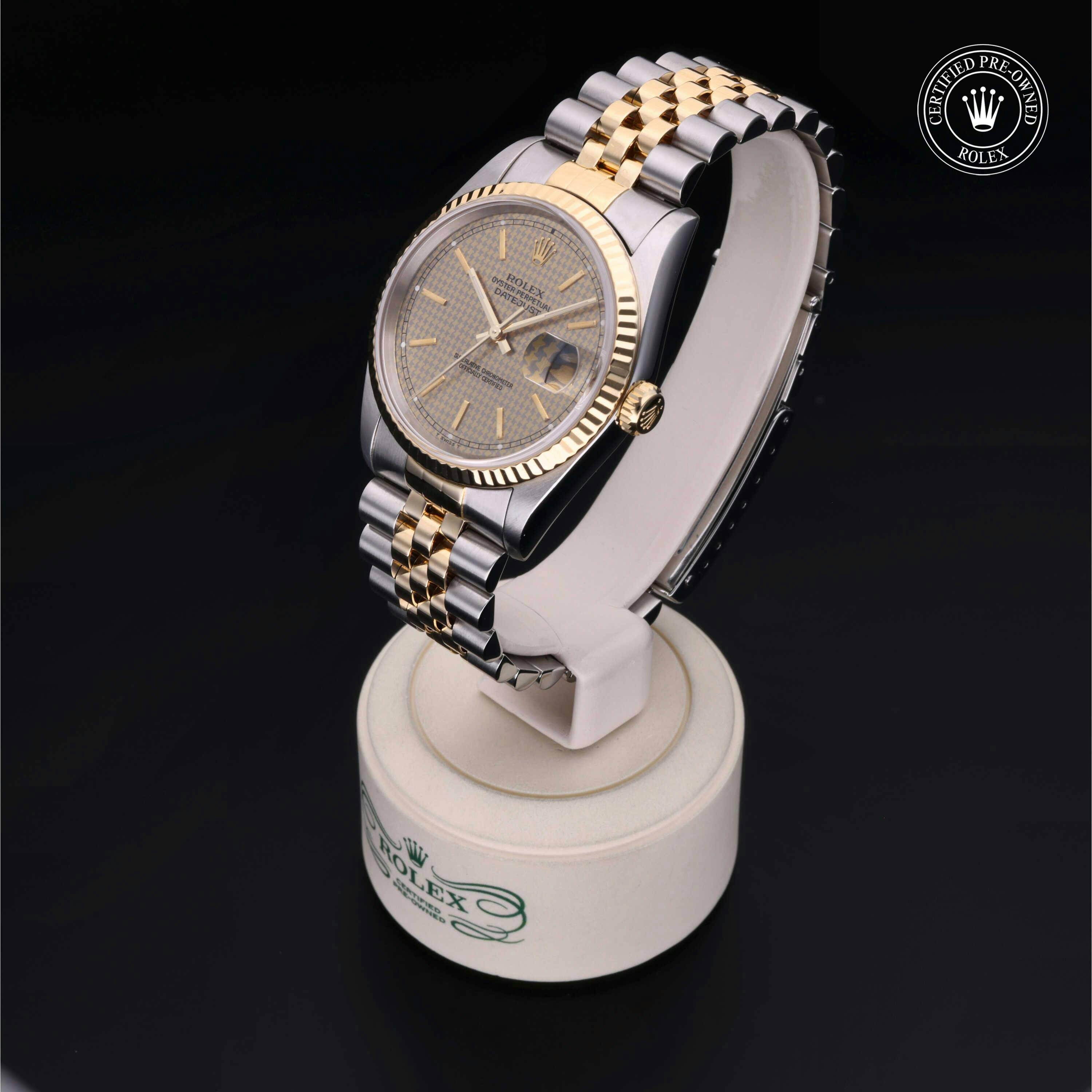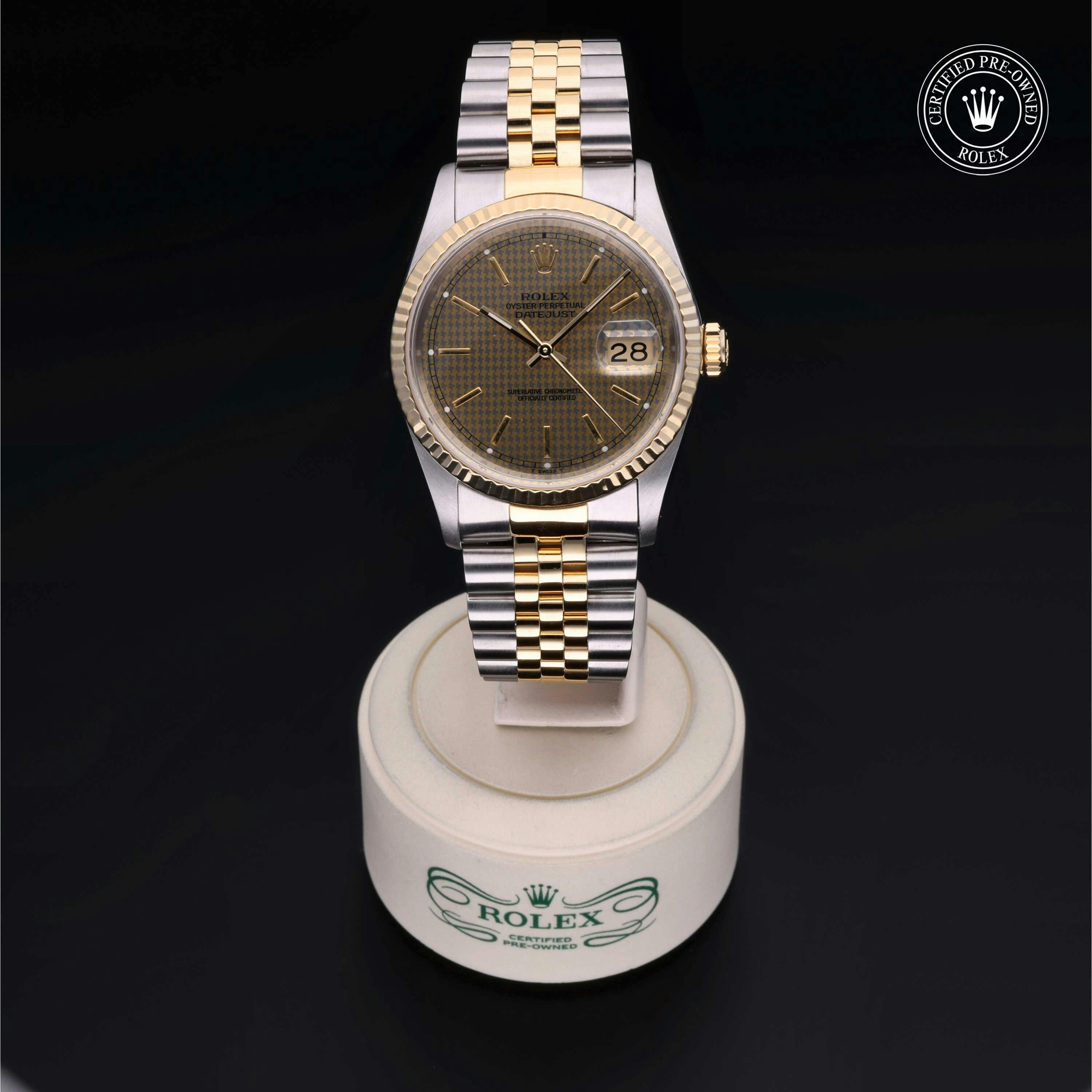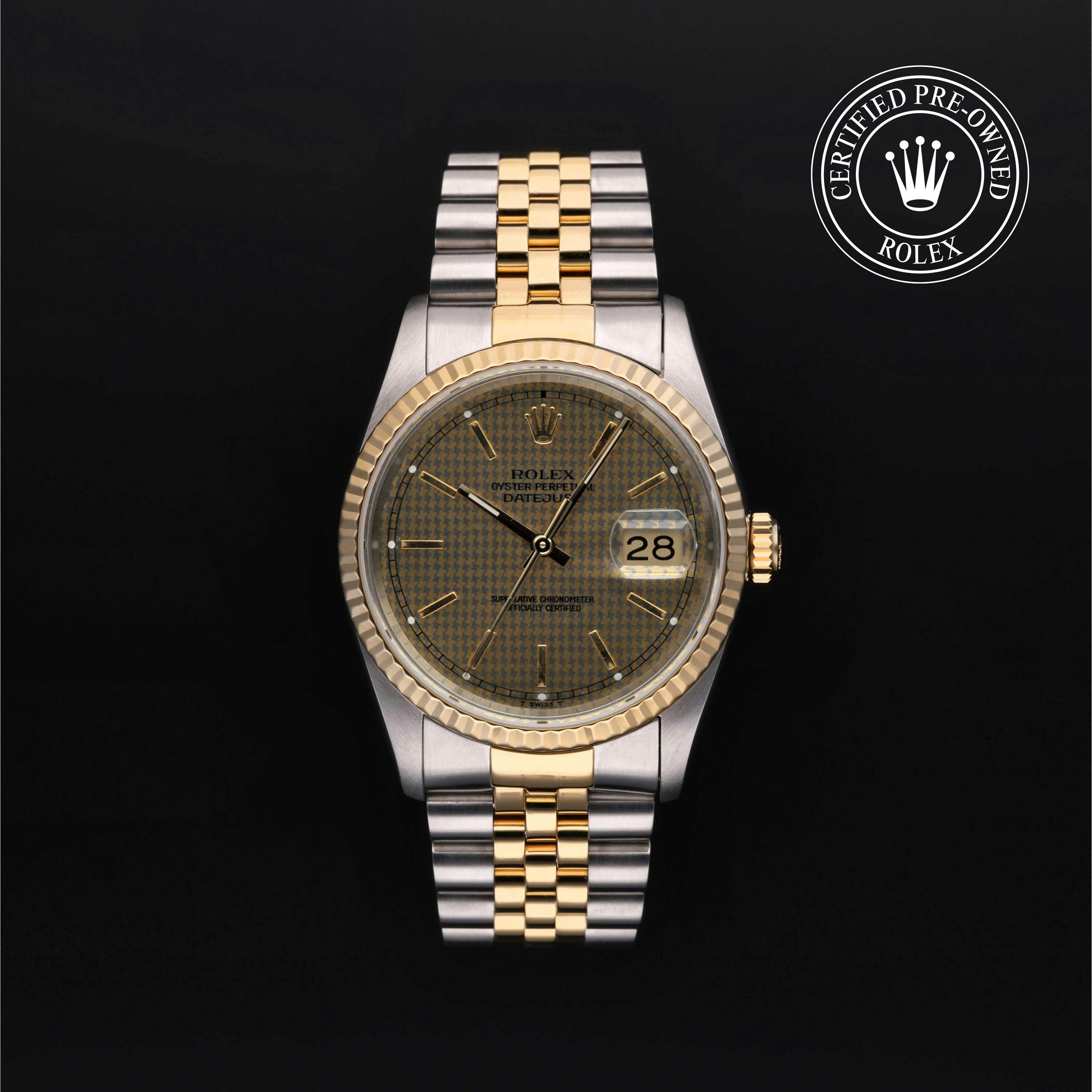 Rolex Certified Pre-Owned Datejust (16233) self - winding automatic watch, features a 36mm stainless steel case with an 18k yellow gold fluted bezel surrounding a champagne Houndstooth dial on a stainless steel and 18k yellow gold jubilee bracelet. Functions include hours, minutes, seconds and date. This watch has received Rolex-authorized service and certification. It comes with the original box, and includes a custom Rolex Certified Pre-Owned hang tag, travel pouch and RCPO international warranty card.