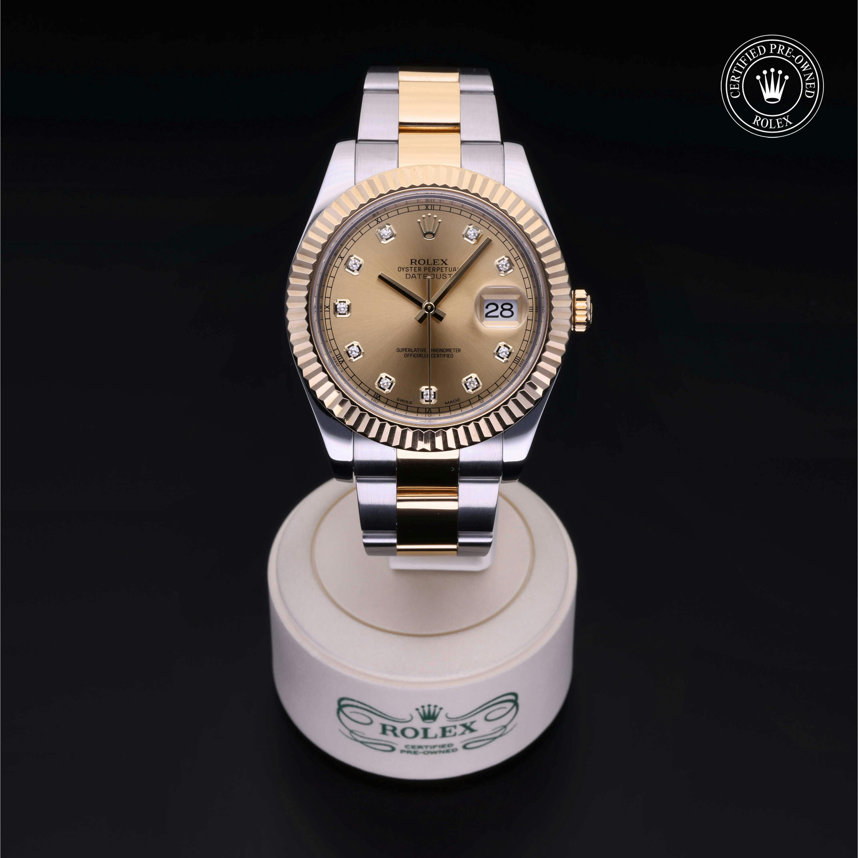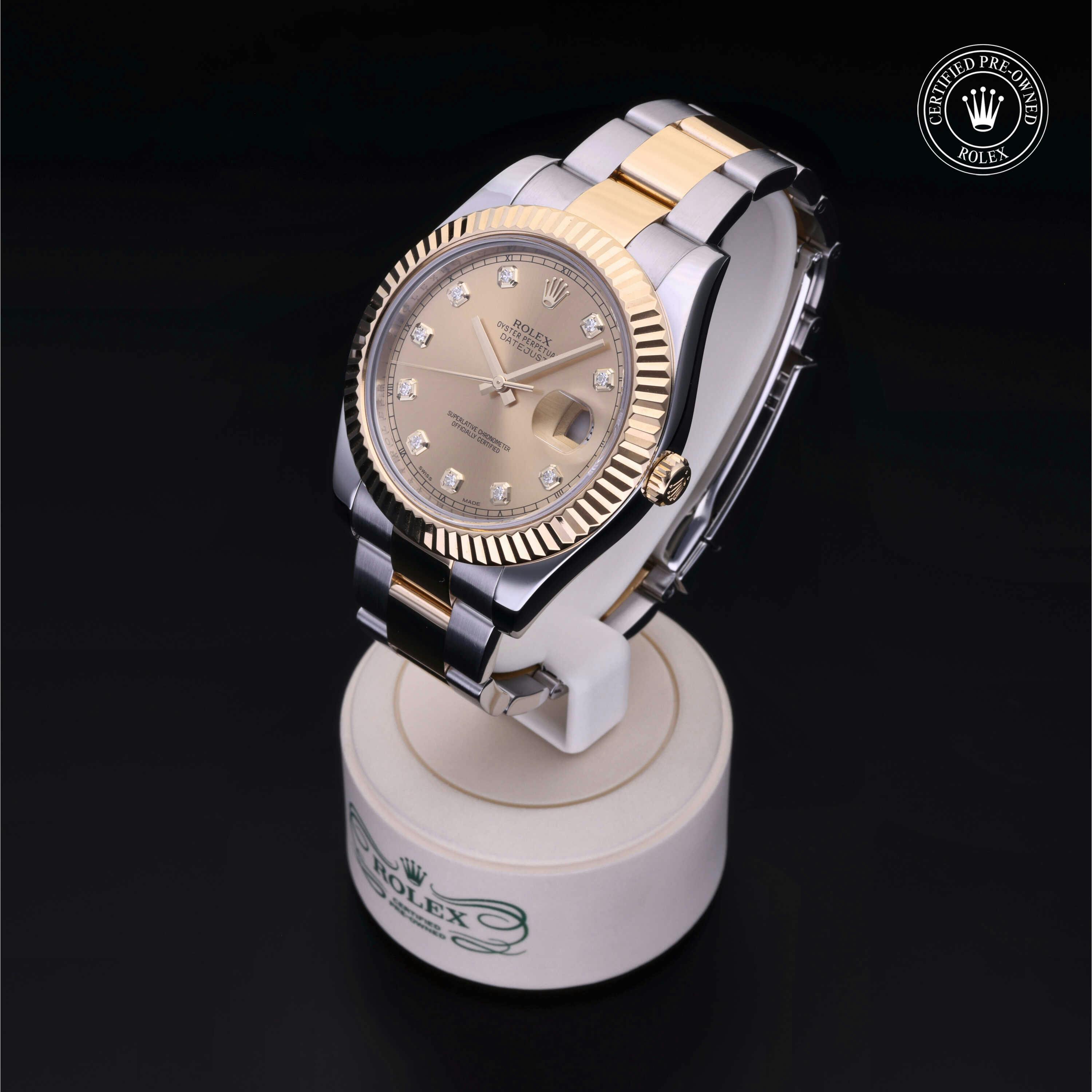 Rolex Certified Pre-Owned Datejust II (116333) self - winding automatic watch, features a 41mm stainless steel case with an 18k yellow gold fluted bezel surrounding a champagne diamond set dial. Watch is secured on a stainless steel and 18k yellow gold oyster bracelet complete with a folding buckle. Functions include hours, minutes, seconds and date. This watch has been serviced by an authorized Rolex service center and certified by Rolex. It does not come with the original box or papers, but includes a custom Rolex Certified Pre-Owned hang tag, travel pouch and international warranty card.