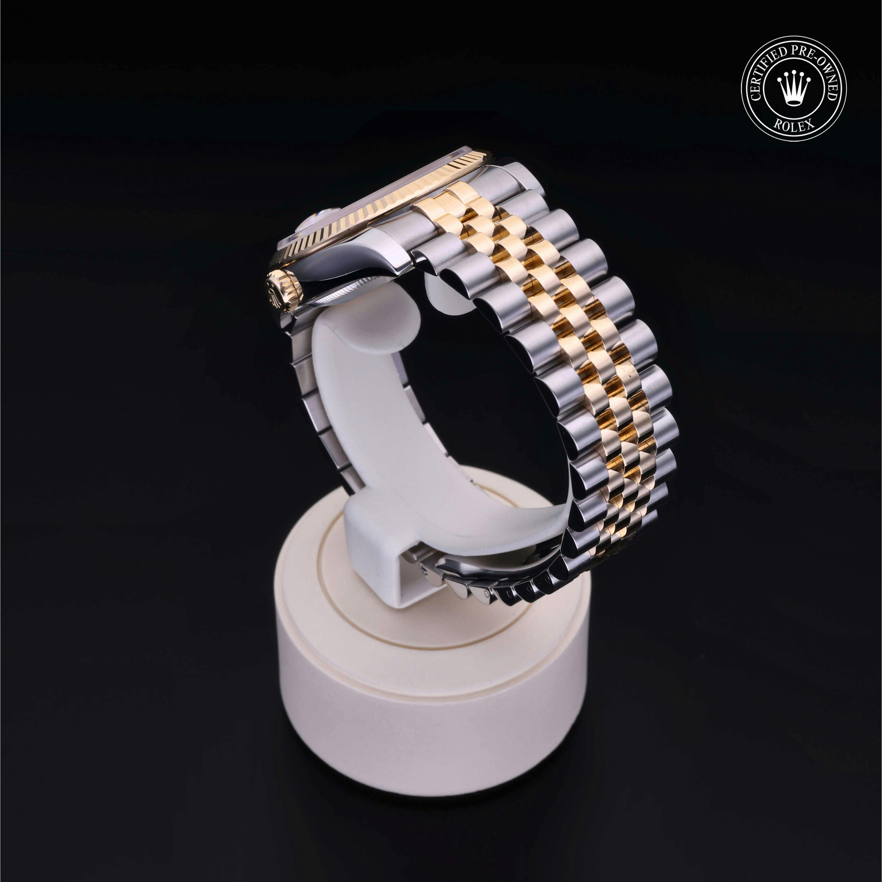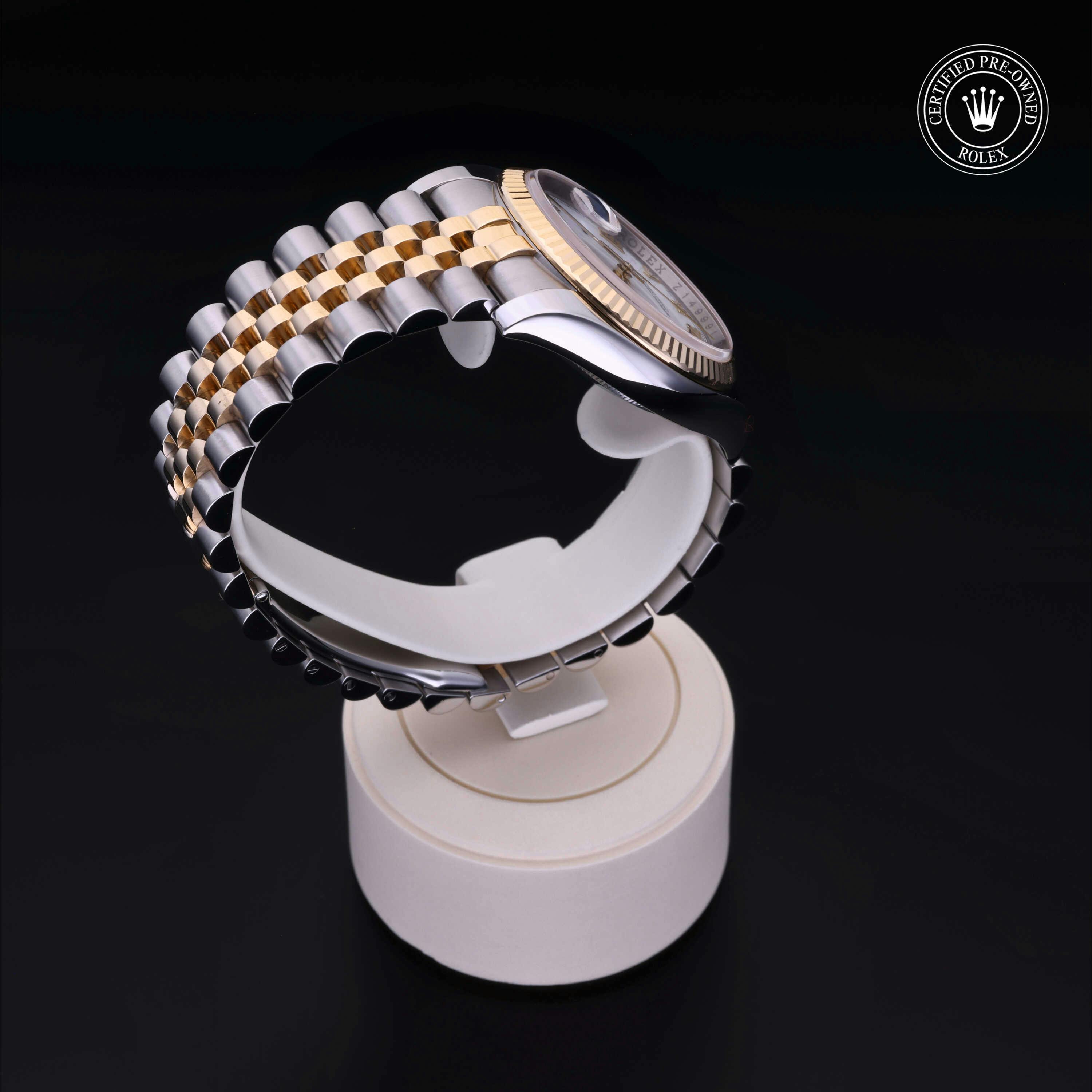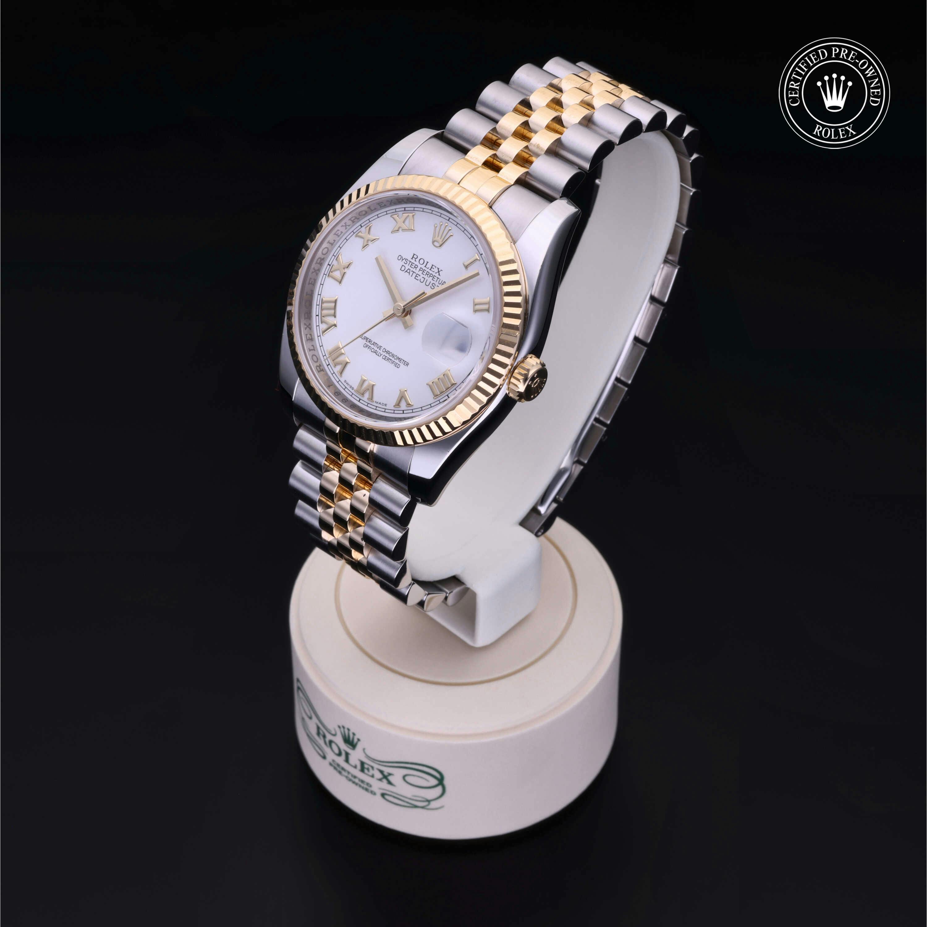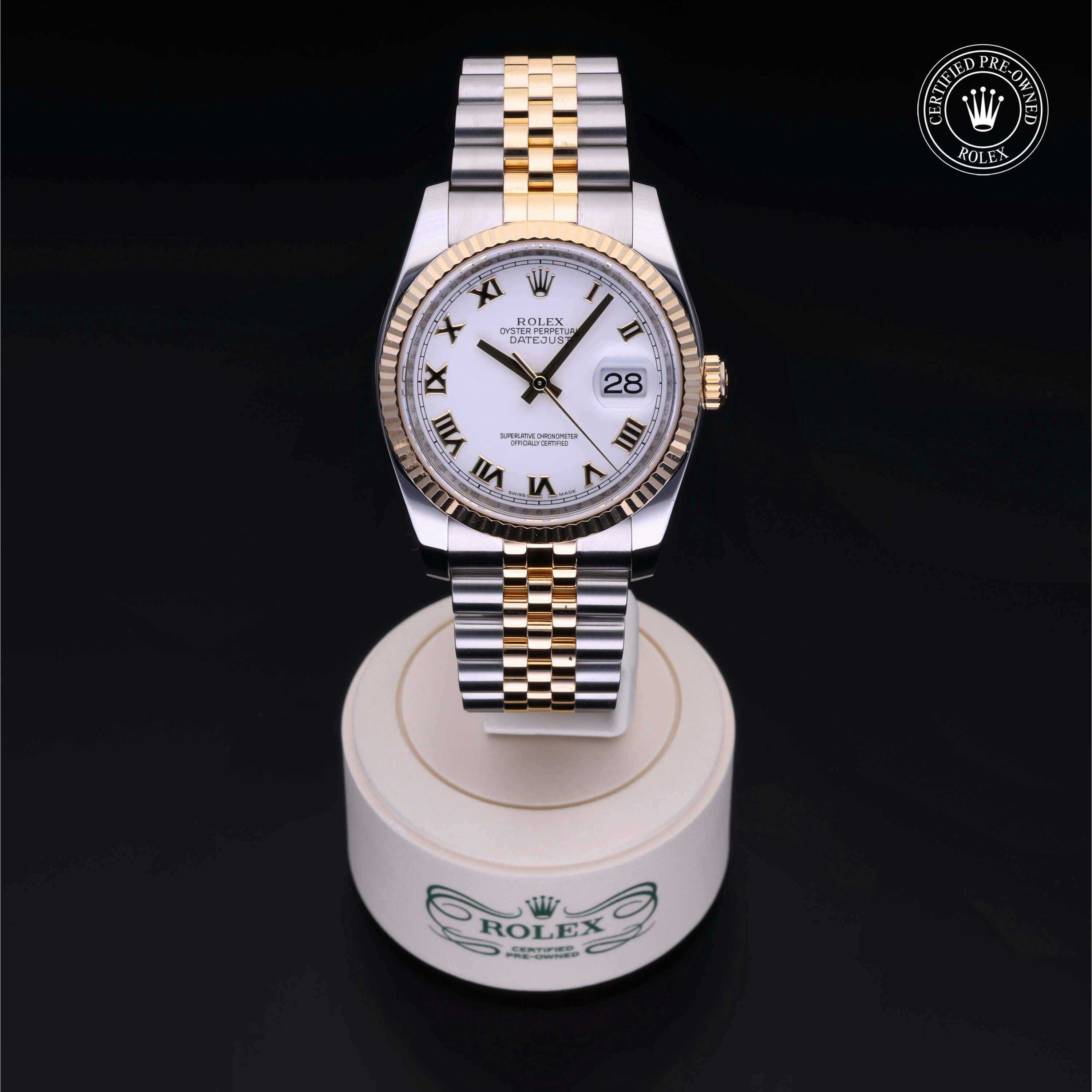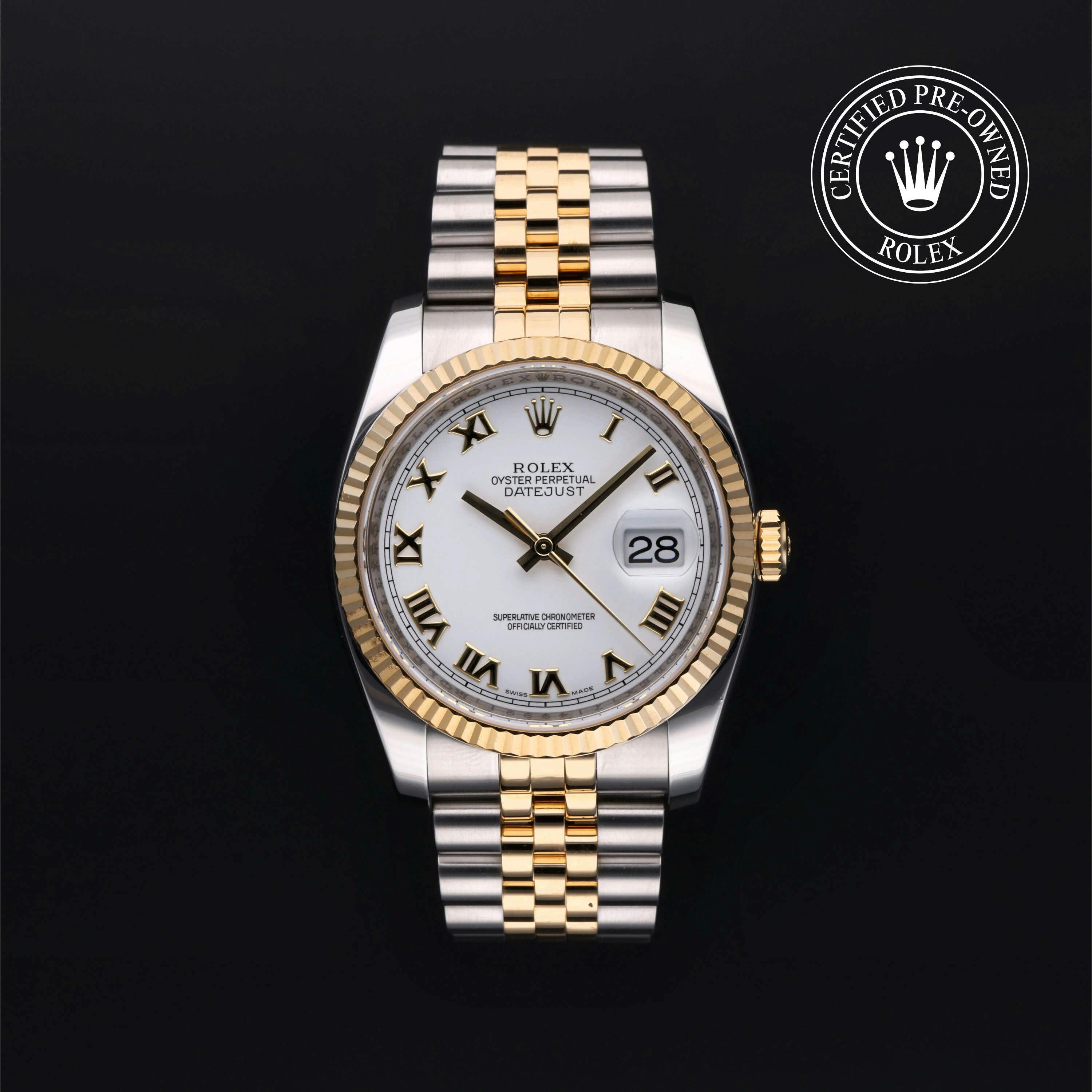 Rolex Certified Pre-Owned Datejust (116233) self - winding automatic watch, features a 36mm stainless steel case with an 18k yellow gold fluted bezel surrounding a white dial on a stainless steel and 18k yellow gold jubilee bracelet. Functions include hours, minutes, seconds and date. This watch has received Rolex-authorized service and certification. It does not come with the original box or papers, but includes a custom Rolex Certified Pre-Owned hang tag, travel pouch and RCPO international warranty card.
