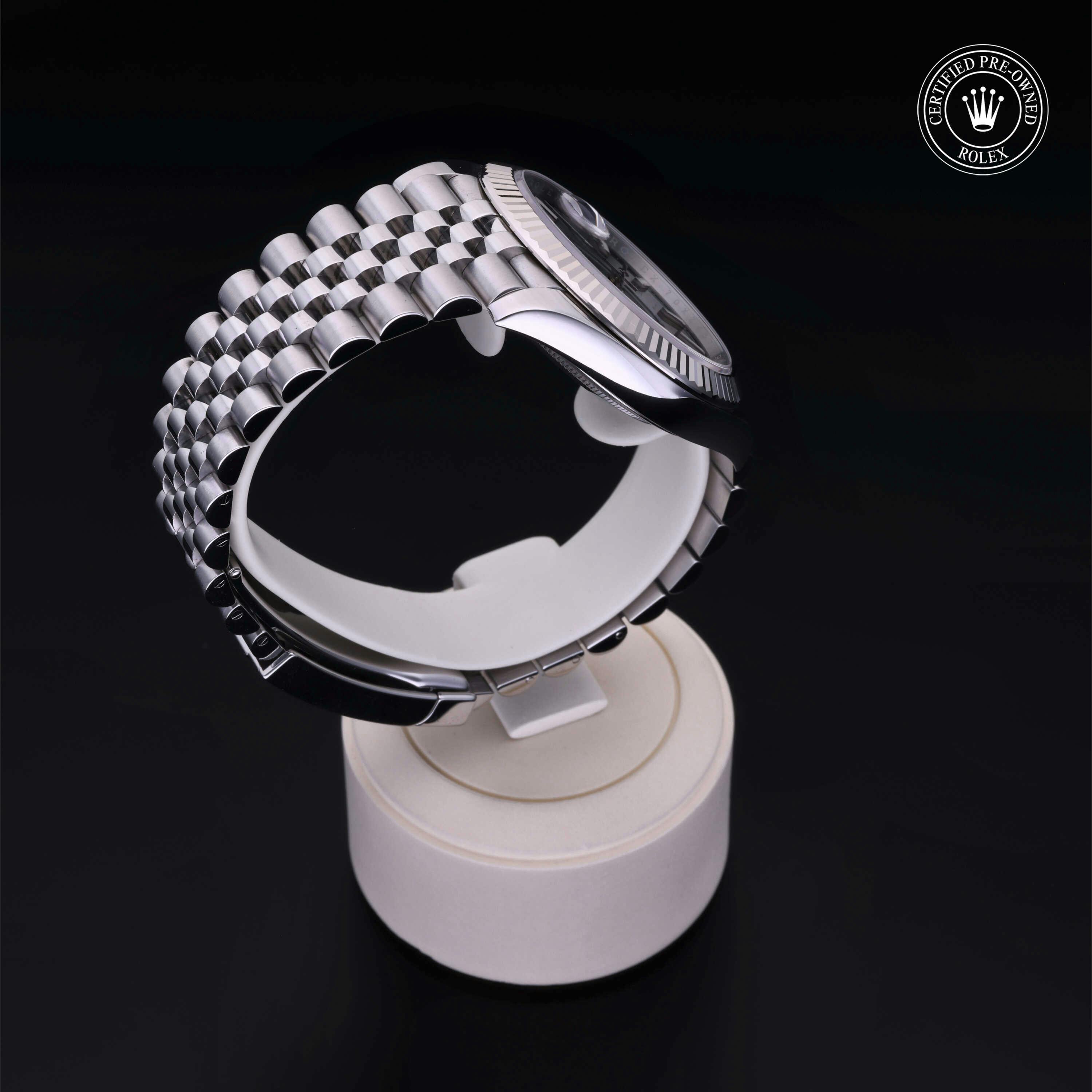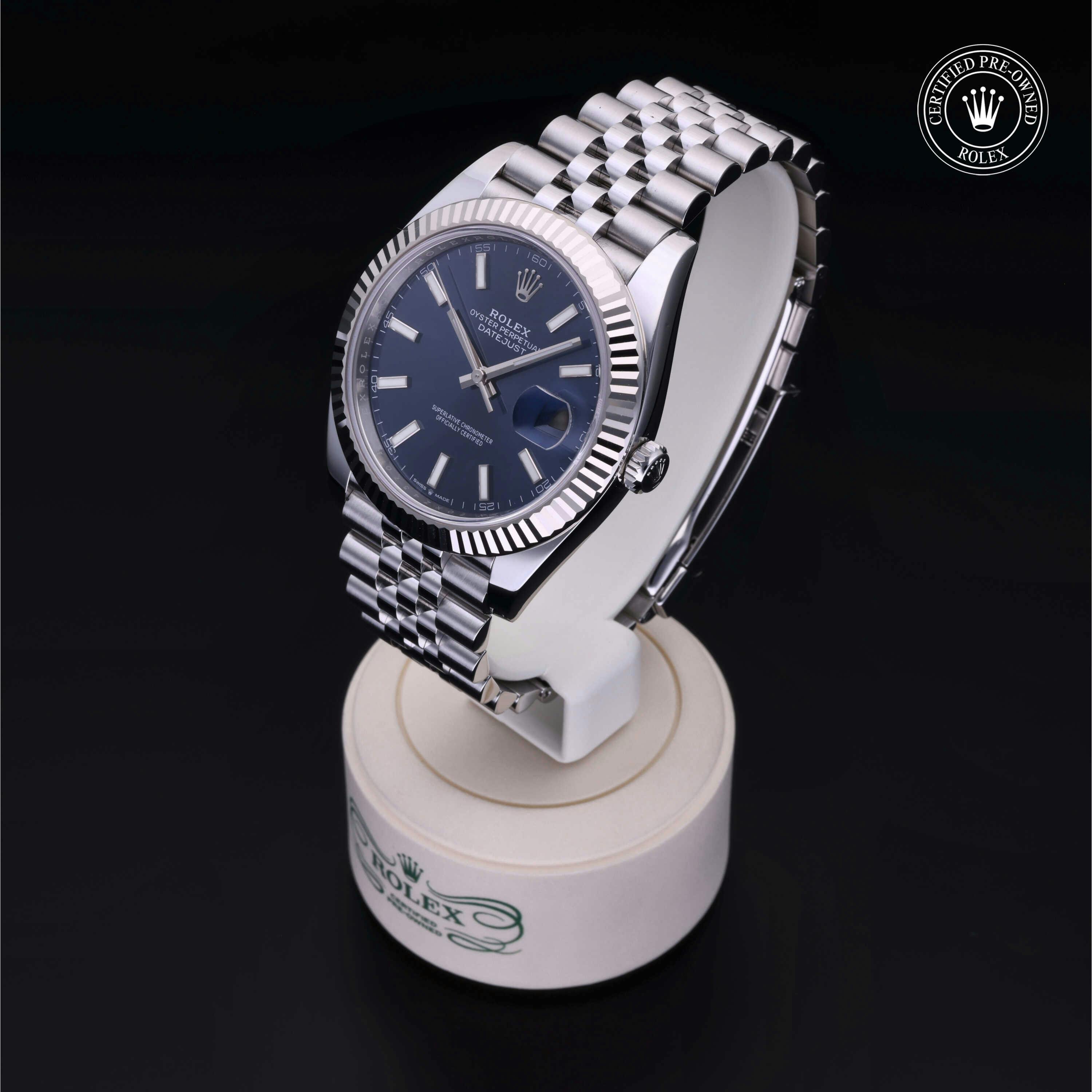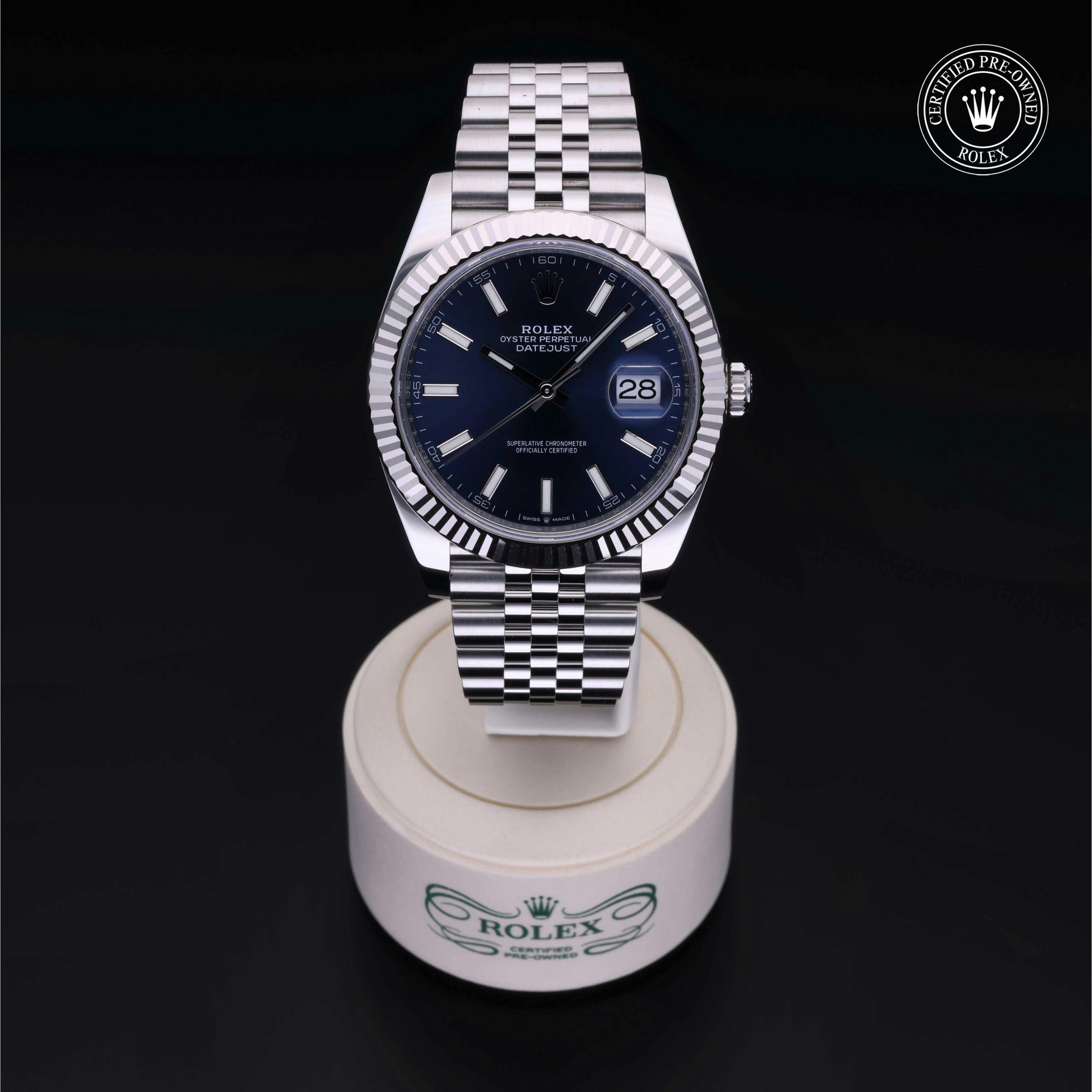 Rolex Certified Pre-Owned Datejust (126334) self - winding automatic watch, features a 41mm stainless steel case with an 18k white gold fluted bezel surrounding a bright blue dial on a stainless steel jubilee bracelet. Functions include hours, minutes, seconds and date. This watch has received Rolex-authorized service and certification. It comes with the original box and papers, and includes a custom Rolex Certified Pre-Owned hang tag, travel pouch and RCPO international warranty card.