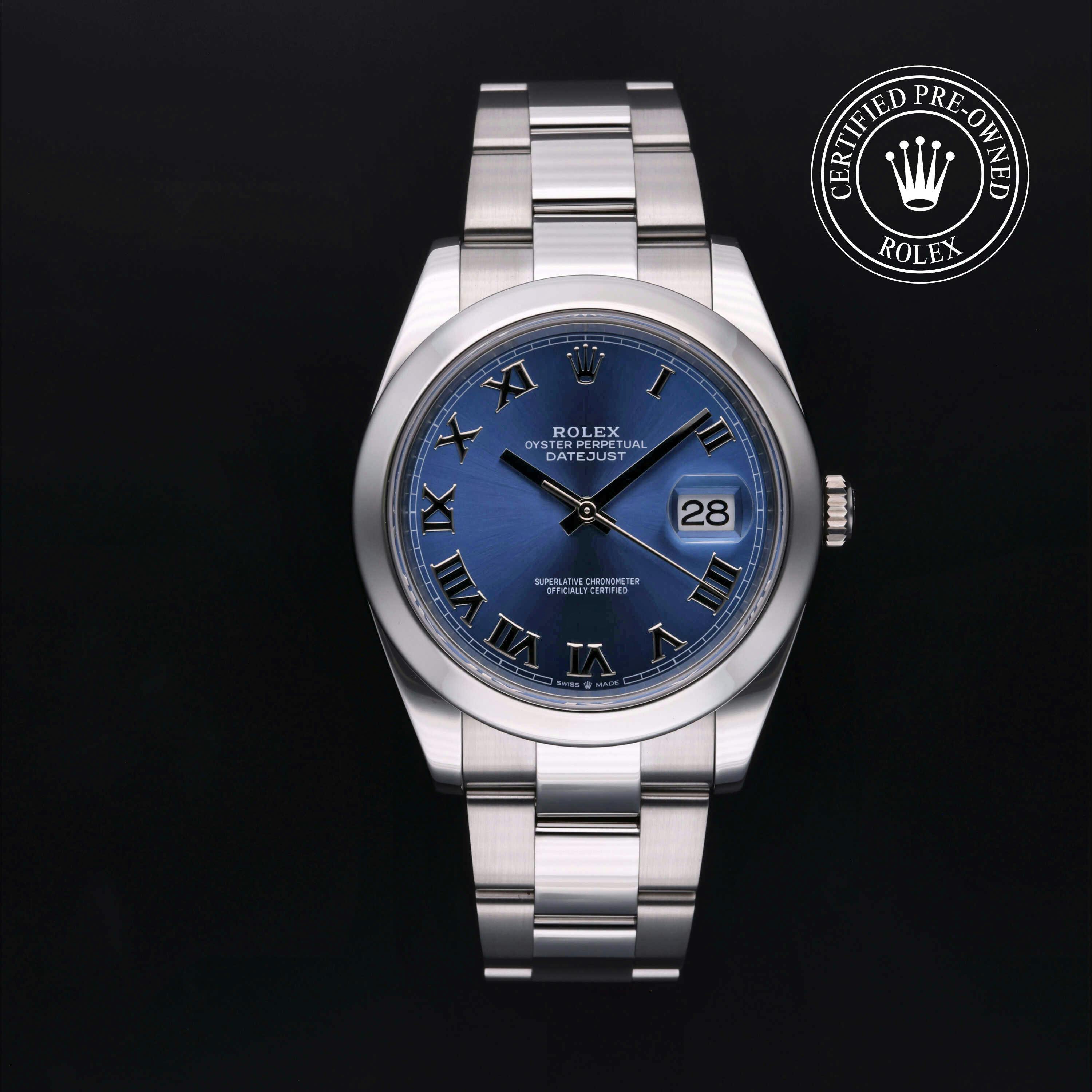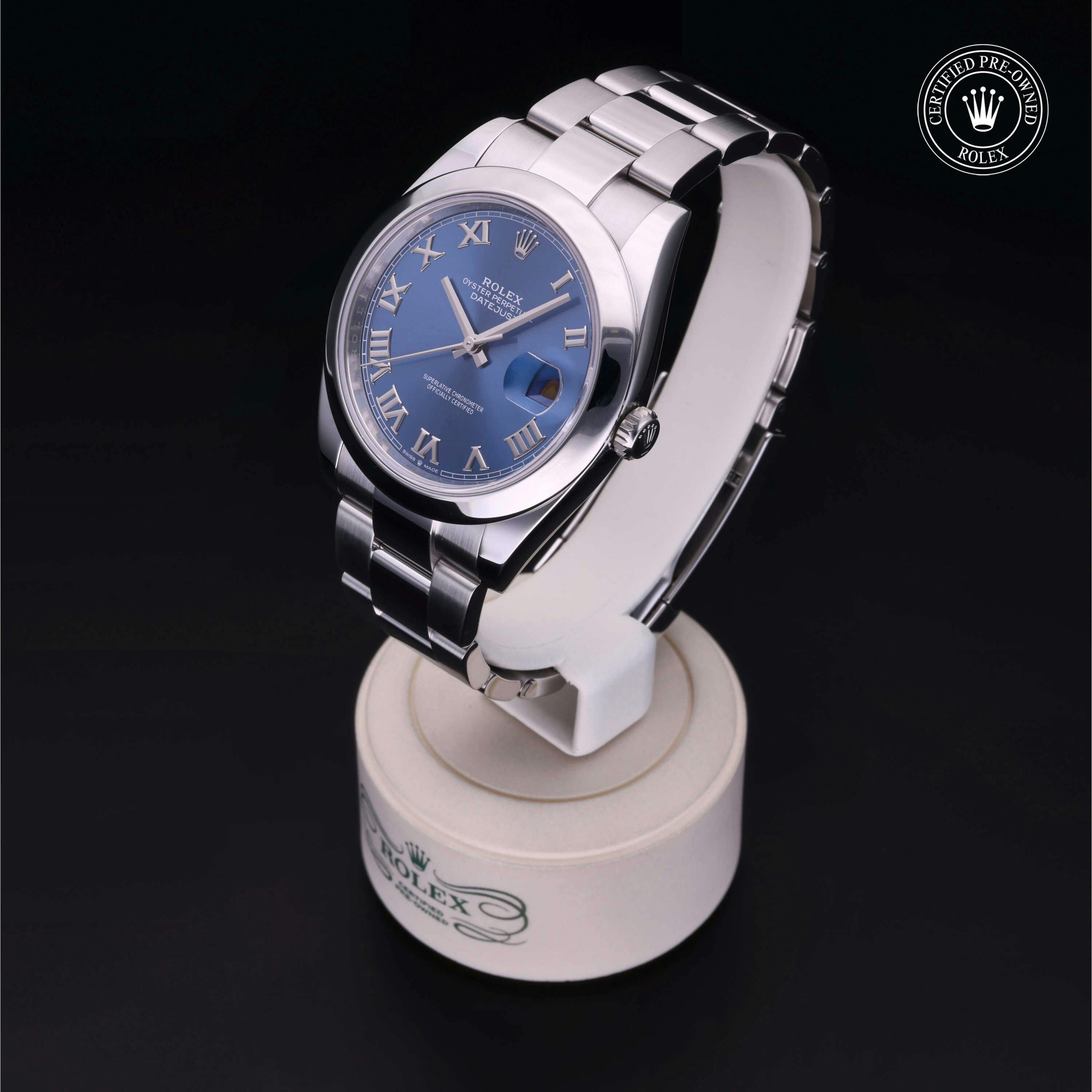 Rolex Certified Pre-Owned Datejust (126300) self - winding automatic watch, features a 41mm stainless steel case and smooth bezel surrounding an Azzurro blue dial on a stainless steel oyster bracelet. Functions include hours, minutes, seconds and date. This watch has received Rolex-authorized service and certification. It comes with the original box and papers, and includes a custom Rolex Certified Pre-Owned hang tag, travel pouch and RCPO international warranty card.