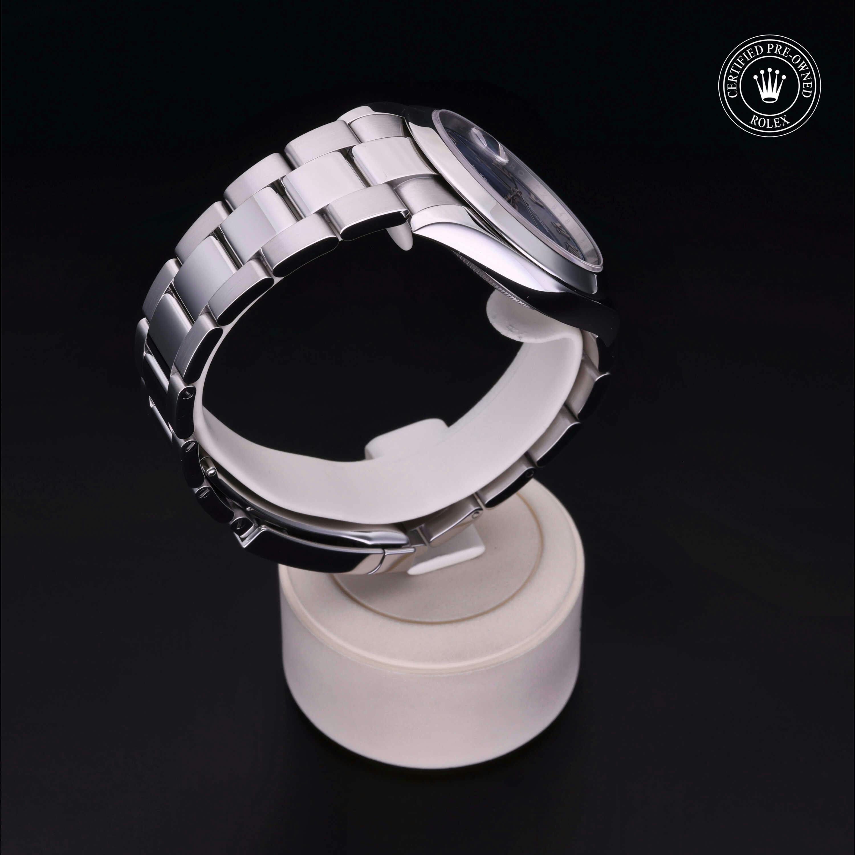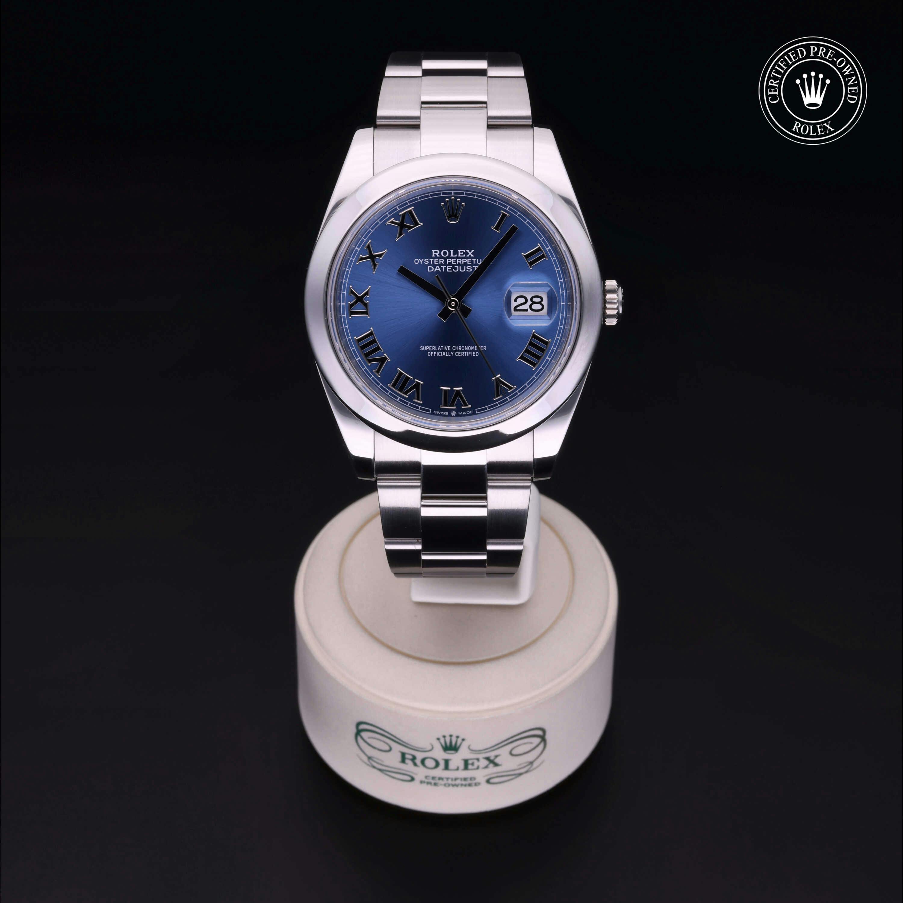 Rolex Certified Pre-Owned Datejust (126300) self - winding automatic watch, features a 41mm stainless steel case and smooth bezel surrounding an Azzurro blue dial on a stainless steel oyster bracelet. Functions include hours, minutes, seconds and date. This watch has received Rolex-authorized service and certification. It comes with the original box and papers, and includes a custom Rolex Certified Pre-Owned hang tag, travel pouch and RCPO international warranty card.