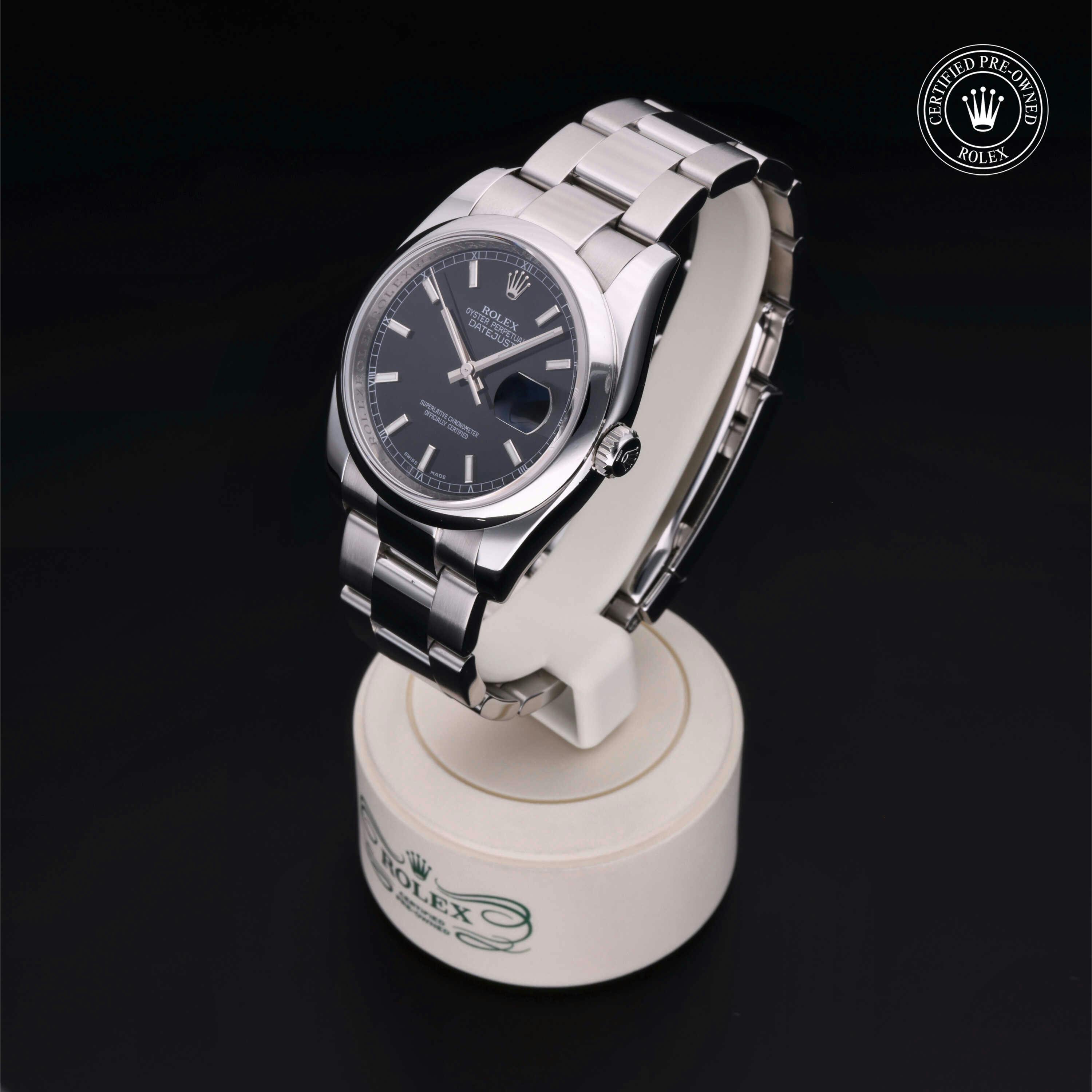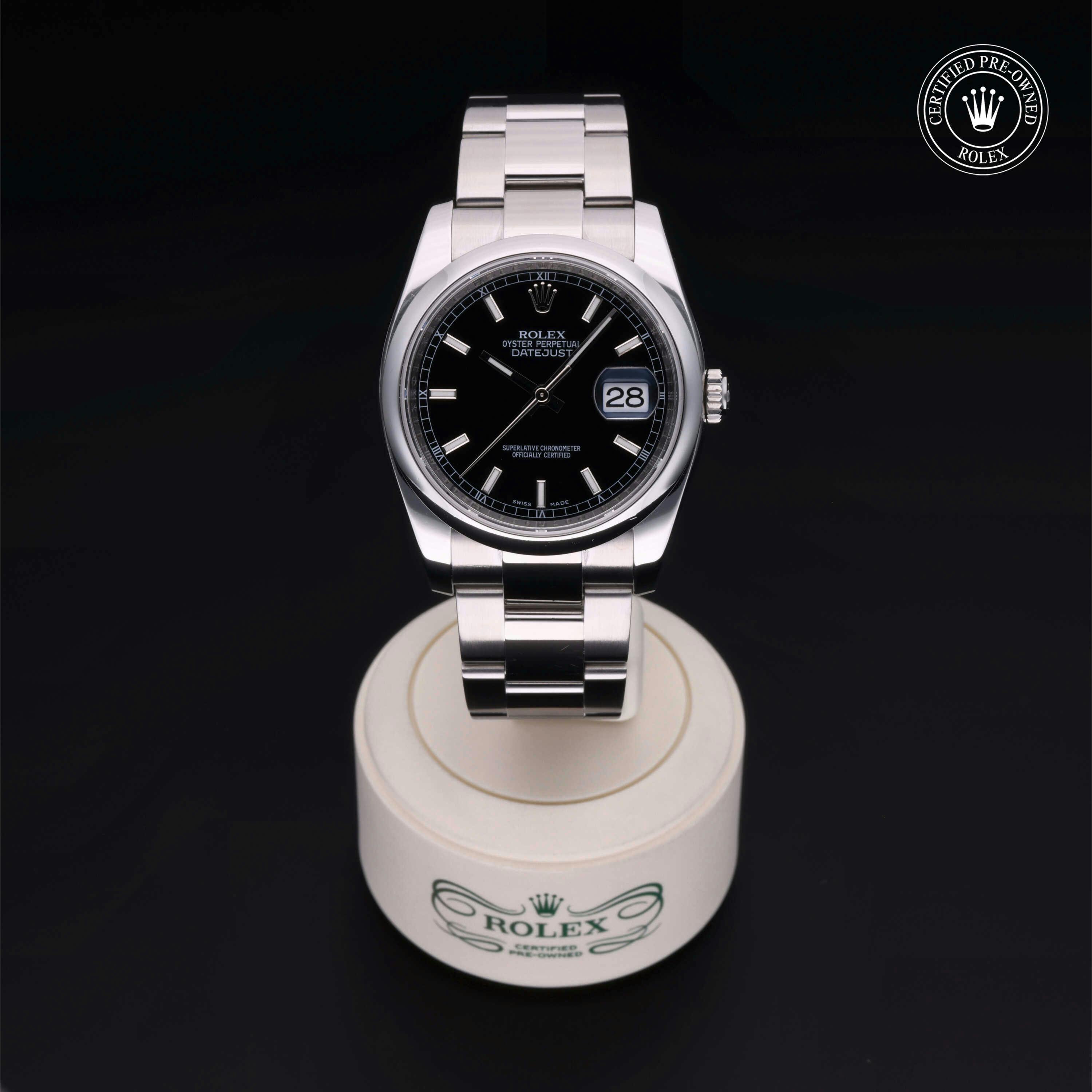 Rolex Certified Pre-Owned Datejust (116200) self - winding automatic watch, features a 36mm stainless steel case and domed bezel surrounding a black dial on a stainless steel oyster bracelet. Functions include hours, minutes, seconds and date. This watch has received Rolex-authorized service and certification. It does not come with the original box or papers, but includes a custom Rolex Certified Pre-Owned hang tag, travel pouch and RCPO international warranty card.