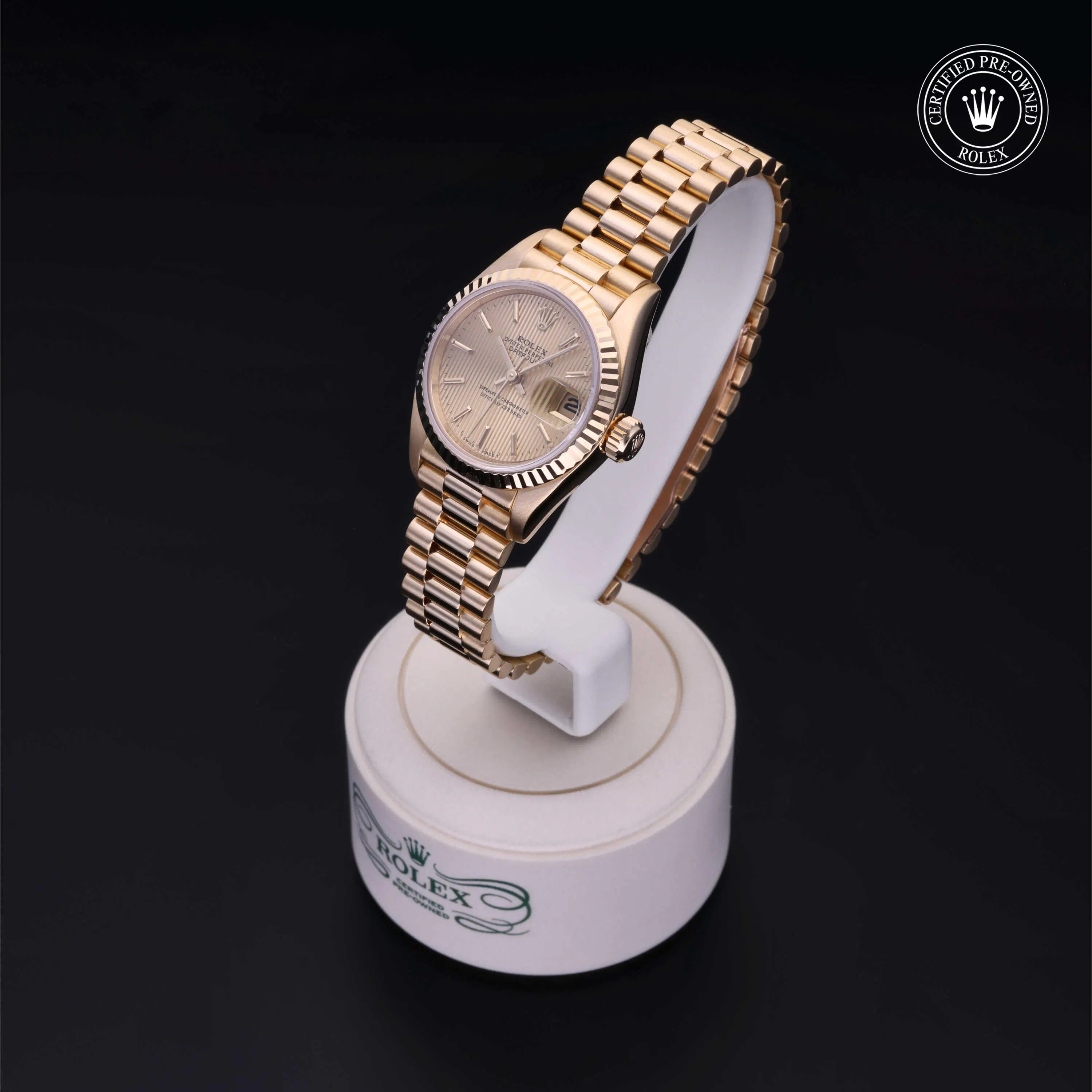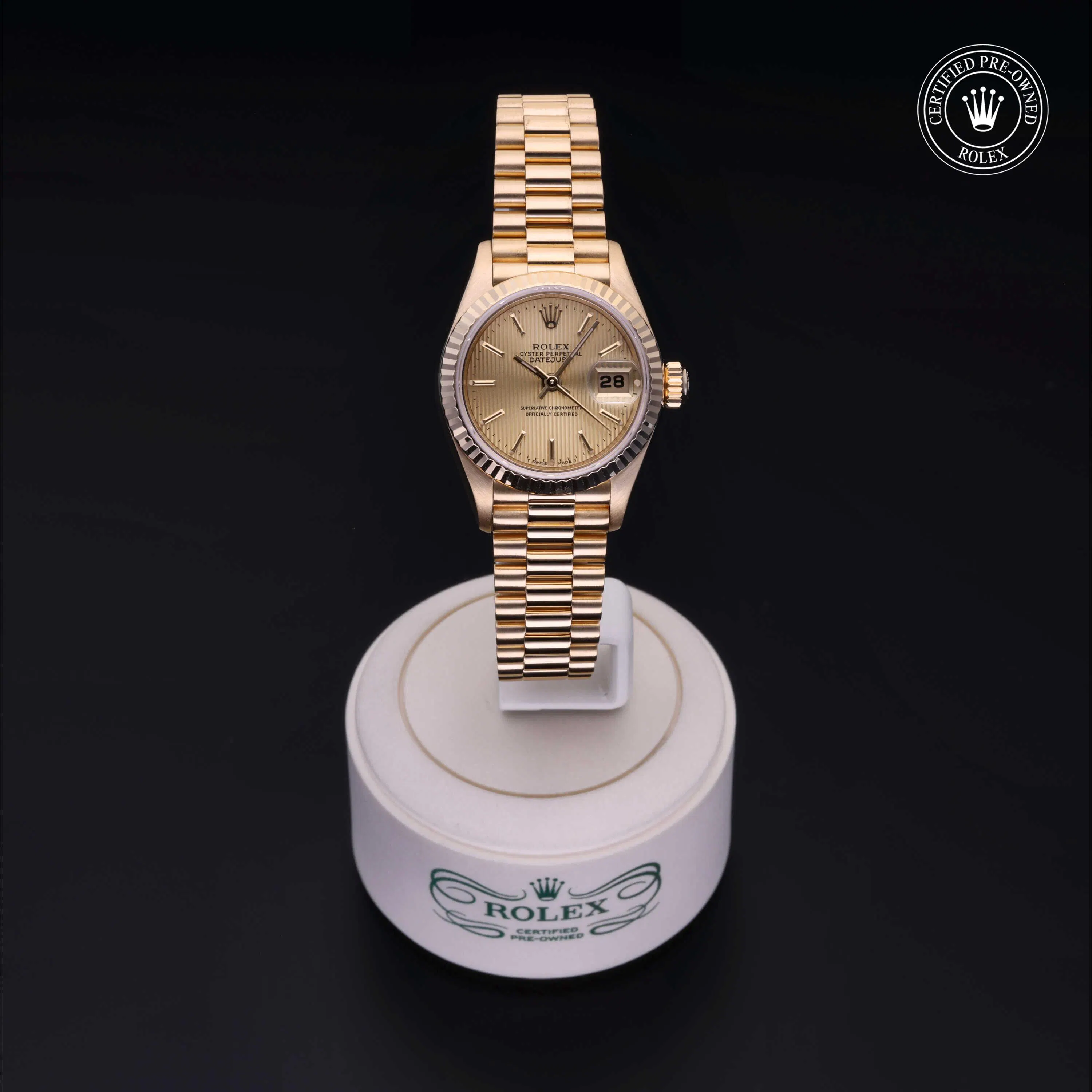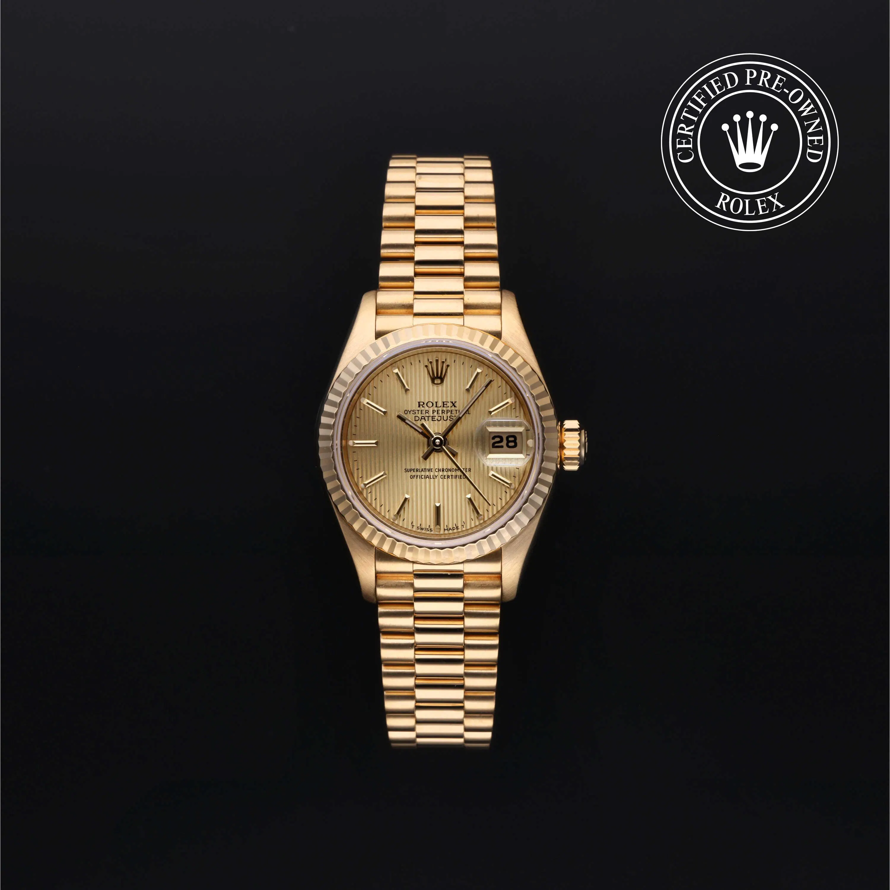 Rolex Certified Pre-Owned Datejust (69178) self - winding automatic watch, features a 26mm 18k yellow gold case and fluted bezel surrounding a champagne tapestry dial on an 18k yellow gold president bracelet. Functions include hours, minutes, seconds and date. This watch has received Rolex-authorized service and certification. It does not come with the original box or papers, but includes a custom Rolex Certified Pre-Owned hang tag, travel pouch and RCPO international warranty card.
