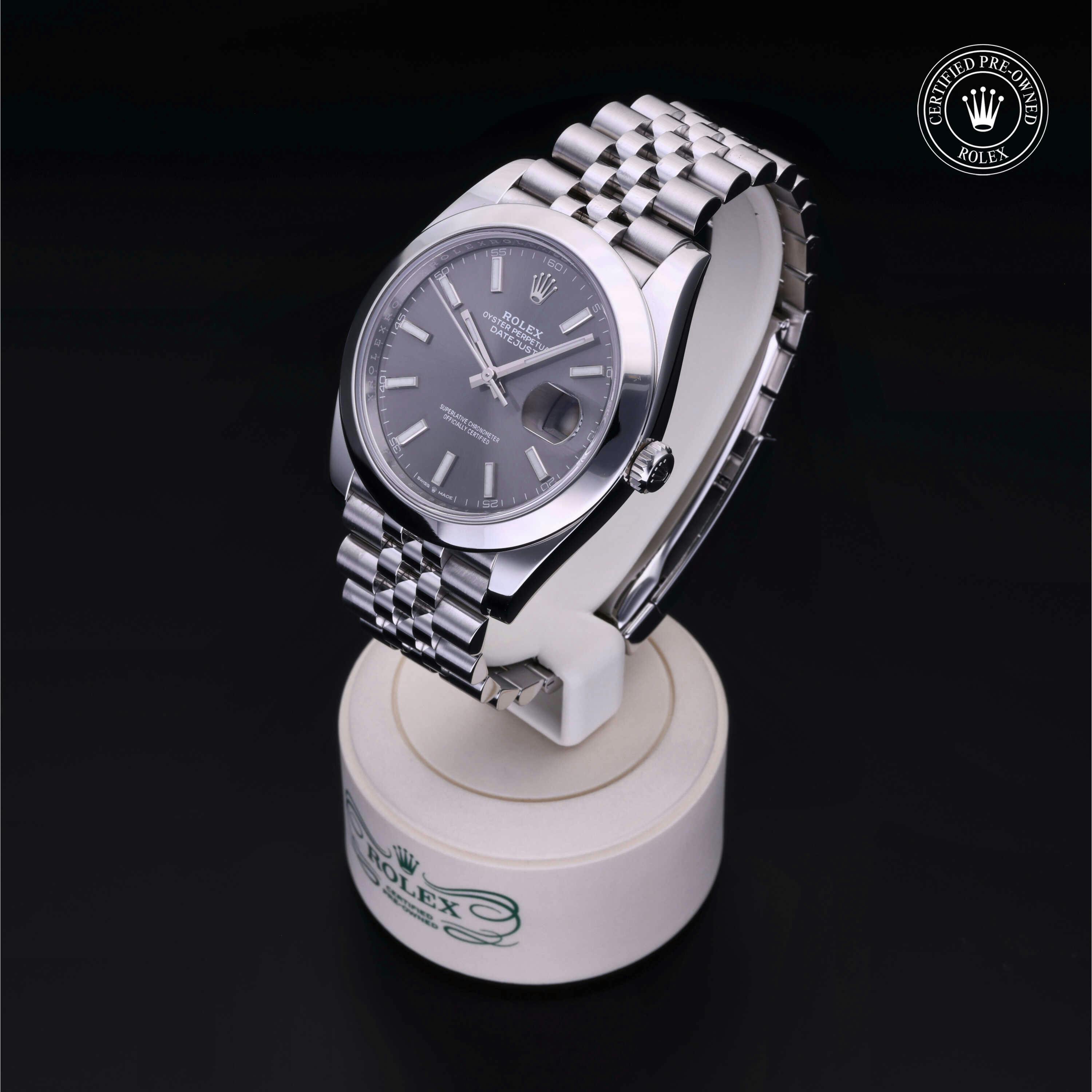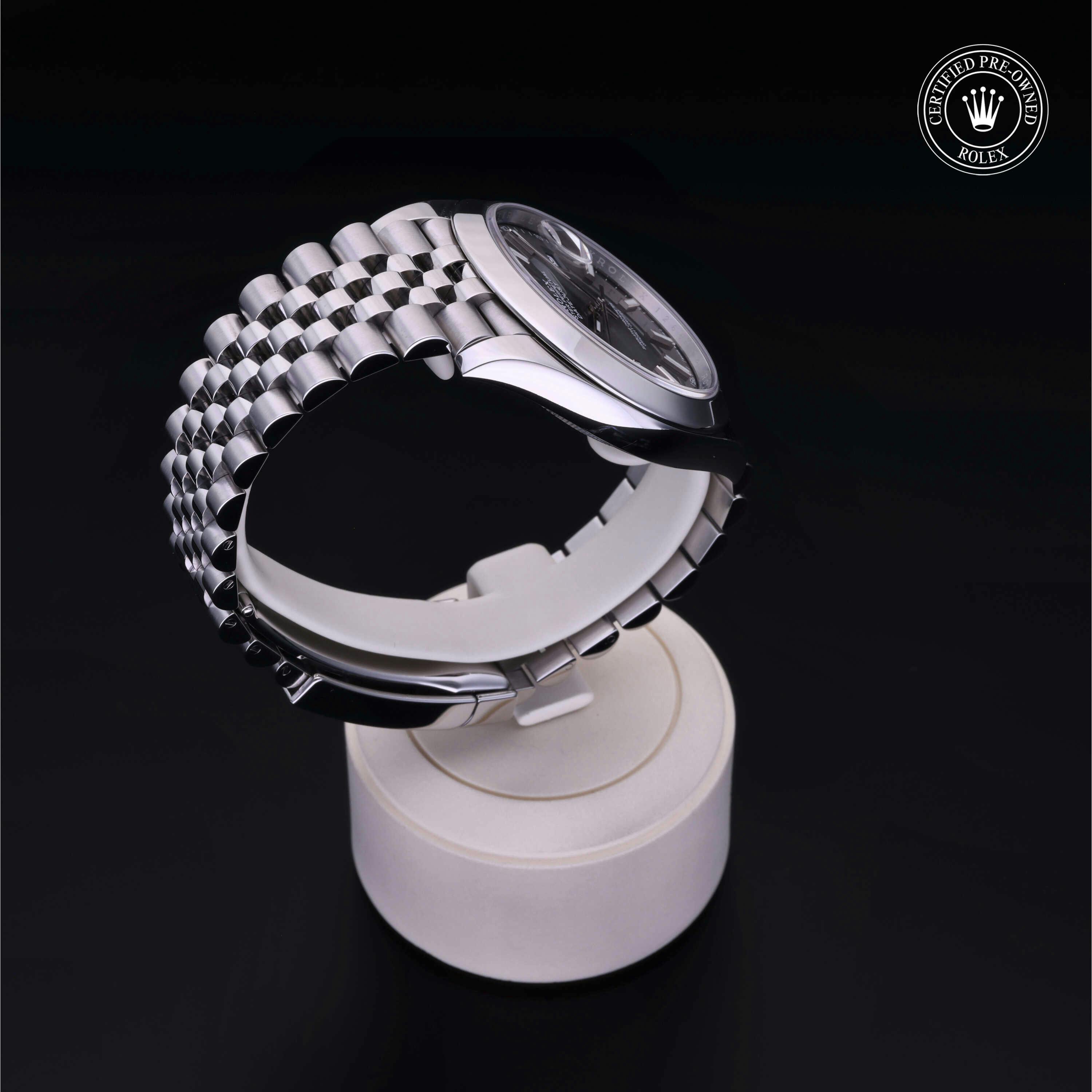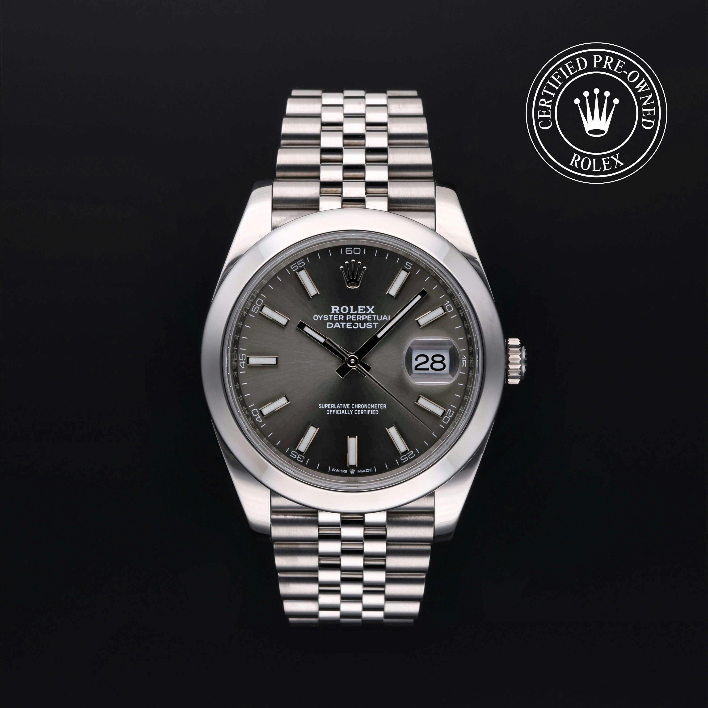 Rolex Certified Pre-Owned Datejust (126300) self - winding automatic watch, features a 41mm stainless steel case and smooth bezel surrounding a slate dial on a stainless steel oyster bracelet. Functions include hours, minutes, seconds and date. This watch has received Rolex-authorized service and certification. It comes with the original papers, and includes a custom Rolex Certified Pre-Owned hang tag, travel pouch and RCPO international warranty card.
