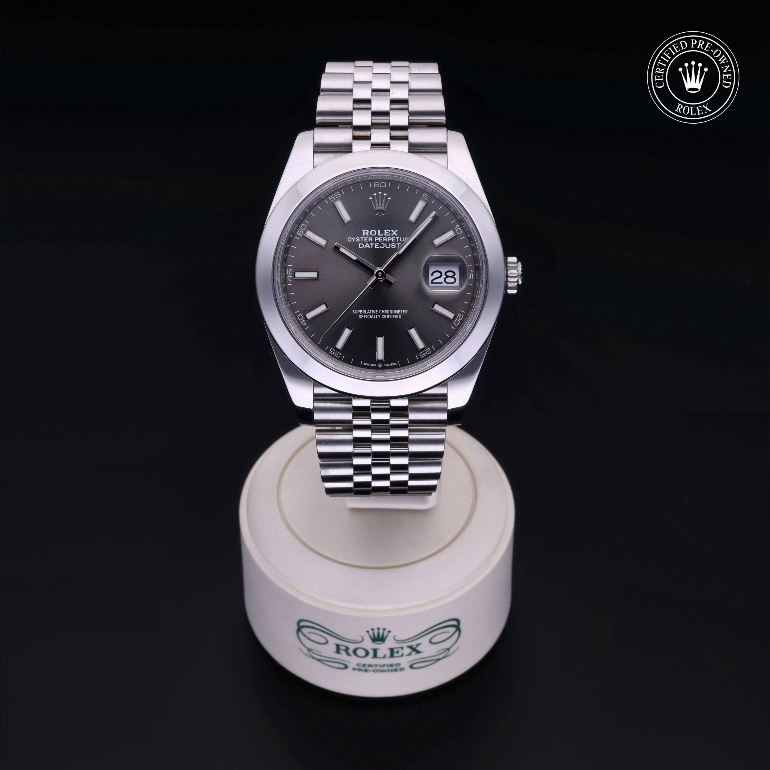 Rolex Certified Pre-Owned Datejust (126300) self - winding automatic watch, features a 41mm stainless steel case and smooth bezel surrounding a slate dial on a stainless steel oyster bracelet. Functions include hours, minutes, seconds and date. This watch has received Rolex-authorized service and certification. It comes with the original papers, and includes a custom Rolex Certified Pre-Owned hang tag, travel pouch and RCPO international warranty card.