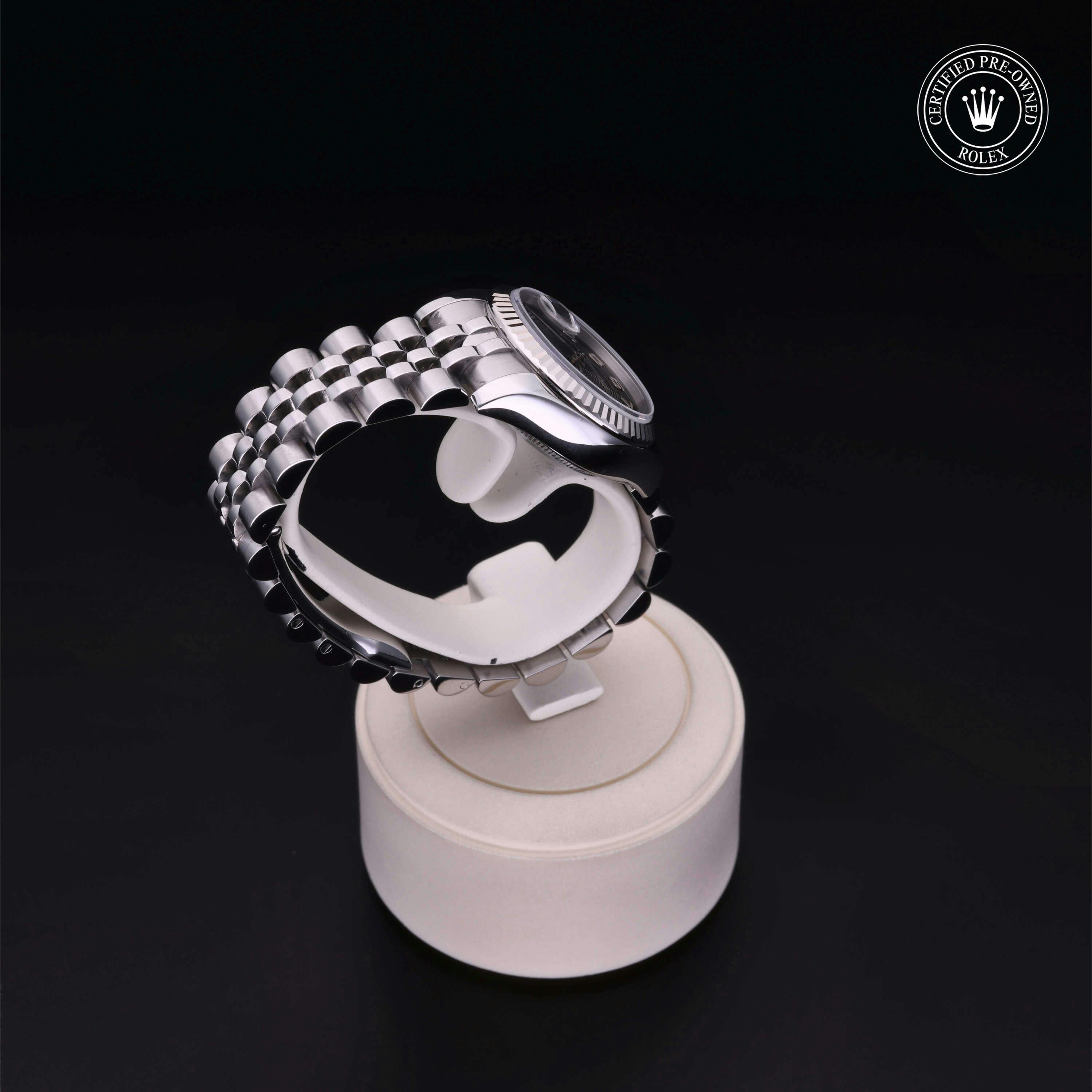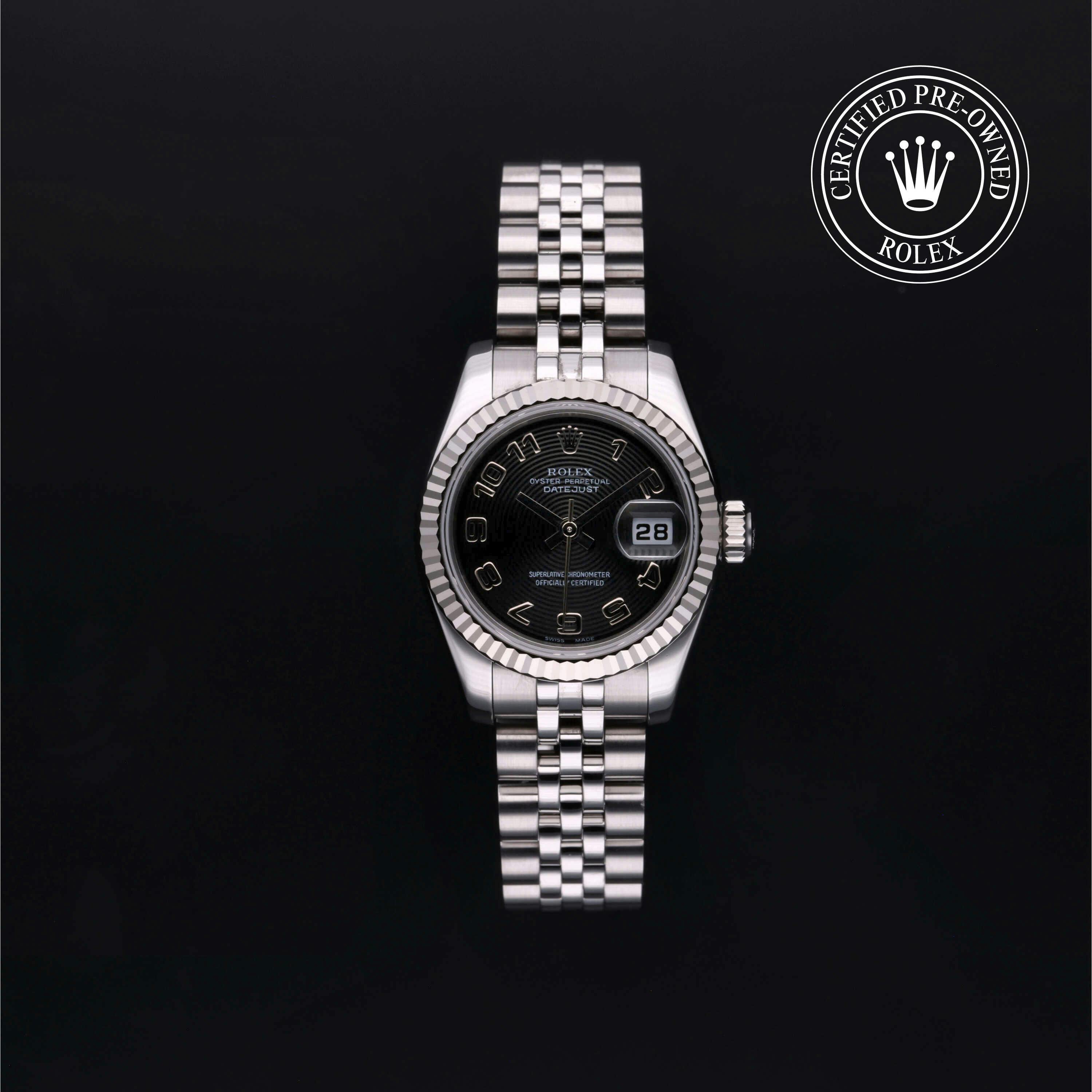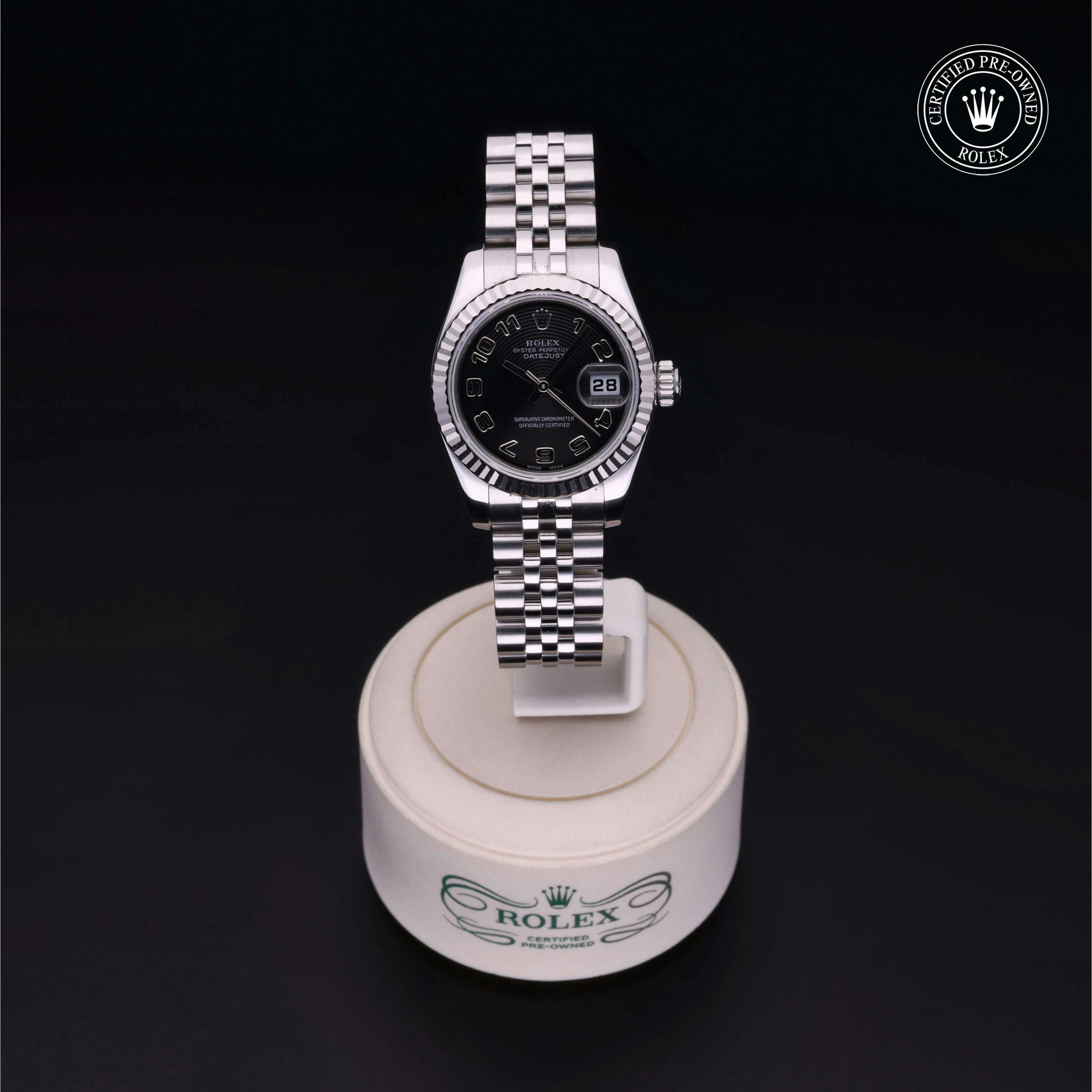 Rolex Certified Pre-Owned Datejust (179174) self - winding automatic watch, features a 26mm stainless steel case with an 18k white gold fluted bezel surrounding a black concentric dial on a stainless steel jubilee bracelet. Functions include hours and minutes. This watch has received Rolex-authorized service and certification. It does not come with the original box or papers, but includes a custom Rolex Certified Pre-Owned hang tag, travel pouch and RCPO international warranty card.