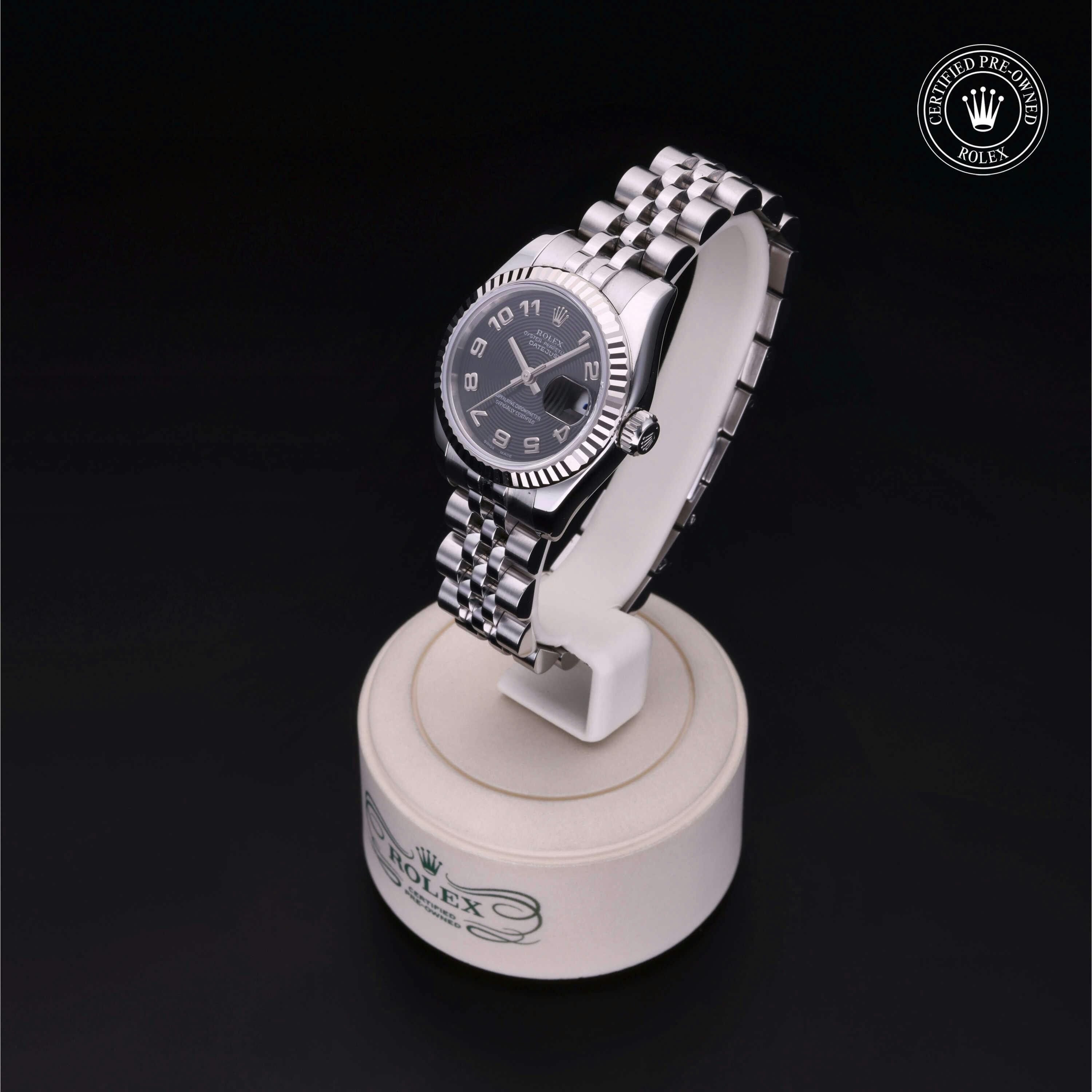 Rolex Certified Pre-Owned Datejust (179174) self - winding automatic watch, features a 26mm stainless steel case with an 18k white gold fluted bezel surrounding a black concentric dial on a stainless steel jubilee bracelet. Functions include hours and minutes. This watch has received Rolex-authorized service and certification. It does not come with the original box or papers, but includes a custom Rolex Certified Pre-Owned hang tag, travel pouch and RCPO international warranty card.