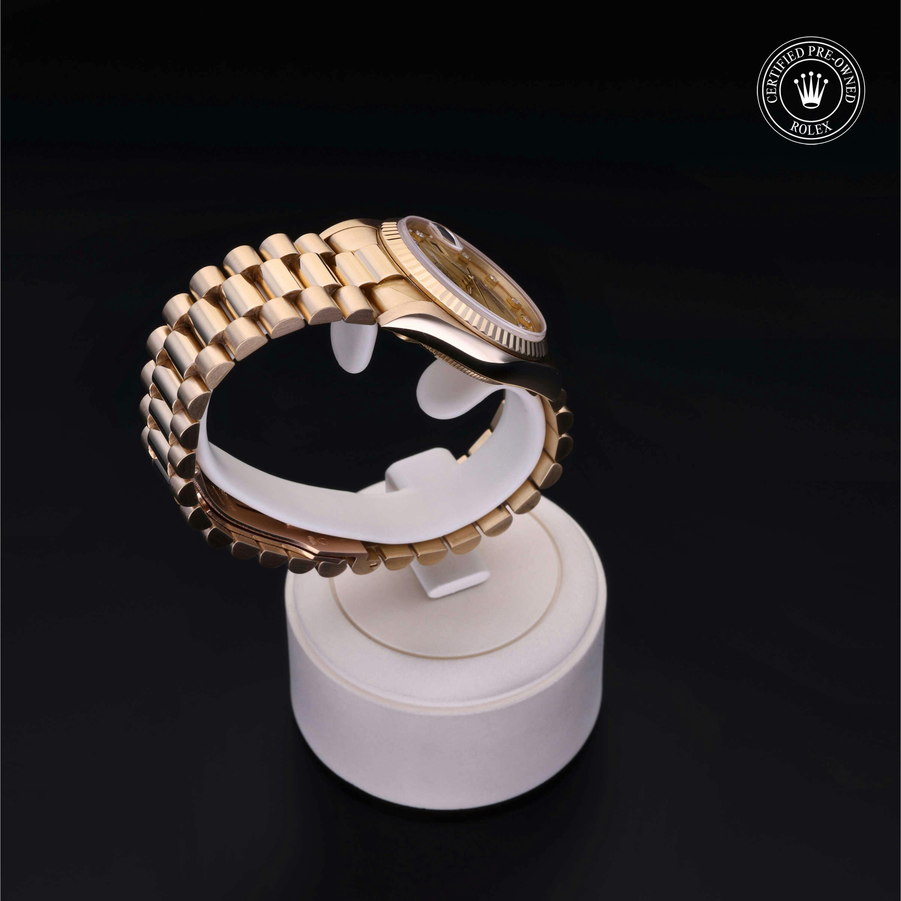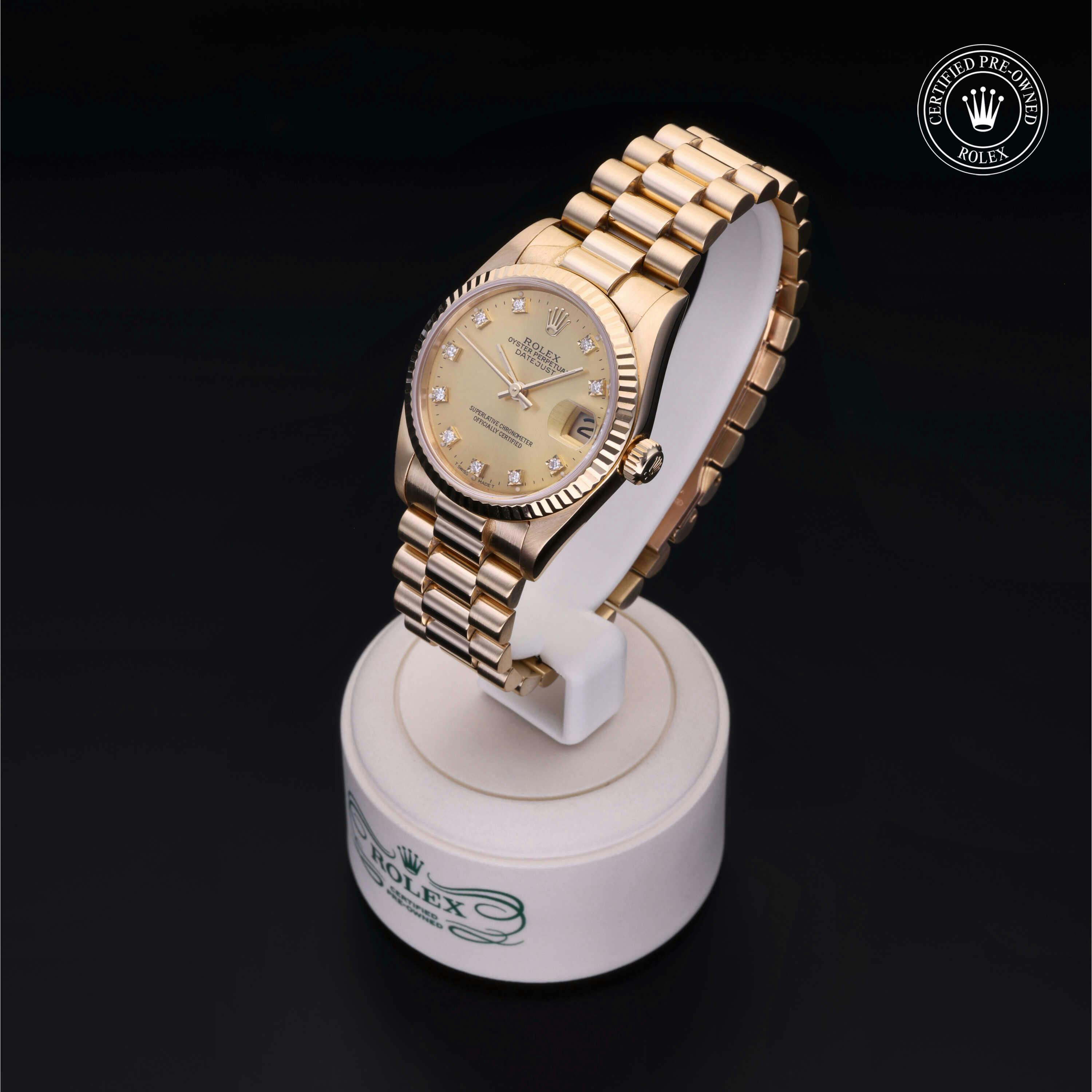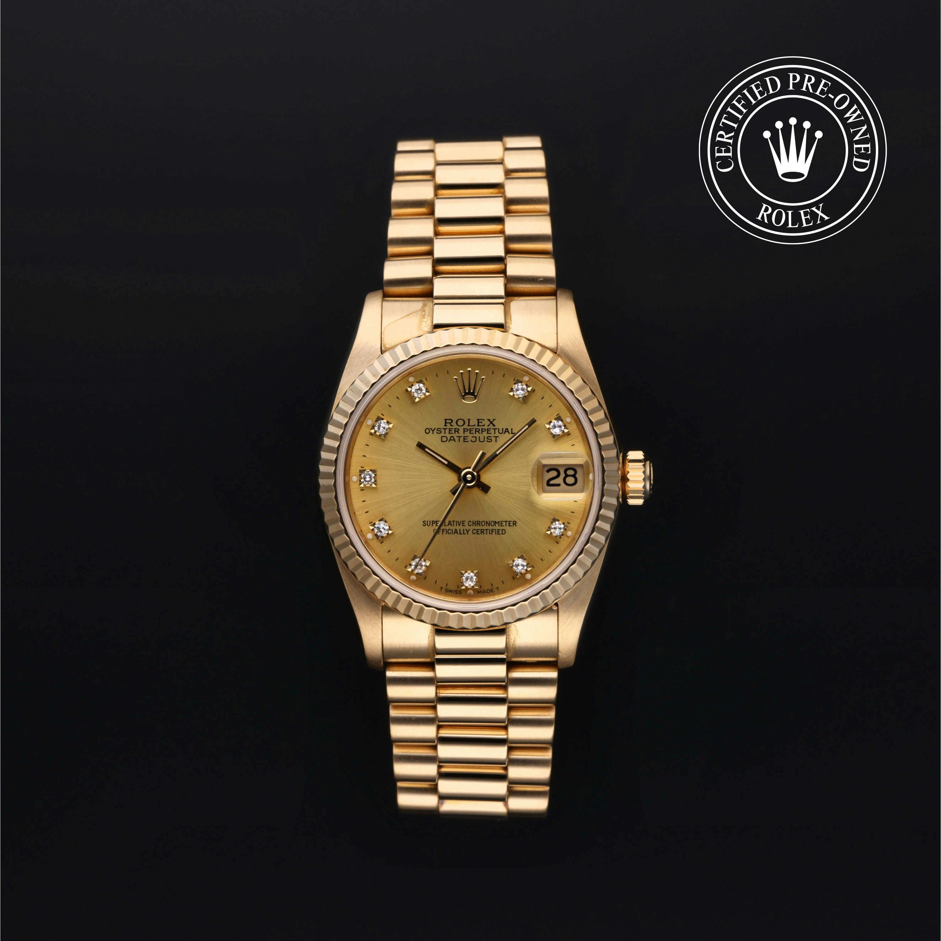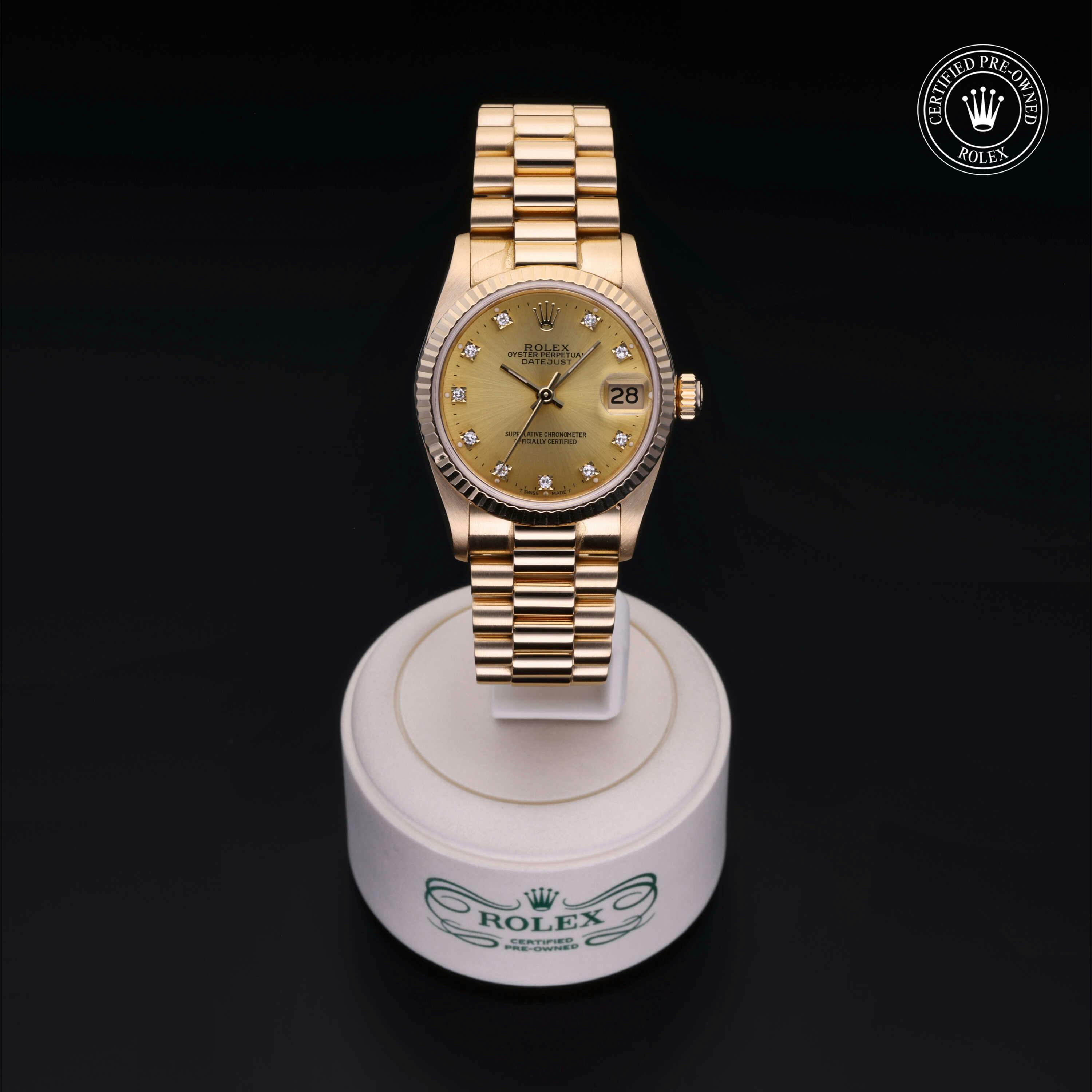 Rolex Certified Pre-Owned Datejust (68278) self - winding automatic watch, features a 31mm 18k yellow gold case and fluted bezel surrounding a champagne diamond set dial on an 18k yellow gold president bracelet. Functions include hours, minutes, seconds and date. This watch has received Rolex-authorized service and certification. It does not come with the original box or papers, but includes a custom Rolex Certified Pre-Owned hang tag, travel pouch and RCPO international warranty card.