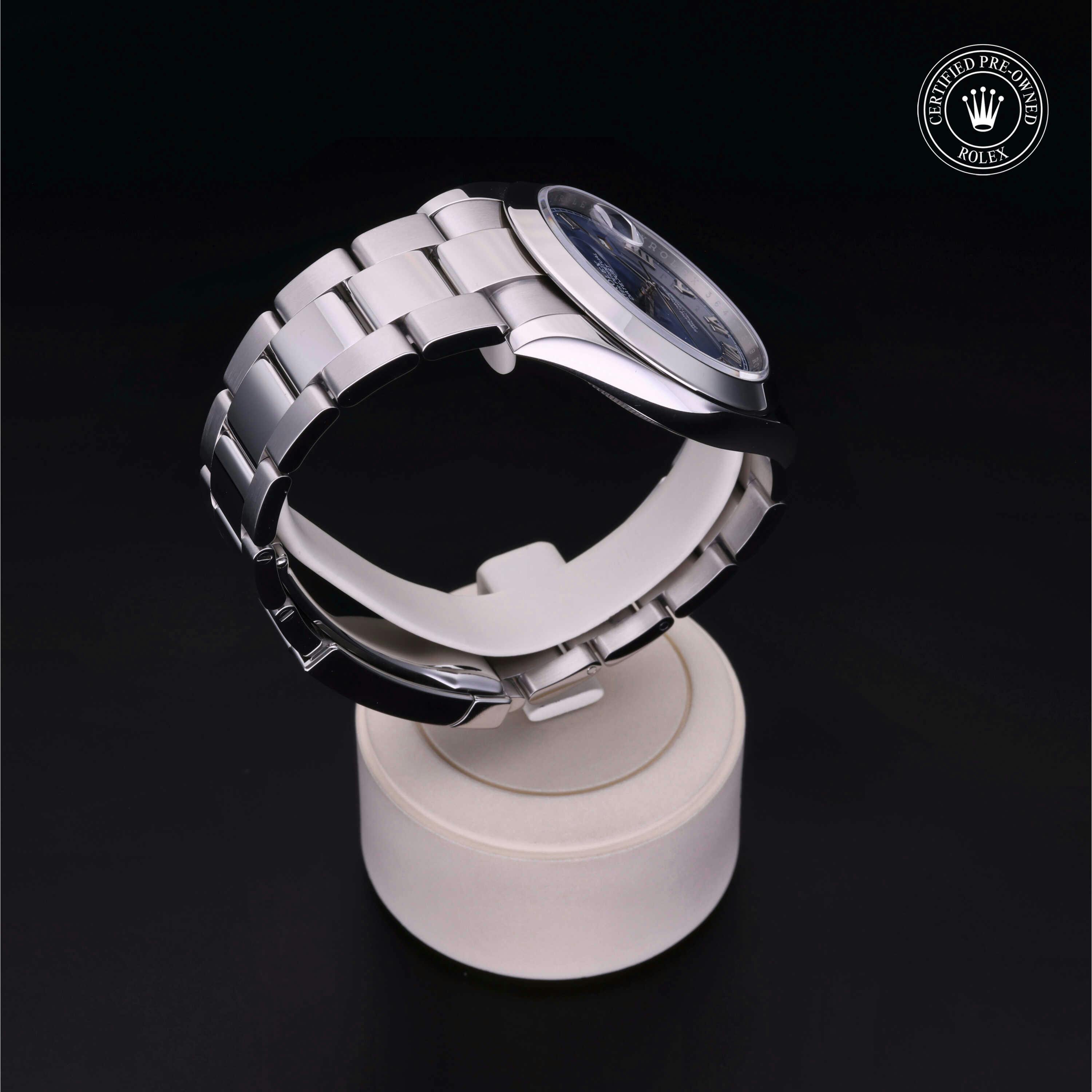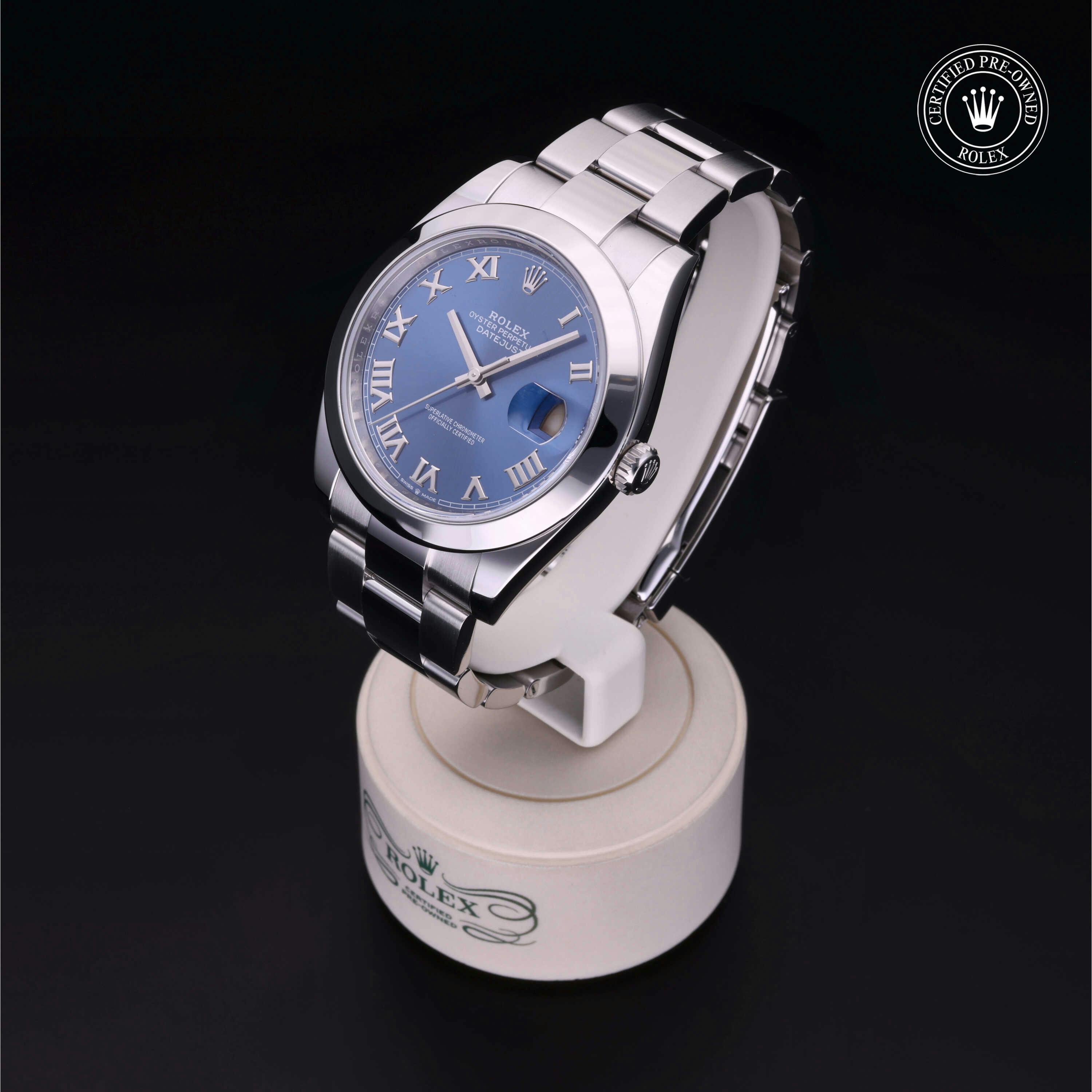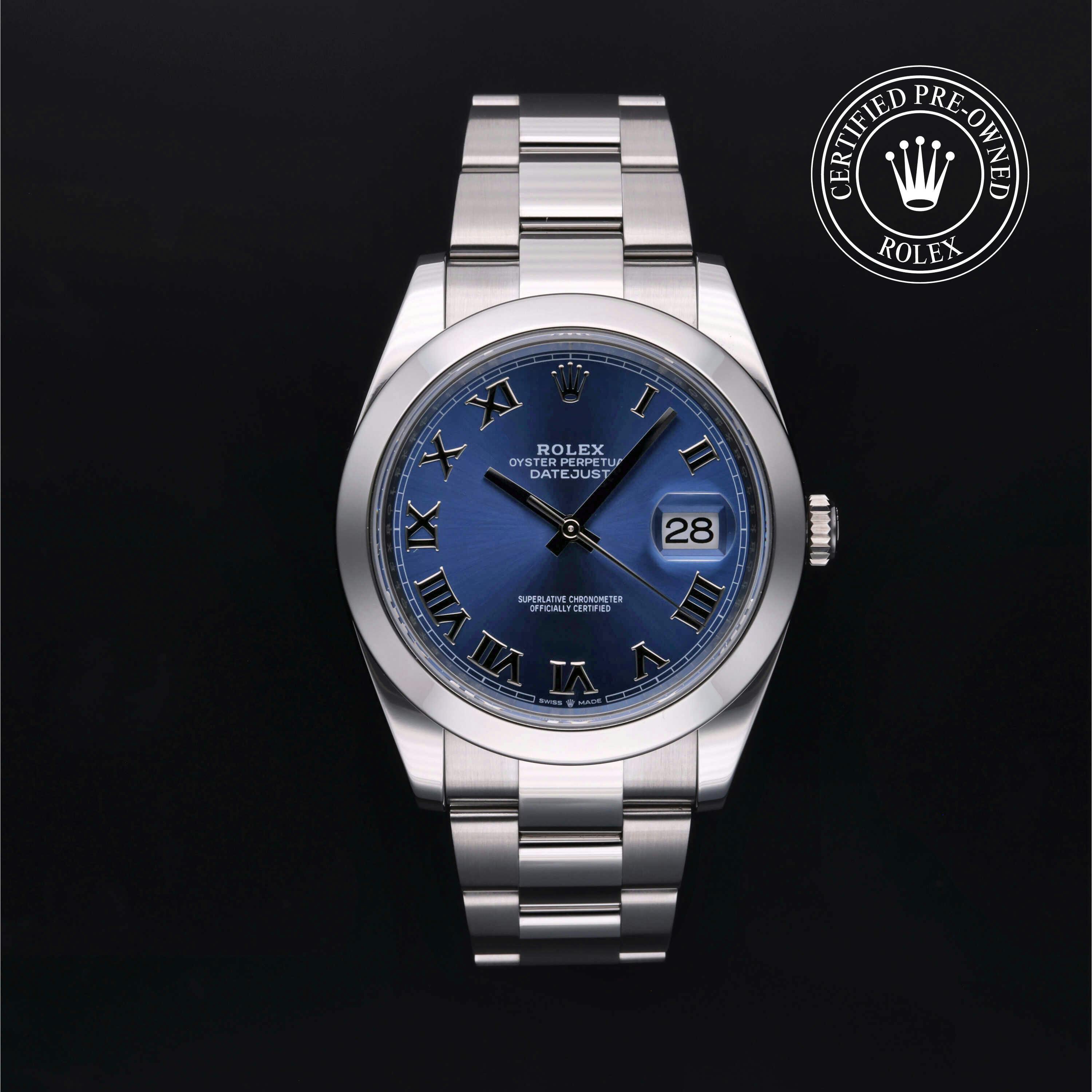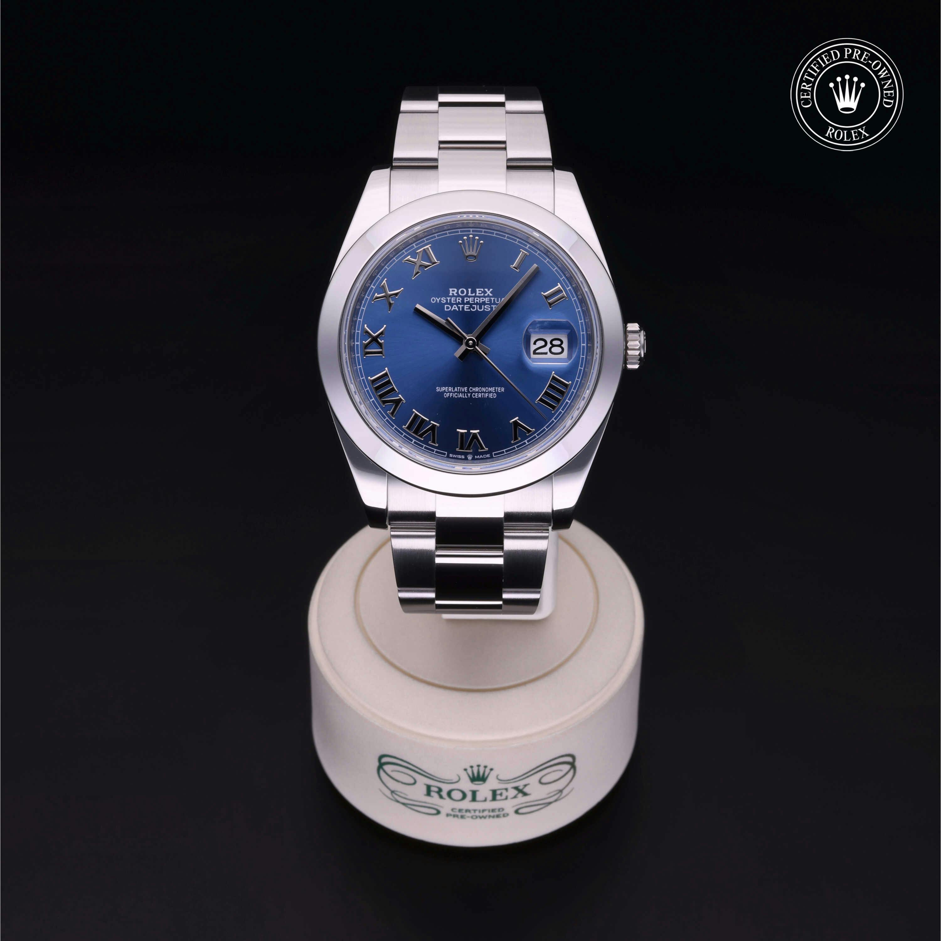 Rolex Certified Pre-Owned Datejust (126300) self - winding automatic watch, features a 41mm stainless steel case and smooth bezel surrounding an Azzurro blue dial on a stainless steel oyster bracelet. Functions include hours, minutes, seconds and date. This watch has received Rolex-authorized service and certification. It comes with the original box and papers, and includes a custom Rolex Certified Pre-Owned hang tag, travel pouch and RCPO international warranty card.