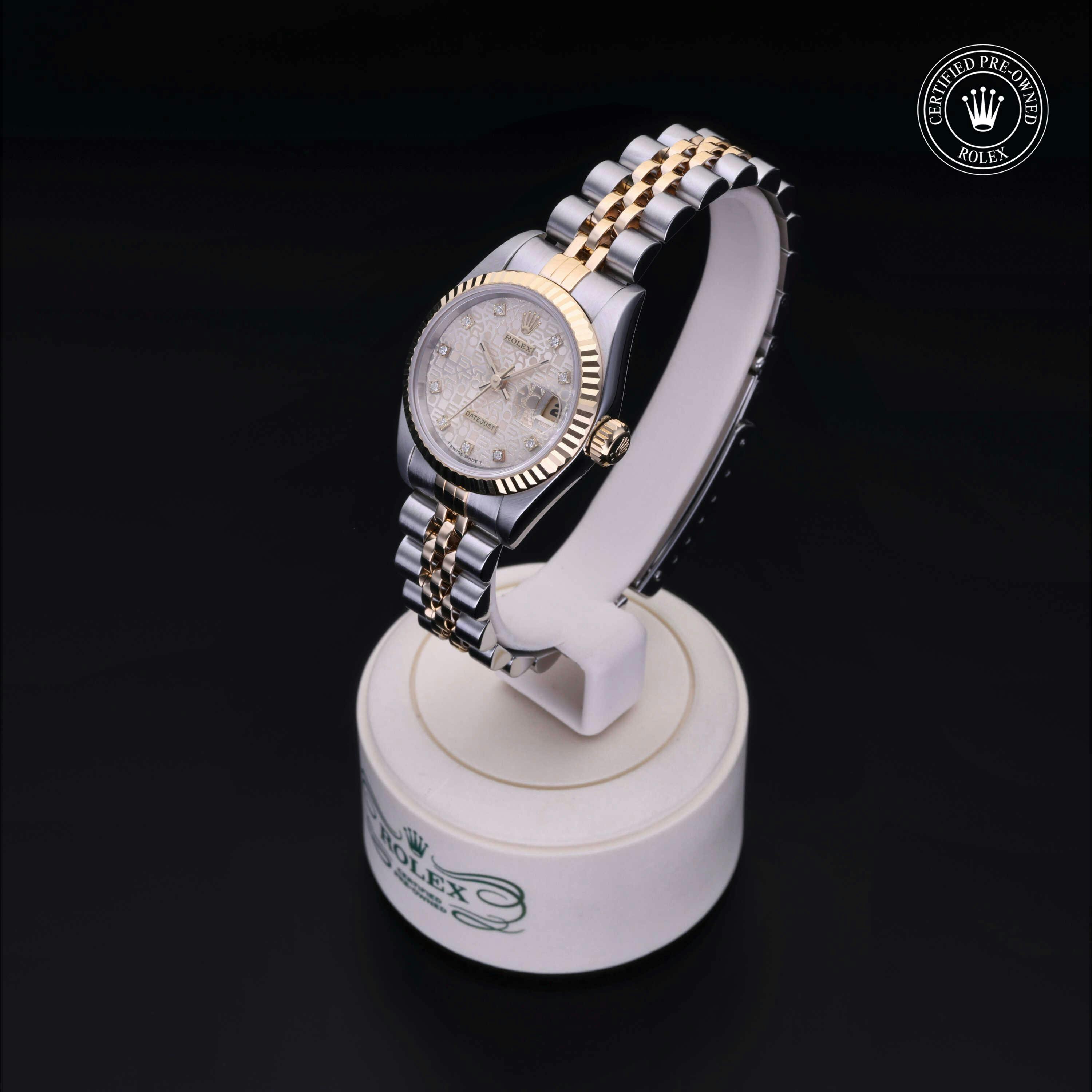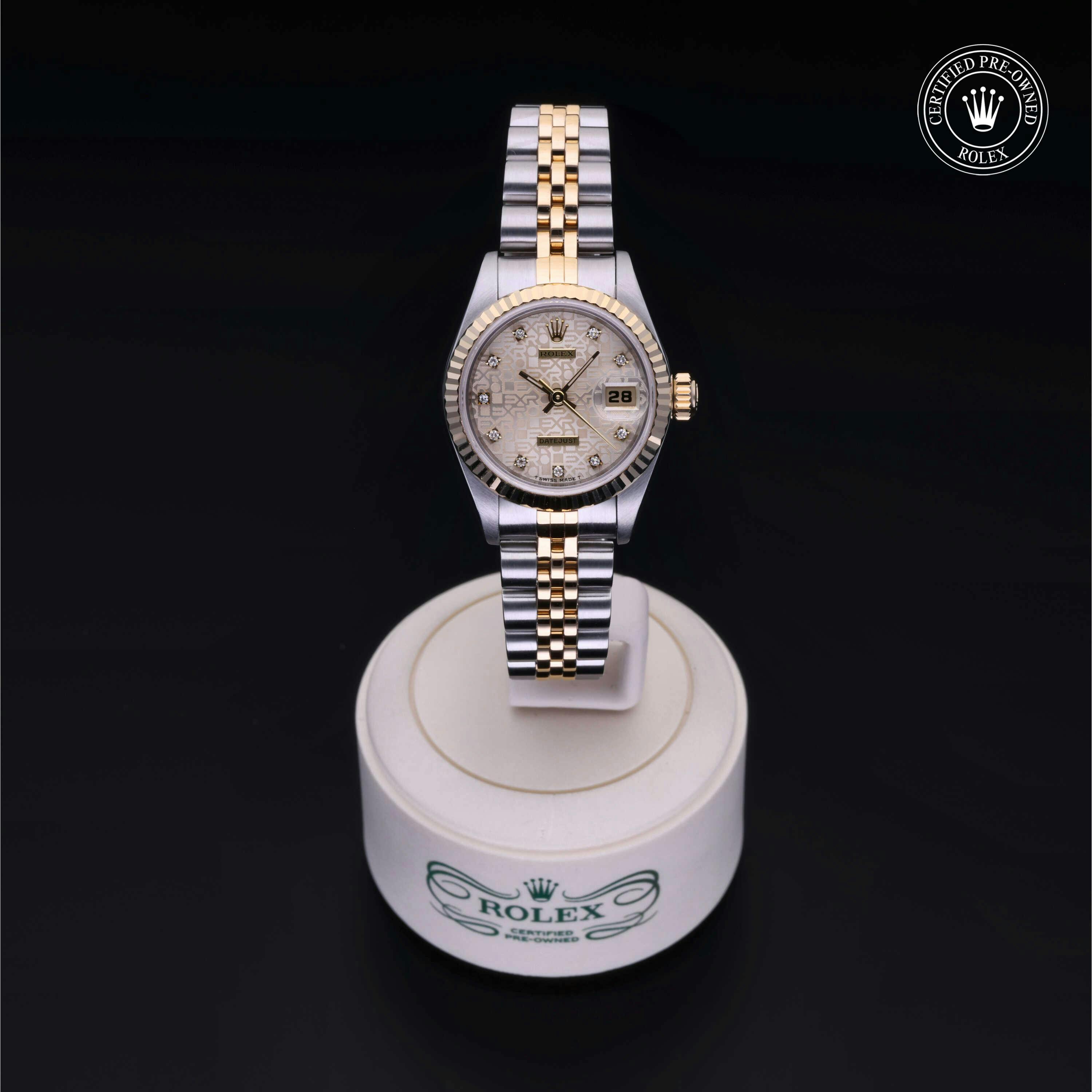 Rolex Certified Pre-Owned Datejust (69173) self - winding automatic watch, features a 26mm stainless steel case with an 18k yellow gold fluted bezel surrounding a silver Jubilee patern diamond set dial. The watch is secured on a stainless steel and 18k yellow gold Jubilee bracelet complete with a folding buckle. Functions include hours, minutes, seconds and date. This watch has been serviced by an authorized service center and certified by Rolex. It does not come with the original box or papers, but includes a custom Rolex Certified Pre-Owned hang tag, travel pouch and international warranty card.