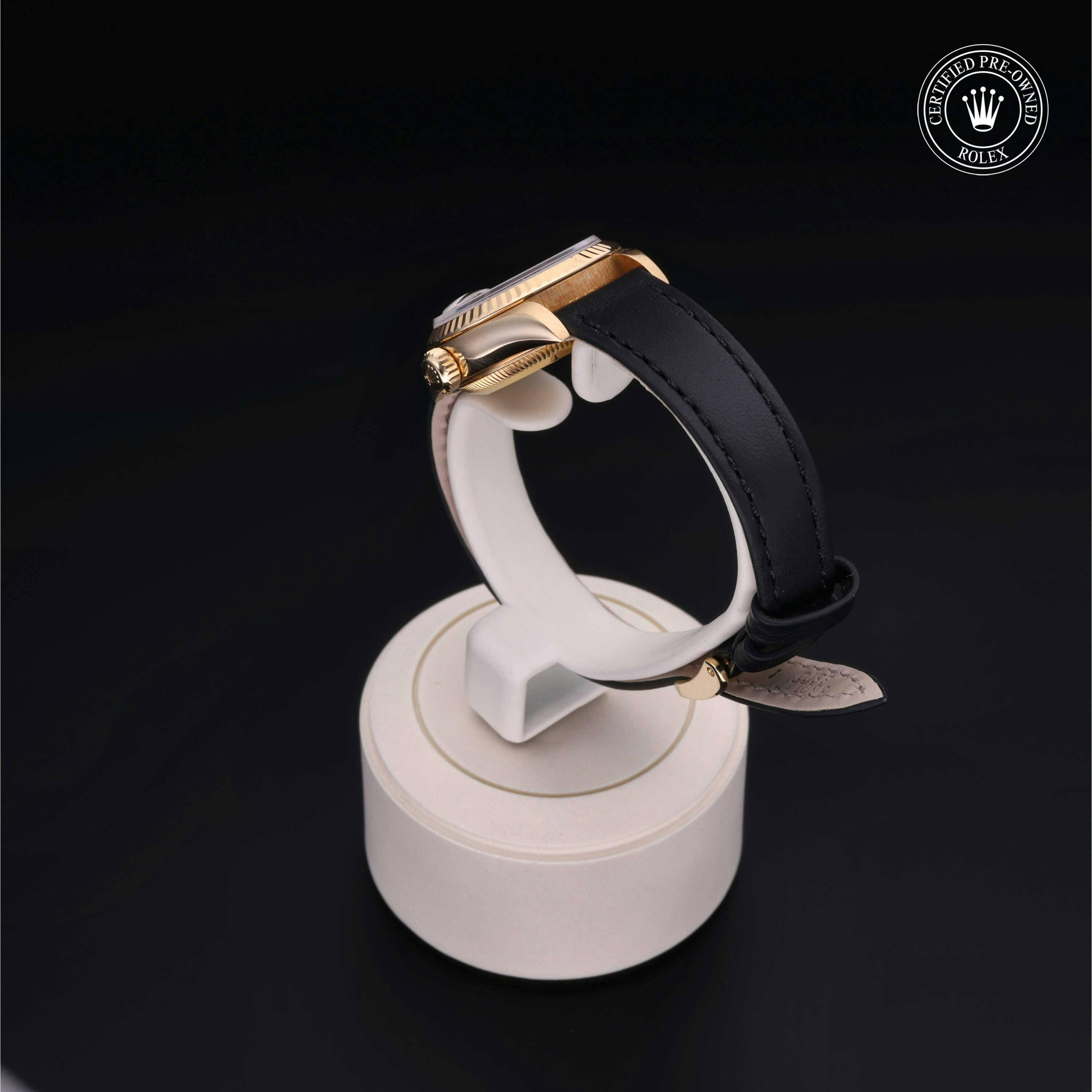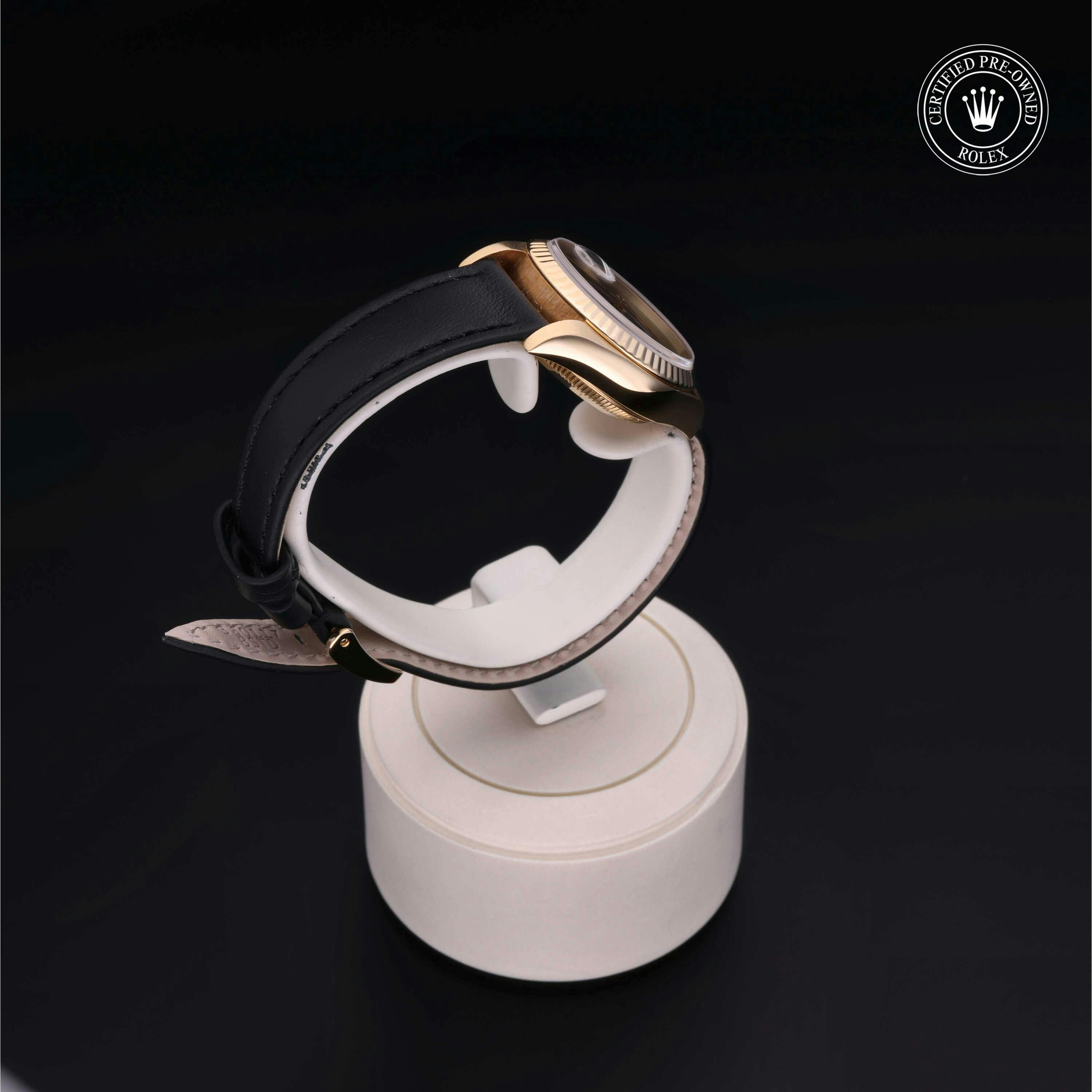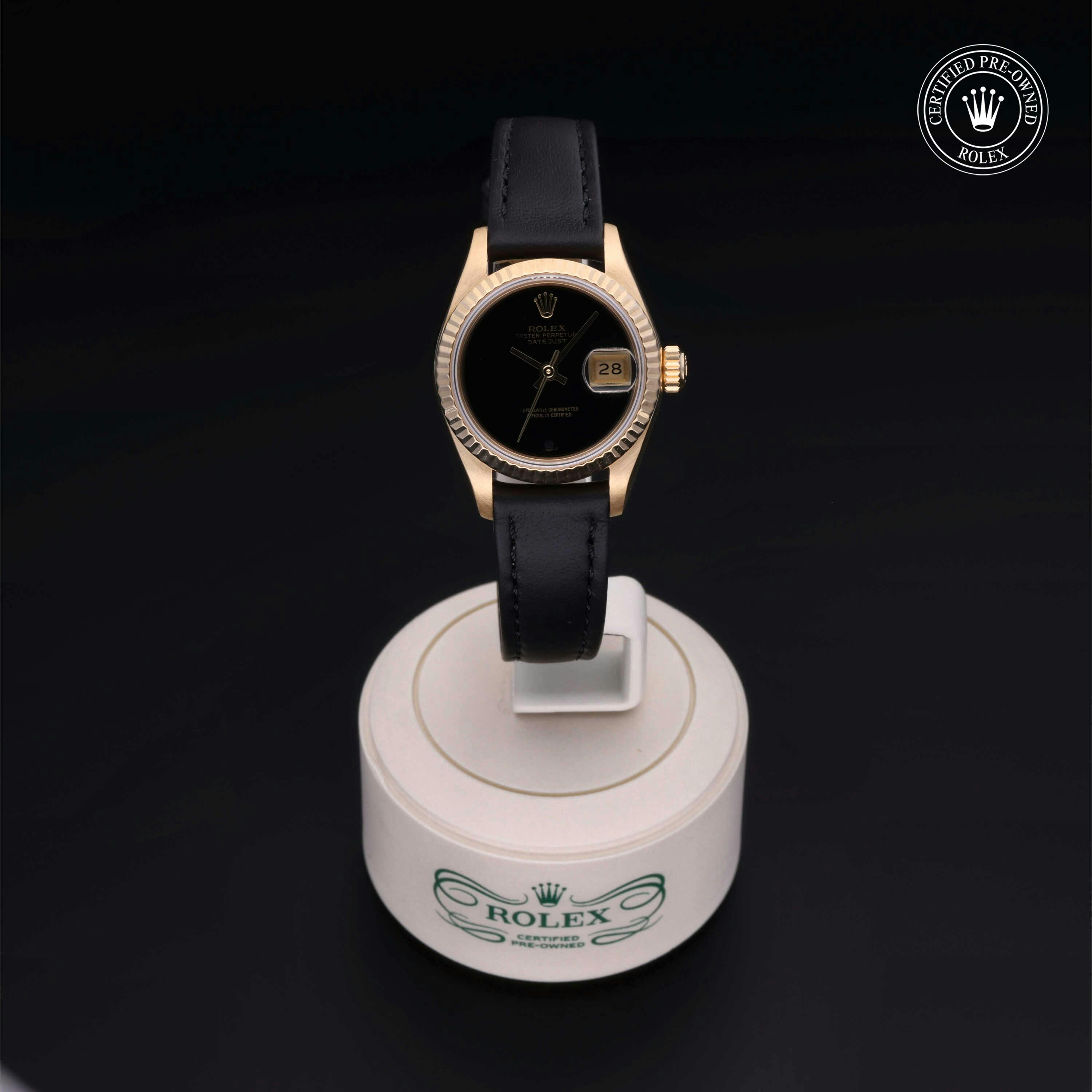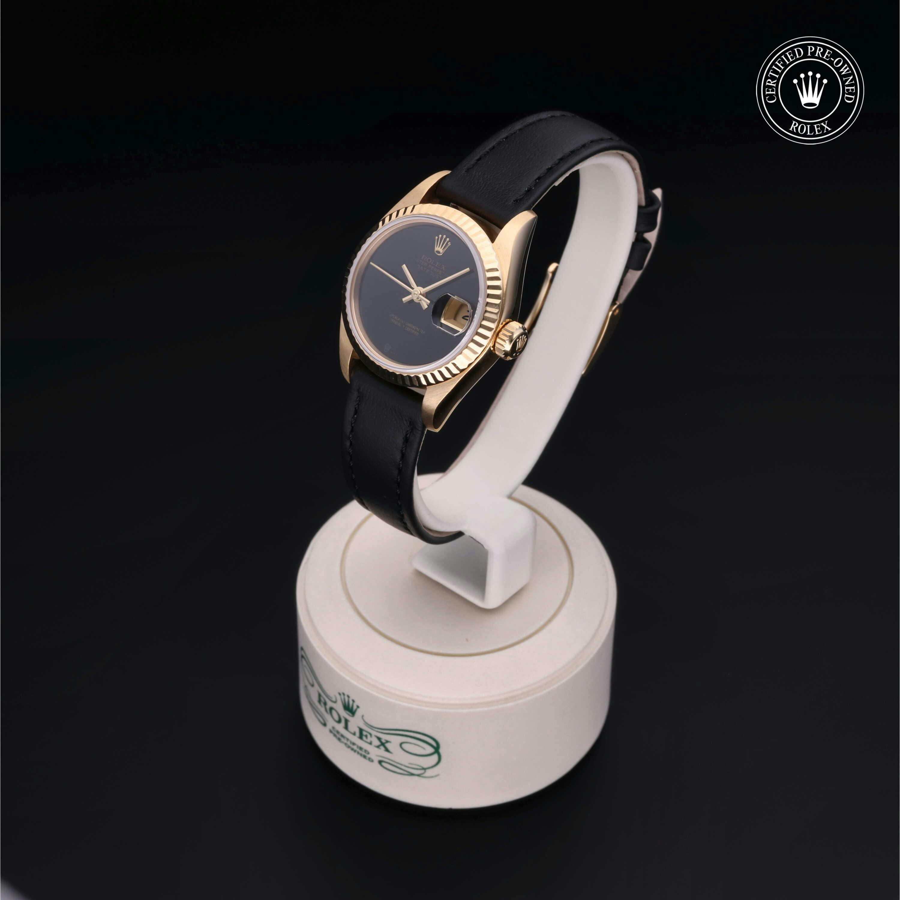 Rolex Certified Pre-Owned Datejust (69178) self - winding automatic watch, features a 26mm 18k yellow gold case and fluted bezel surrounding a black onyx dial on a black leather strap with an 18k yellow gold tang buckle. Functions include hours, minutes, seconds and date. This watch has received Rolex-authorized service and certification. It does not come with the original box or papers, but includes a custom Rolex Certified Pre-Owned hang tag, travel pouch and RCPO international warranty card.