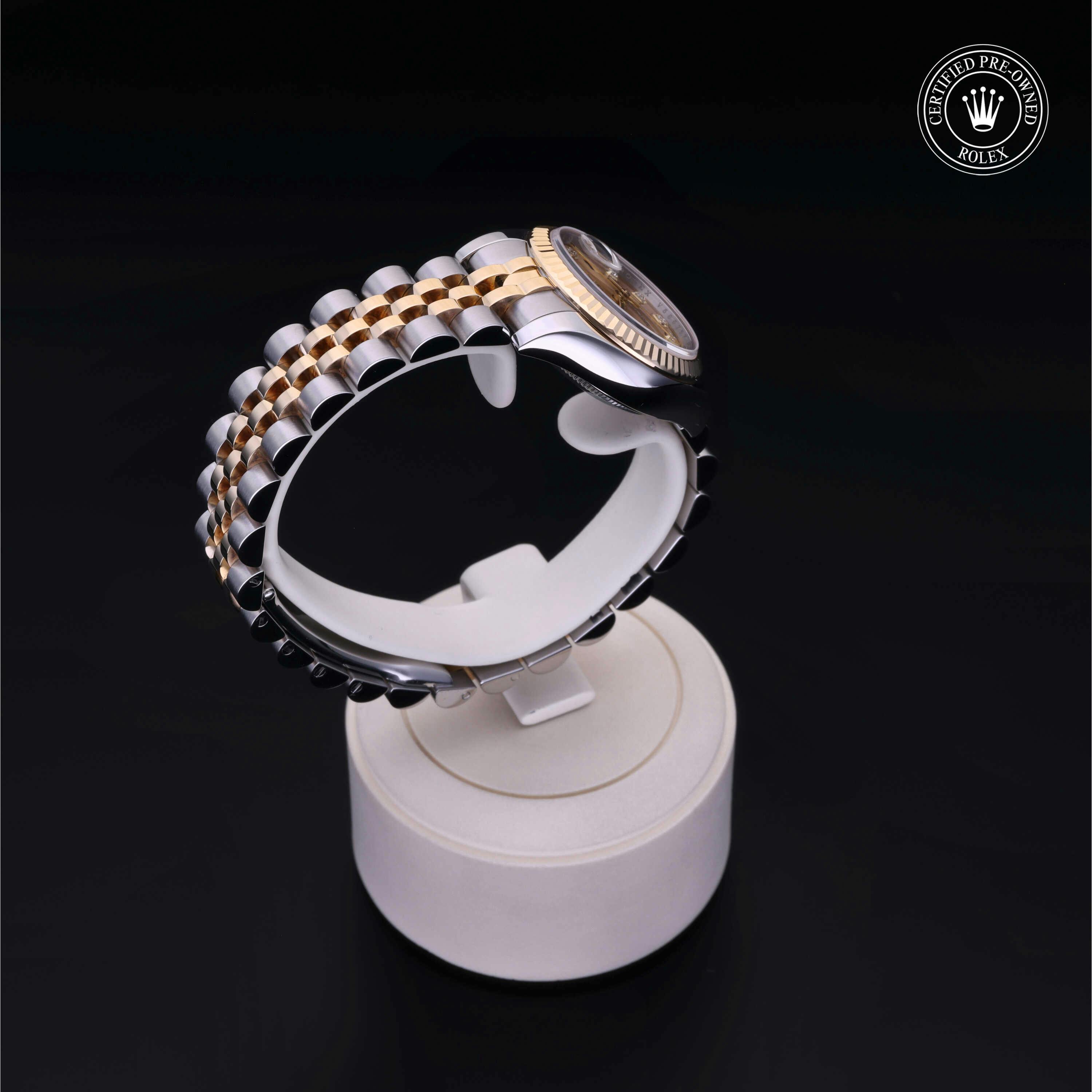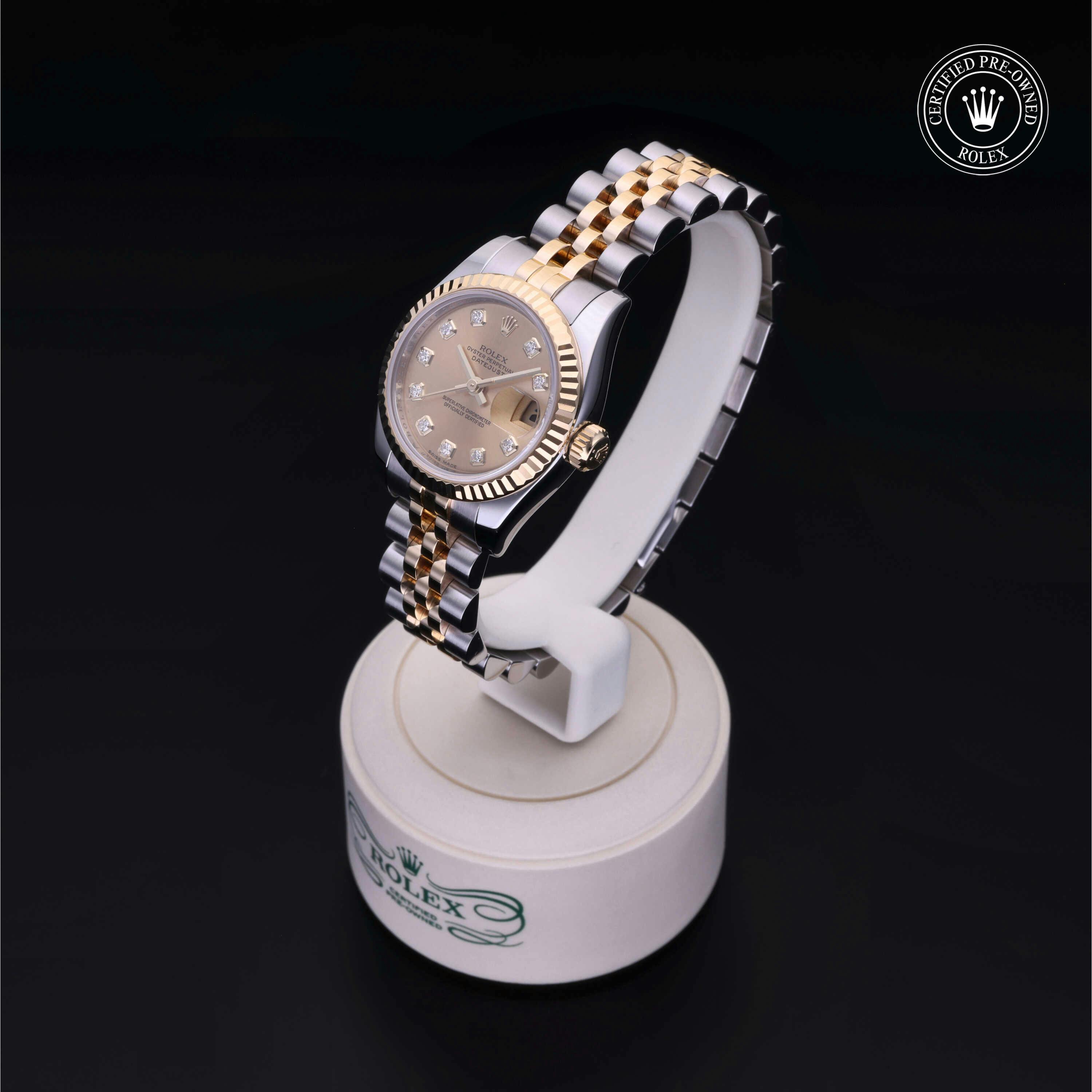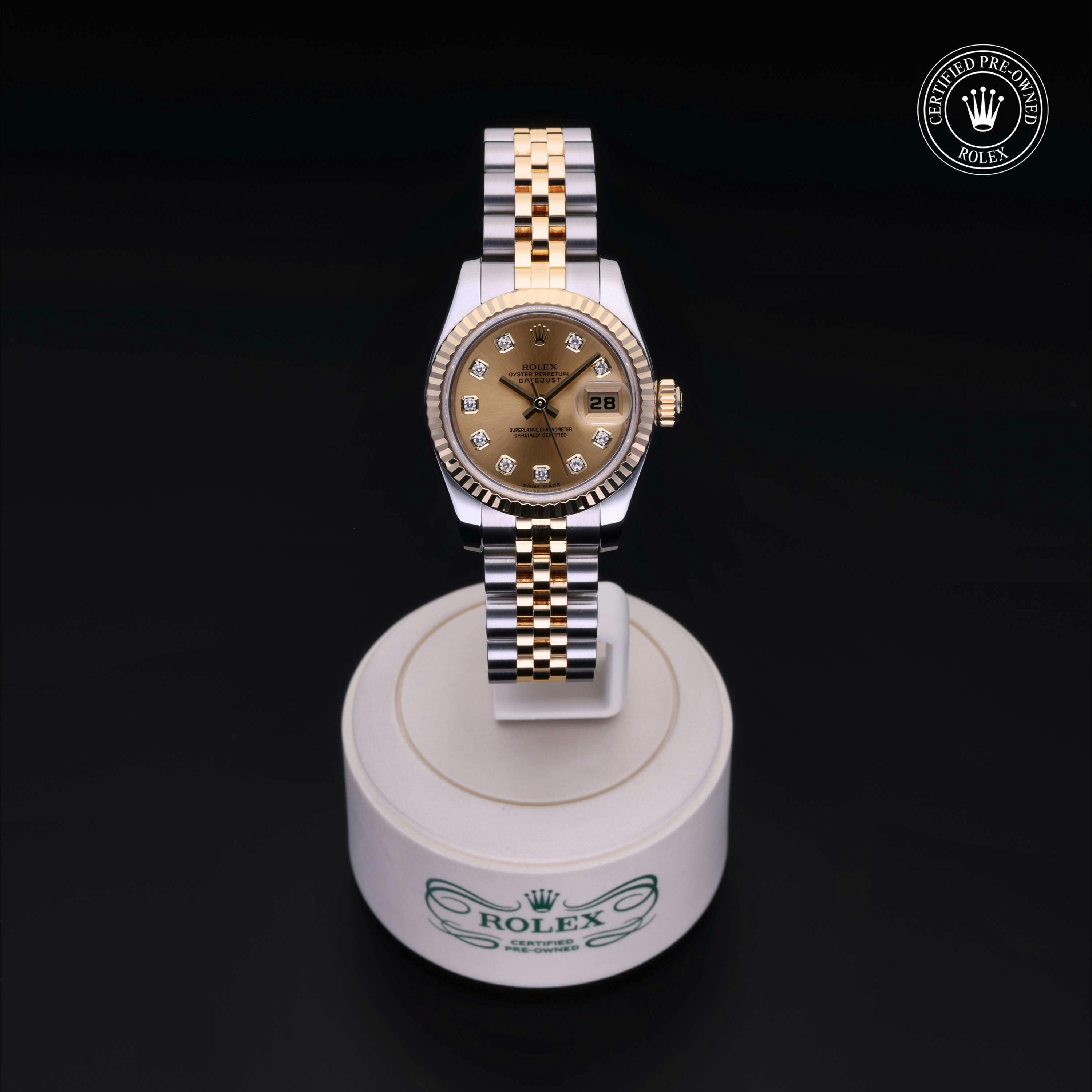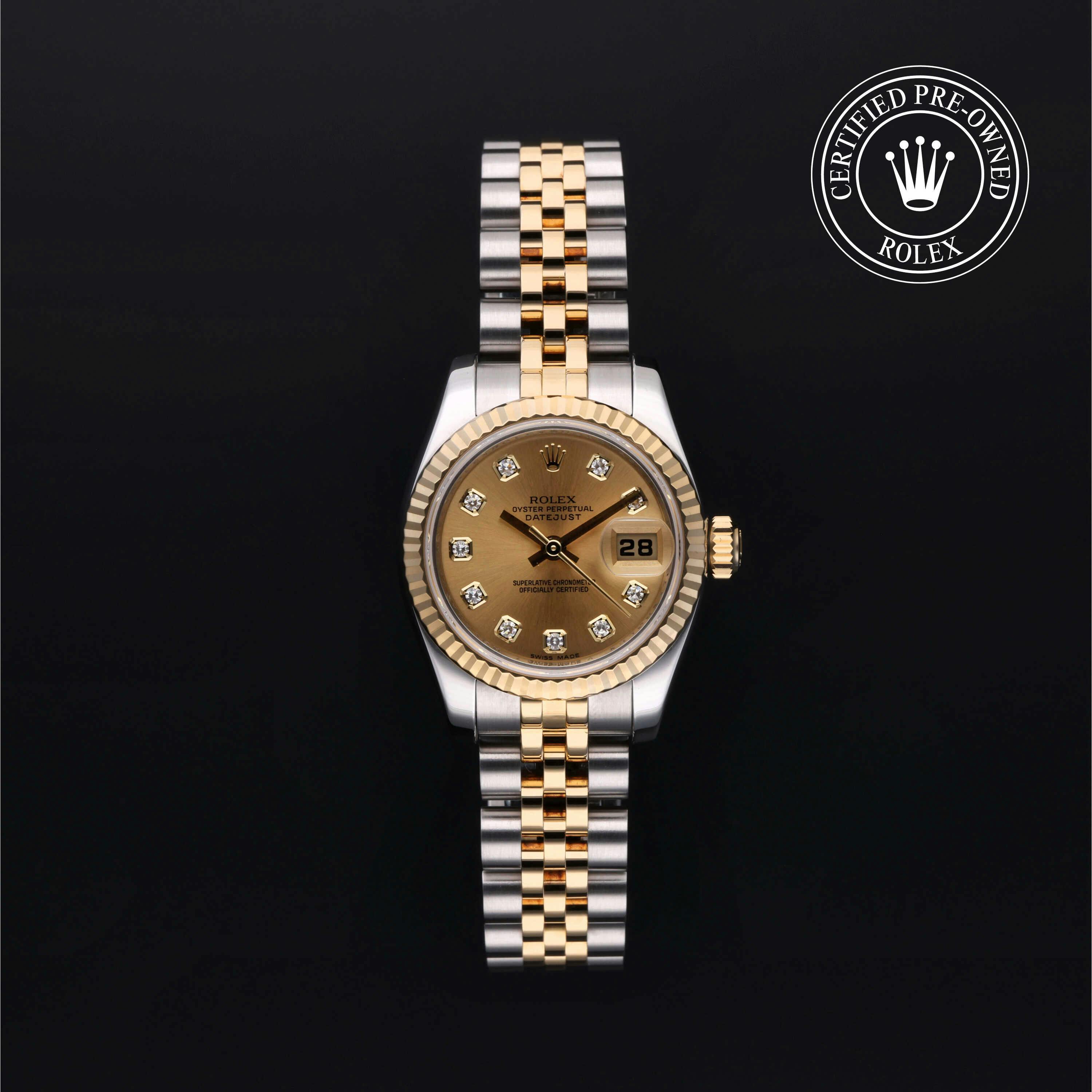Rolex Certified Pre-Owned Datejust (179173) self - winding automatic watch, features a 26mm stainless steel case with an 18k yellow gold fluted bezel surrounding a champagne diamond set dial on a stainless steel and 18k yellow gold jubilee bracelet. Functions include hours, minutes and seconds. This watch has received Rolex-authorized service and certification. It does not come with the original box or papers, but includes a custom Rolex Certified Pre-Owned hang tag, travel pouch and RCPO international warranty card.