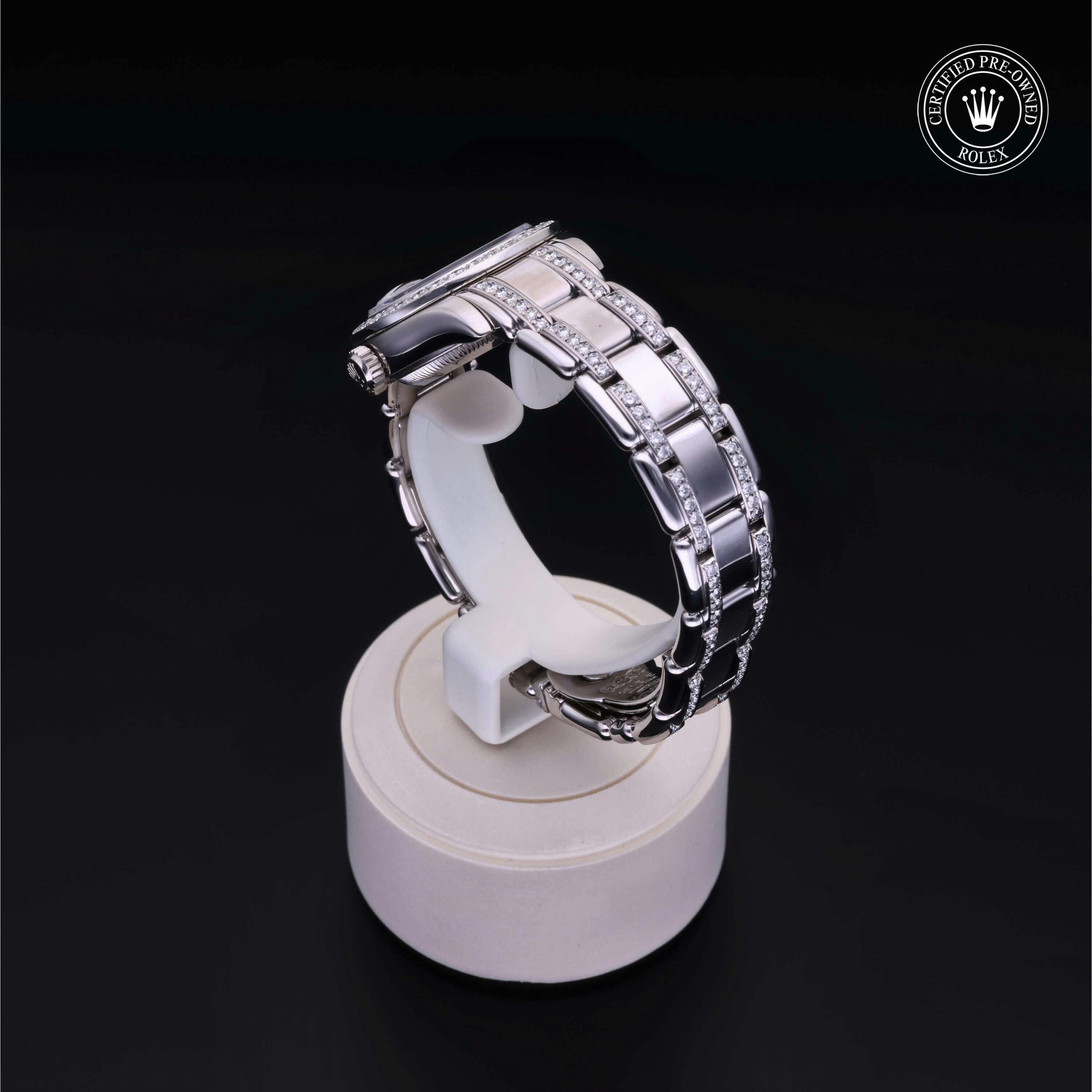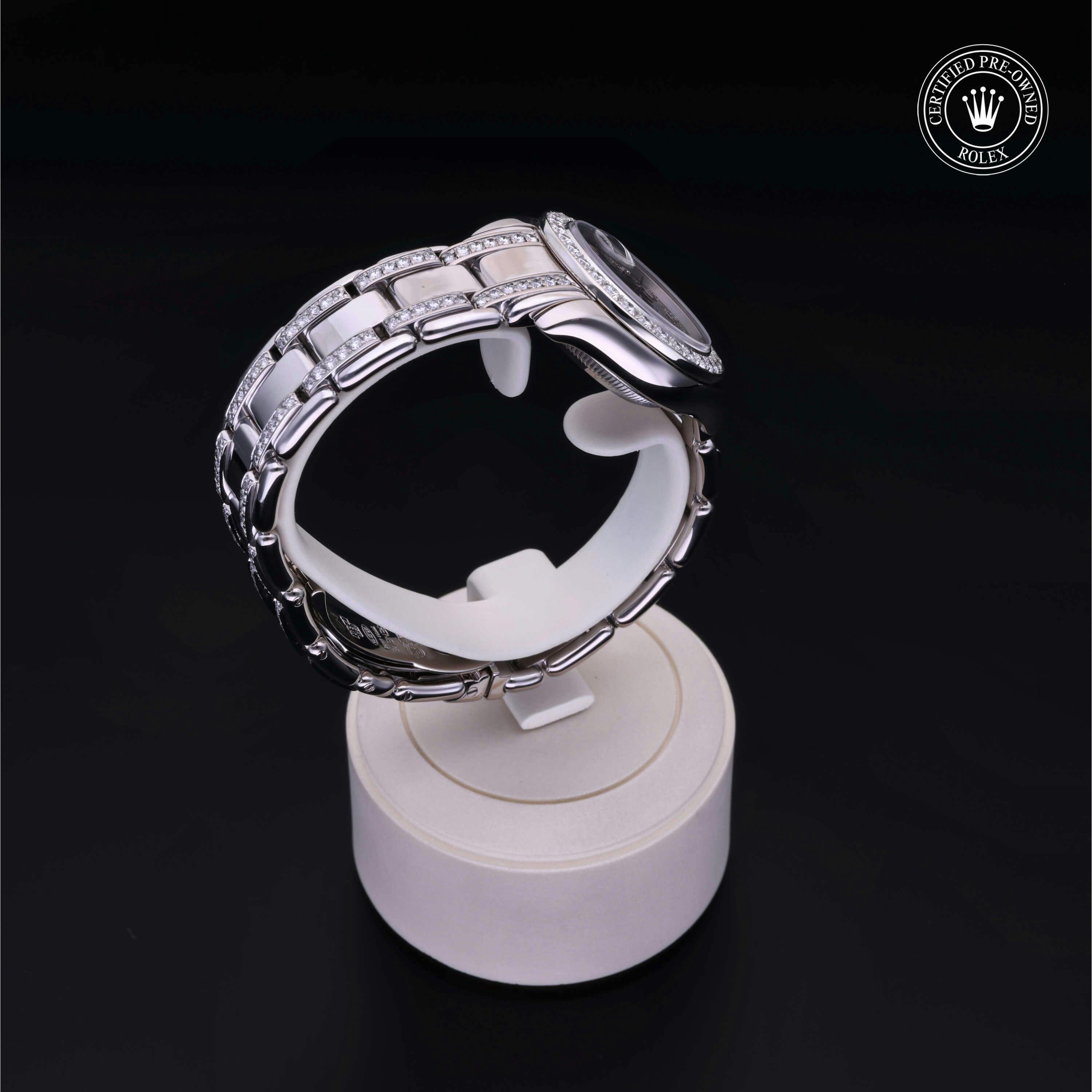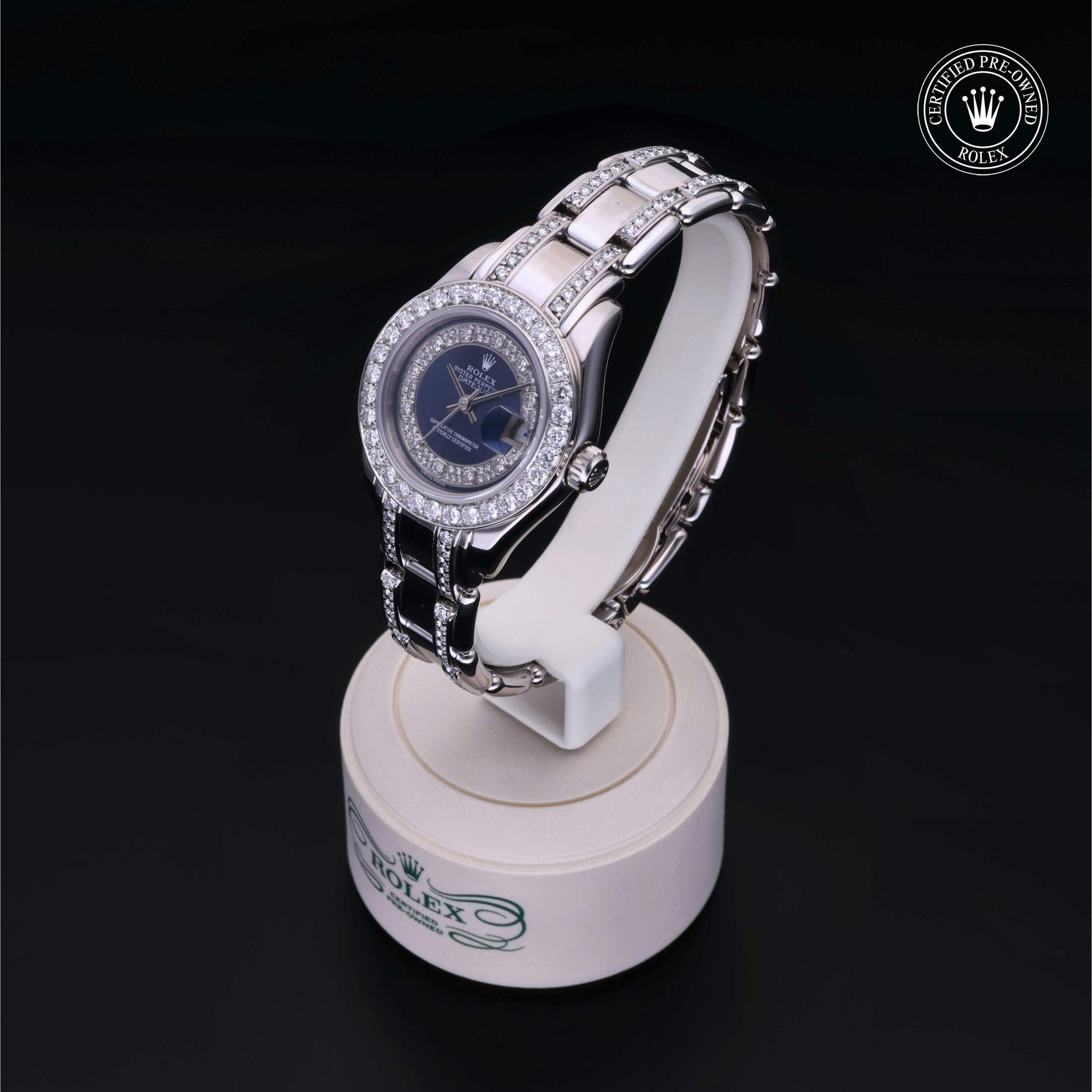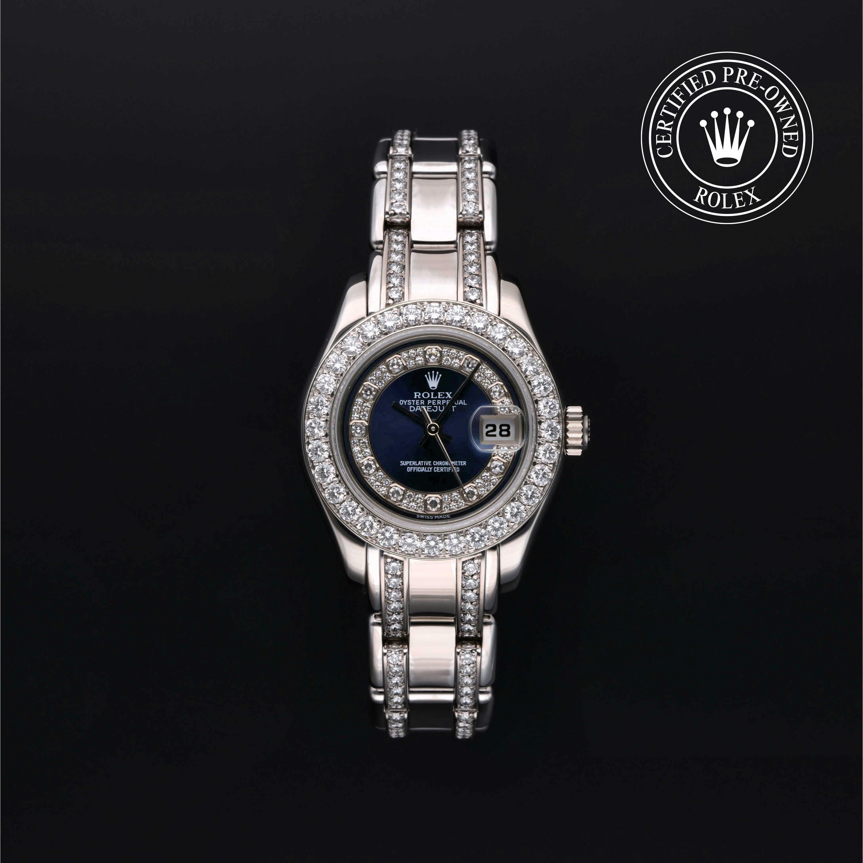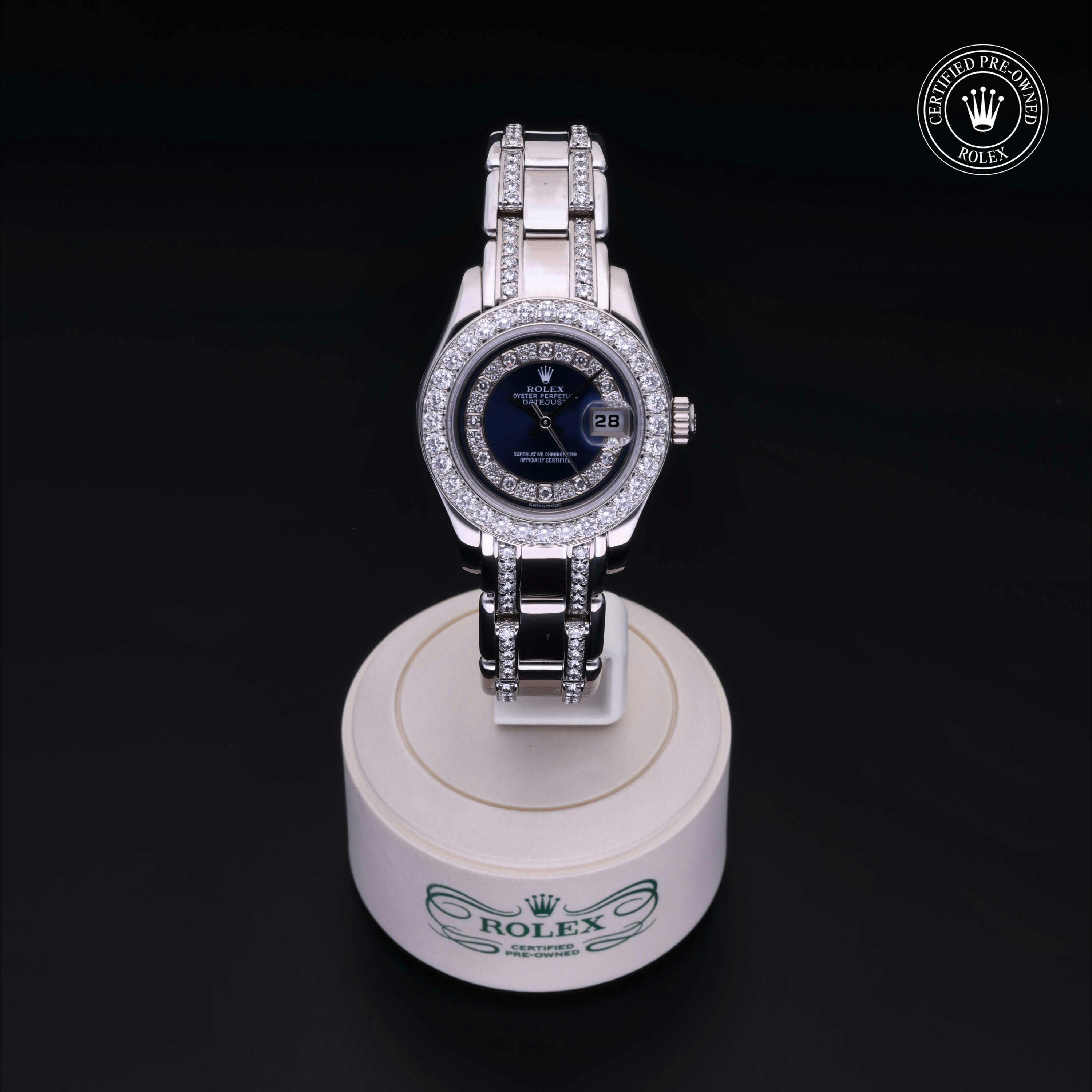 Rolex Certified Pre-Owned Datejust (69299) self - winding automatic watch, features a 29mm 18k white gold case with a diamond set bezel surrounding a blue Myriad diamond set dial on an 18k white gold, diamond set pearlmaster bracelet. Functions include hours, minutes, seconds and date. This watch has received Rolex-authorized service and certification. It does not come with the original box or papers, but includes a custom Rolex Certified Pre-Owned hang tang, travel pouch and RCPO international warranty card.