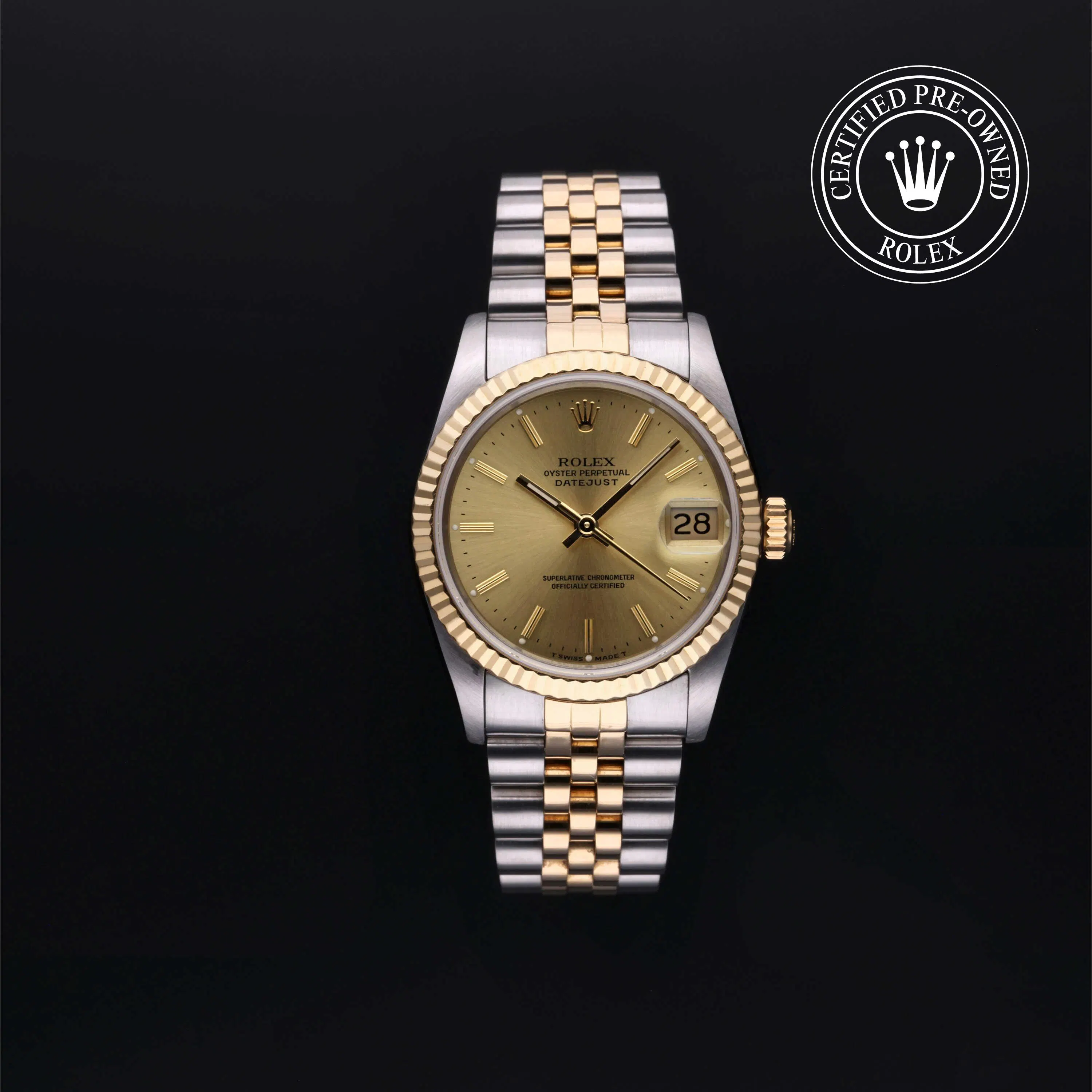 Rolex Certified Pre-Owned Datejust (68273) self - winding automatic watch, features a 31mm stainless steel case with an 18k yellow gold fluted bezel surrounding a champagne dial on a stainless steel and 18k yellow gold jubilee bracelet. Functions include hours, minutes, seconds and date. This watch has received Rolex-authorized service and certification. It does not come with the original box or papers, but includes a custom Rolex Certified Pre-Owned hang tag, travel pouch and RCPO international warranty card.