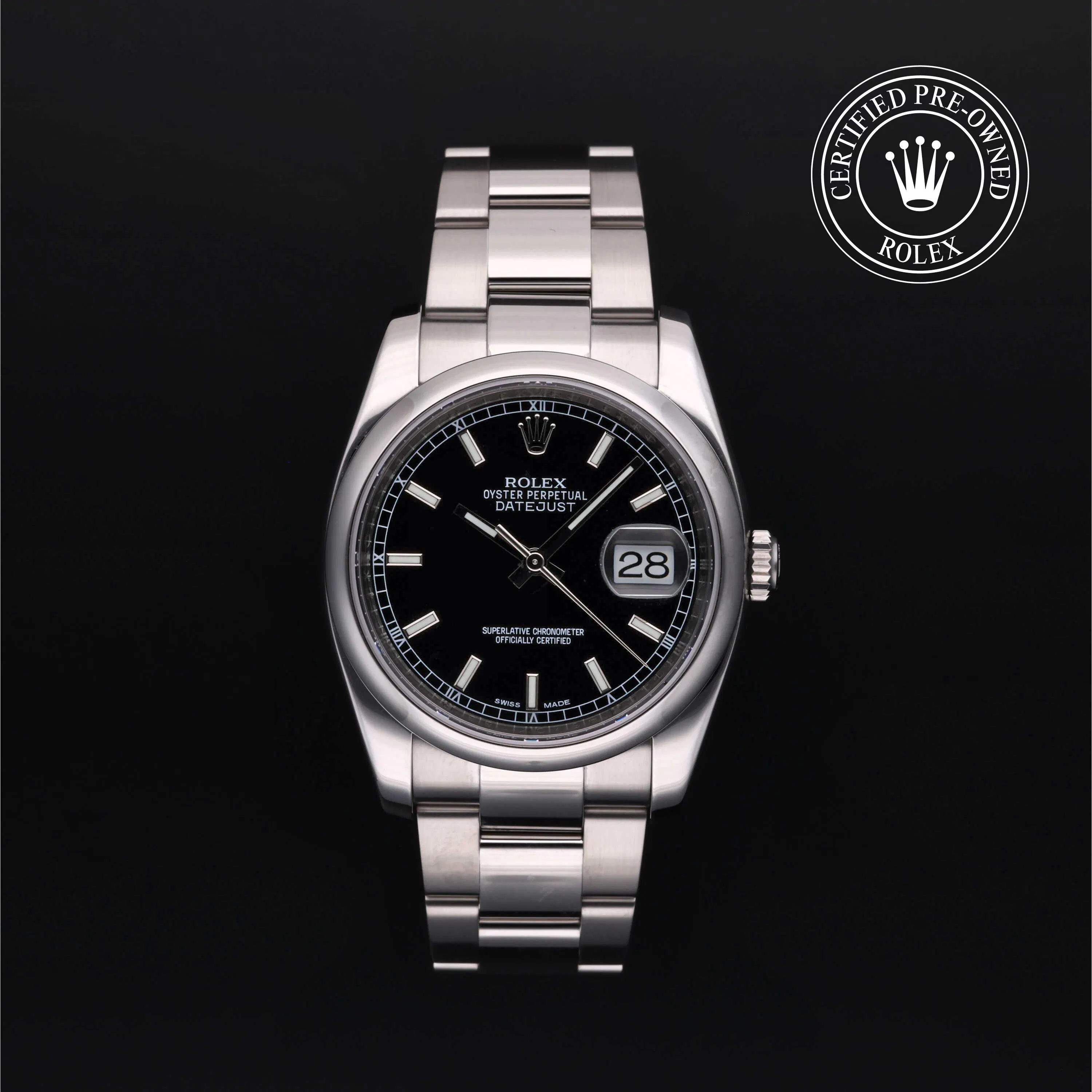 Rolex Certified Pre-Owned Datejust (116200) self - winding automatic watch, features a 36mm stainless steel case and domed bezel surrounding a black dial on a stainless steel oyster bracelet. Functions include hours, minutes, seconds and date. This watch has received Rolex-authorized service and certification. It comes with the original box and papers, and includes a custom Rolex Certified Pre-Owned hang tag, travel pouch and RCPO international warranty card.