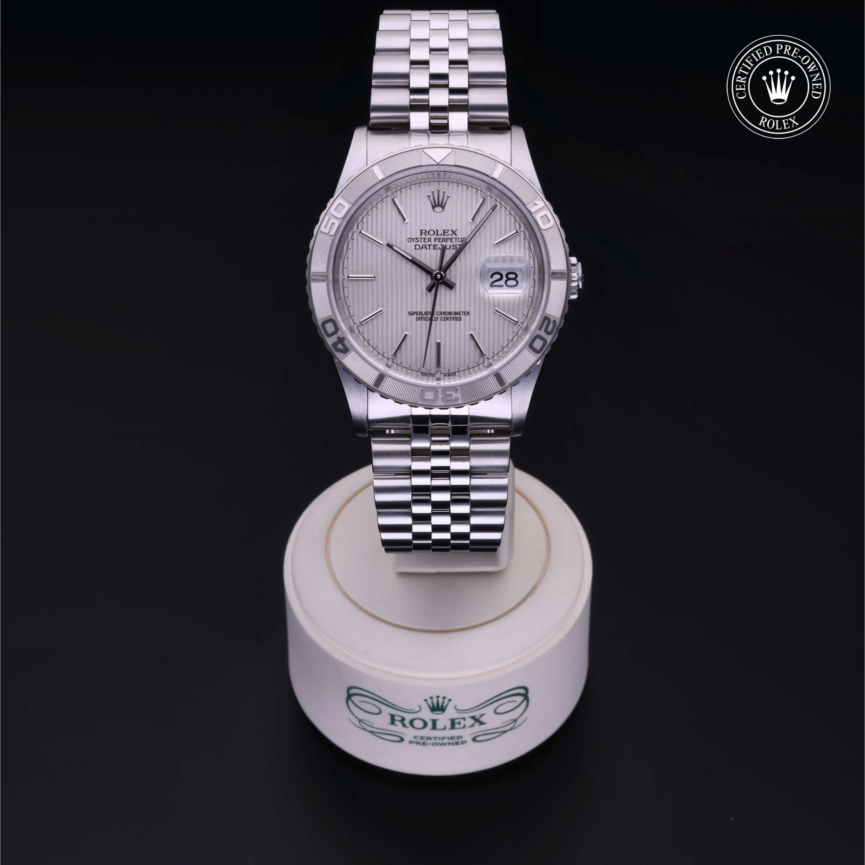Rolex Certified Pre-Owned Oyster Perpetual Datejust Turn-O-Graph (16264) self - winding automatic watch, features a 36mm stainless steel case with an 18k white gold bidirectional Turn-o-Graph 60-minute scale bezel surrounding a silver Tapestry pattern index dial. The watch is secured on a stainless steel Jubilee bracelet complete with a folding buckle. Functions include hours, minutes, seconds and date. This watch has been serviced by an authorized service center and certified by Rolex. It comes with the original box and papers as well as a custom Rolex Certified Pre-Owned hang tag, travel pouch and international warranty card.