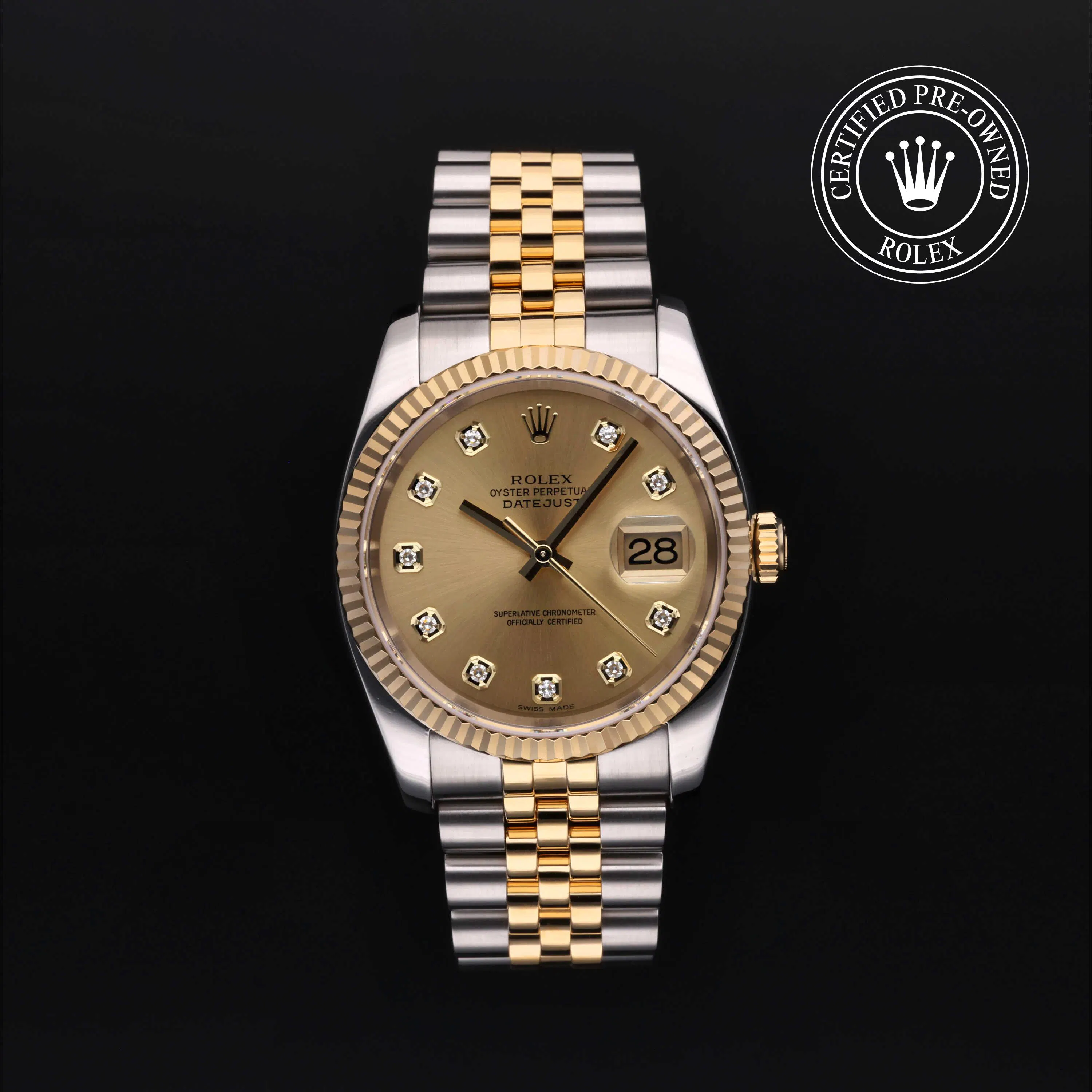Rolex Certified Pre-Owned Datejust (116233) self - winding automatic watch, features a 36mm stainless steel case with an 18k yellow gold fluted bezel surrounding a champagne diamond set dial on a stainless steel and 18k yellow gold Jubilee bracelet. Functions include hours, minutes, seconds and date. This watch has received Rolex-authorized service and certification. It does not come with the original box or papers, but includes a custom Rolex Certified Pre-Owned hang tag, travel pouch and RCPO international warranty card.
