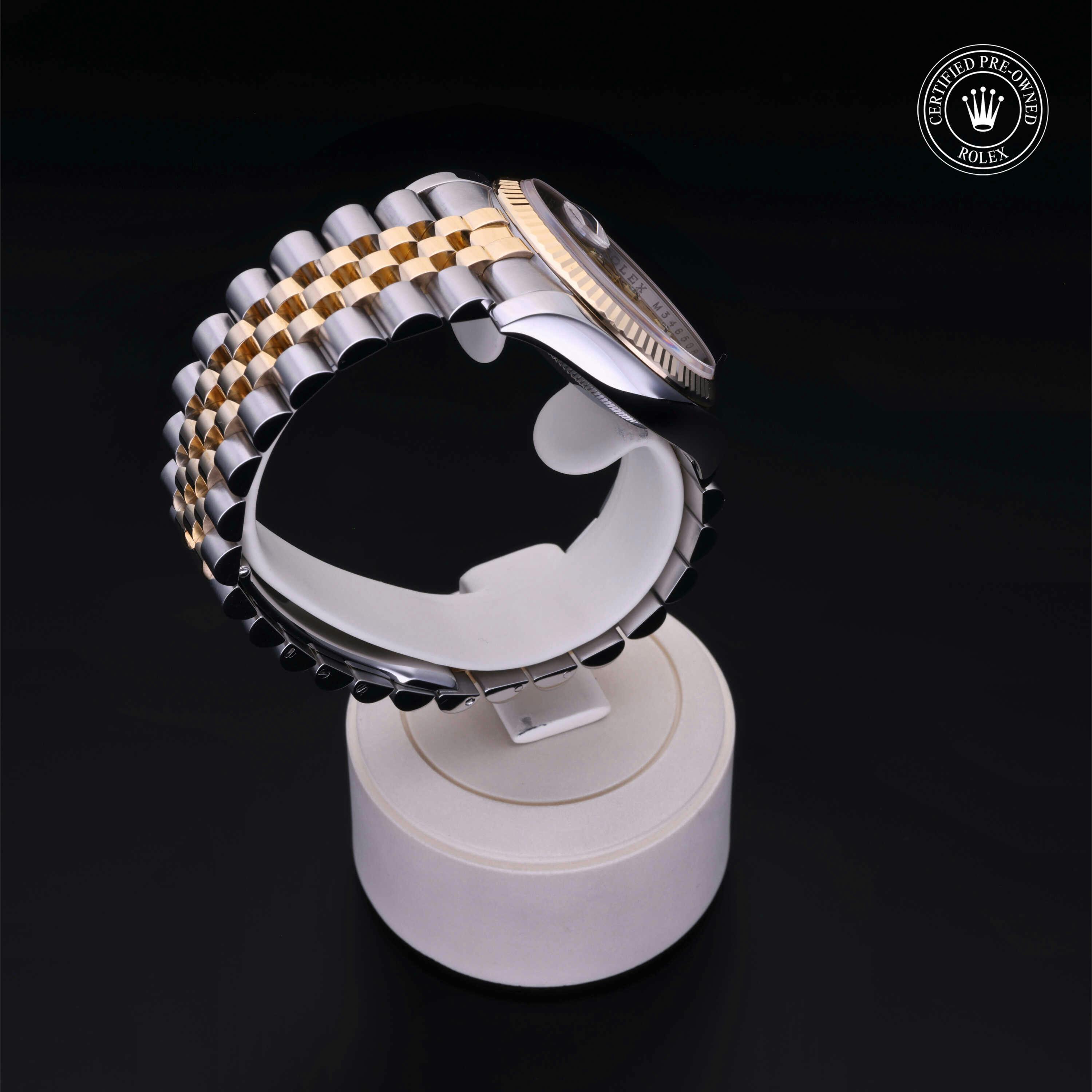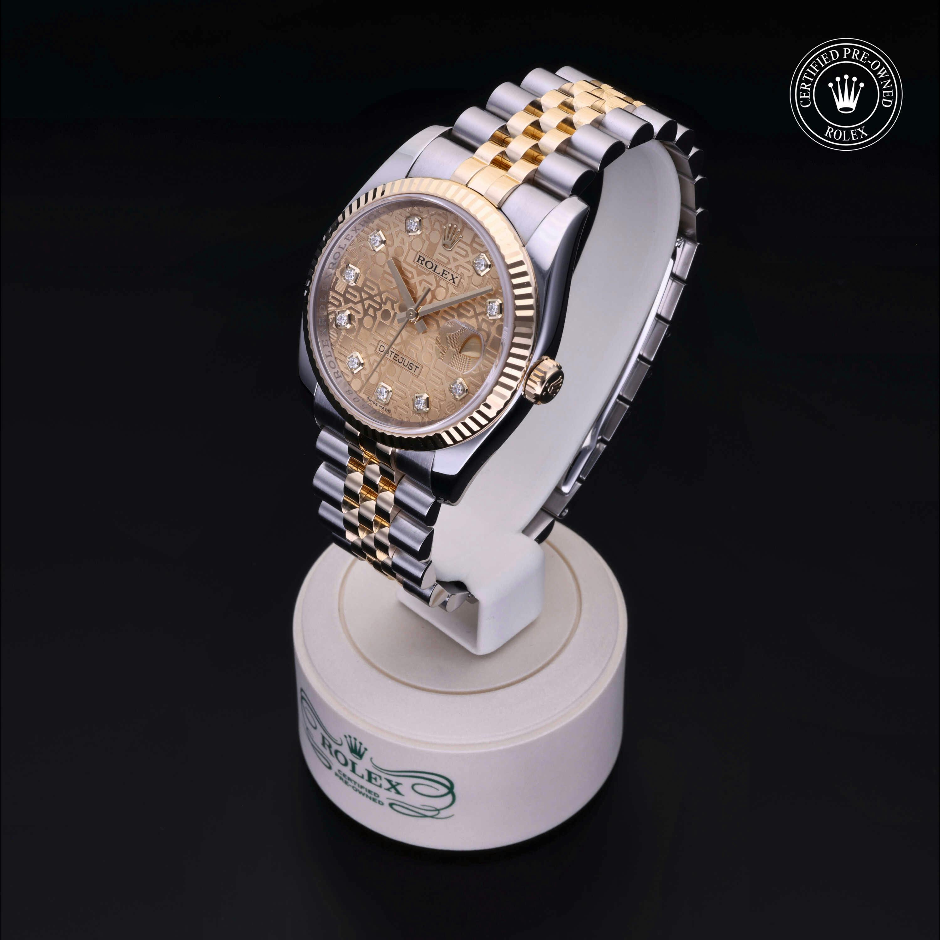 Rolex Certified Pre-Owned Datejust (116233) self - winding automatic watch, features a 36mm stainless steel case with an 18k yellow gold fluted bezel surrounding a champagne Jubilee diamond set dial on a stainless steel and 18k yellow gold jubilee bracelet. Functions include hours, minutes, seconds and date. This watch has received Rolex-authorized service and certification. It does not come with the original box or papers, but includes a custom Rolex Certified Pre-Owned hang tag, travel pouch and RCPO international warranty card.