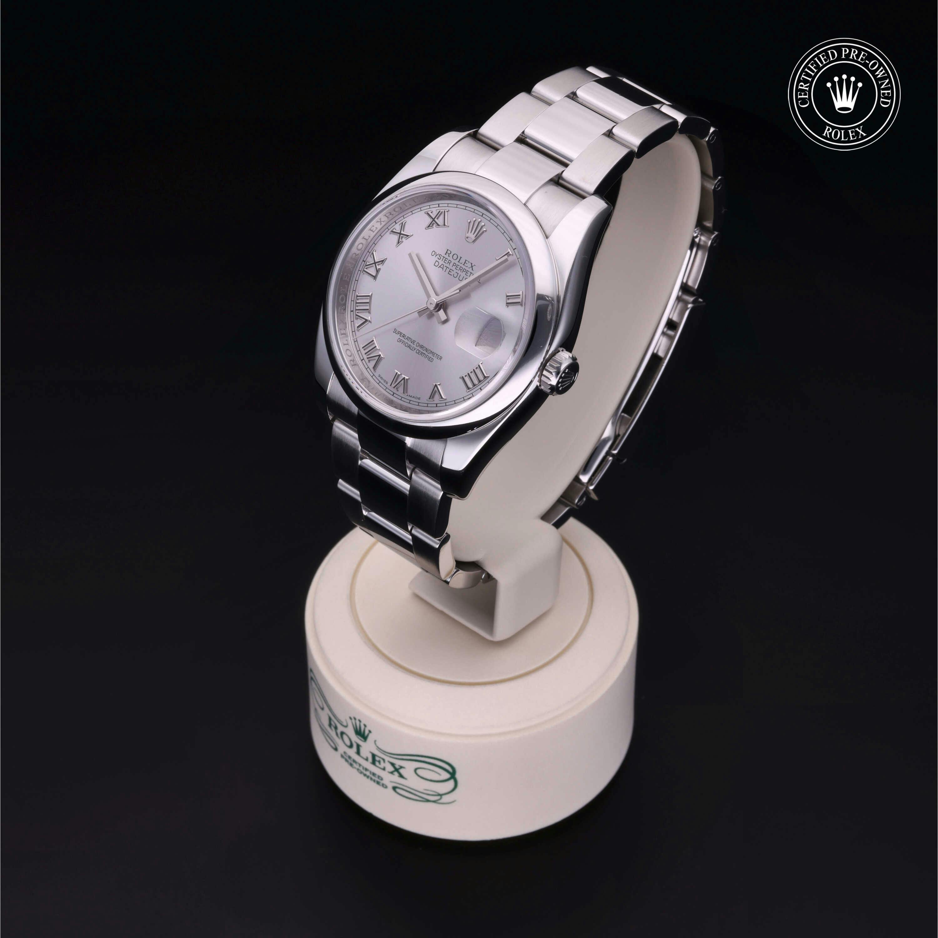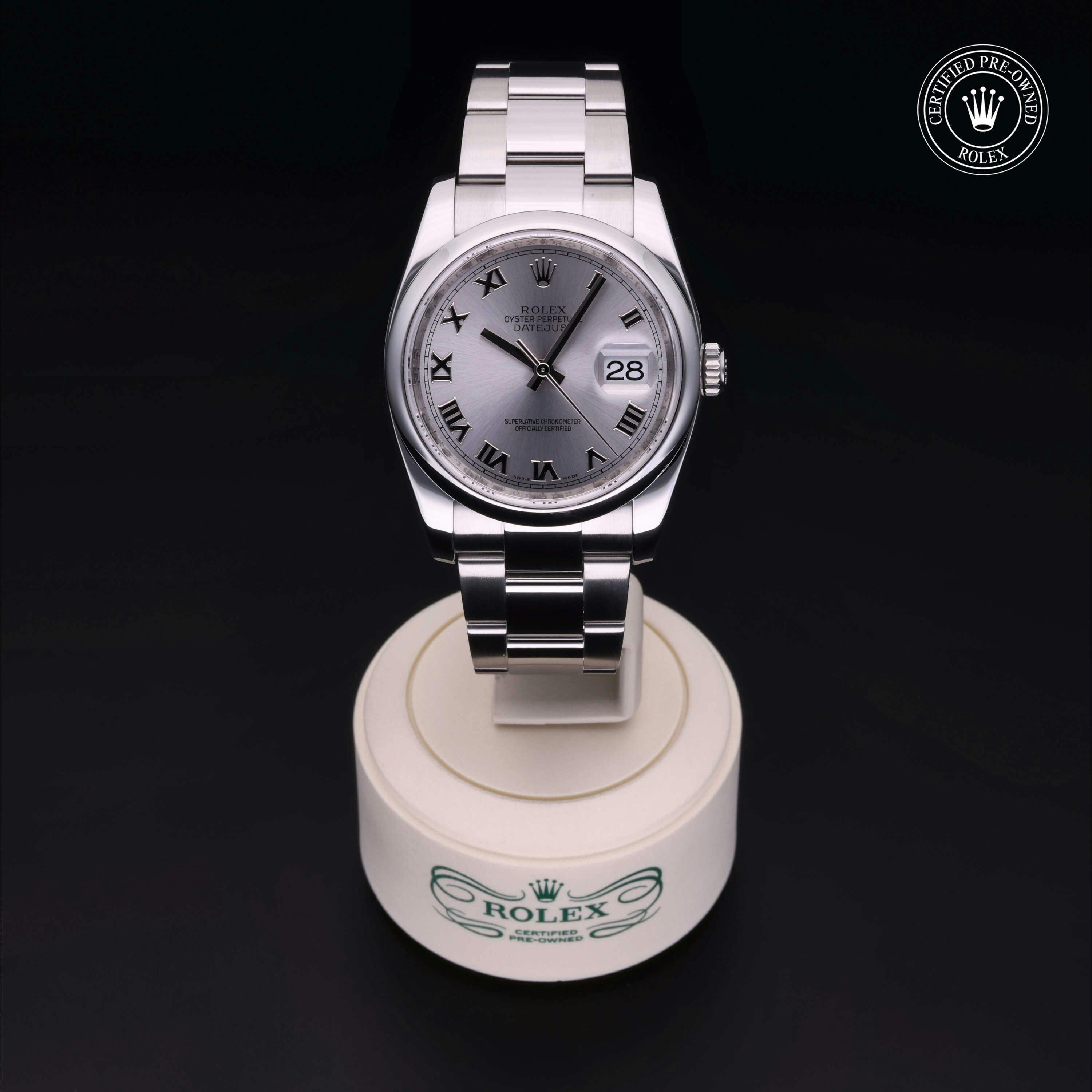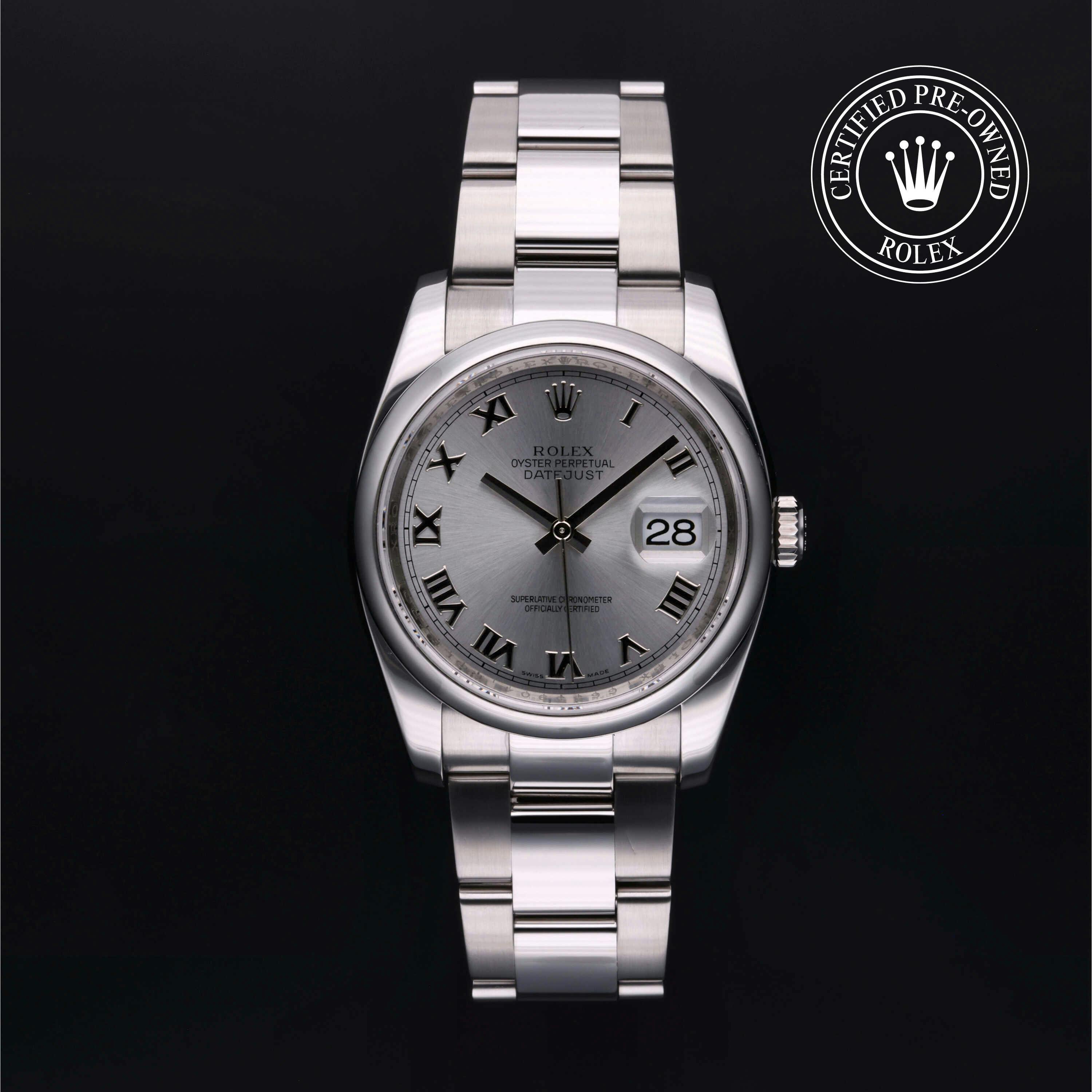 Rolex Certified Pre-Owned Datejust (116200) self - winding automatic watch, features a 36mm stainless steel case and domed bezel surrounding a rhodium dial on a stainless steel oyster bracelet. Functions include hours, minutes, seconds and date. This watch has received Rolex-authorized service and certification. It does not come with the original box or papers, but includes a custom Rolex Certified Pre-Owned hang tag, travel pouch and RCPO international warranty card.