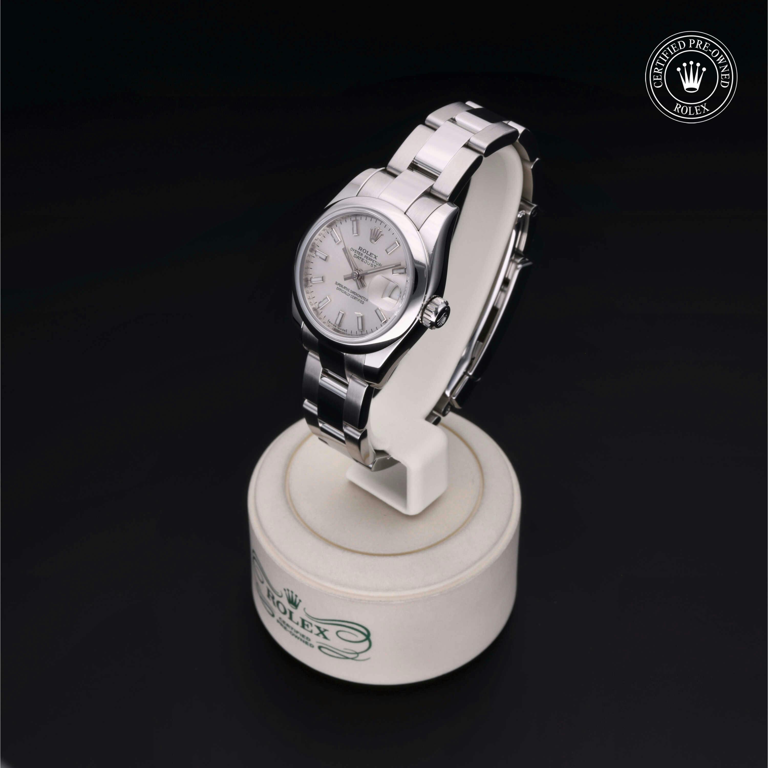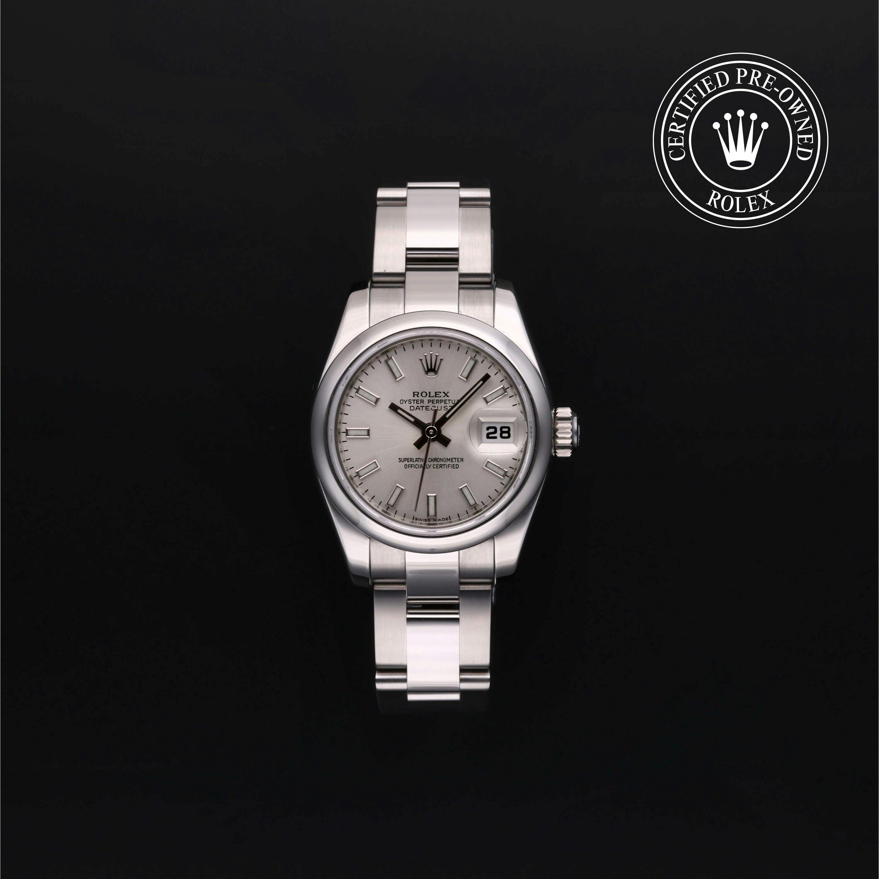 Rolex Certified Pre-Owned Datejust (179160) self - winding automatic watch, features a 26mm stainless steel case and domed bezel surrounding a silver dial on a stainless steel oyster bracelet. Functions include hours, minutes, seconds and date. This watch has received Rolex-authorized service and certification. It does not come with the original box or papers, but includes a custom Rolex Certified Pre-Owned hang tag, travel pouch and RCPO international warranty card.