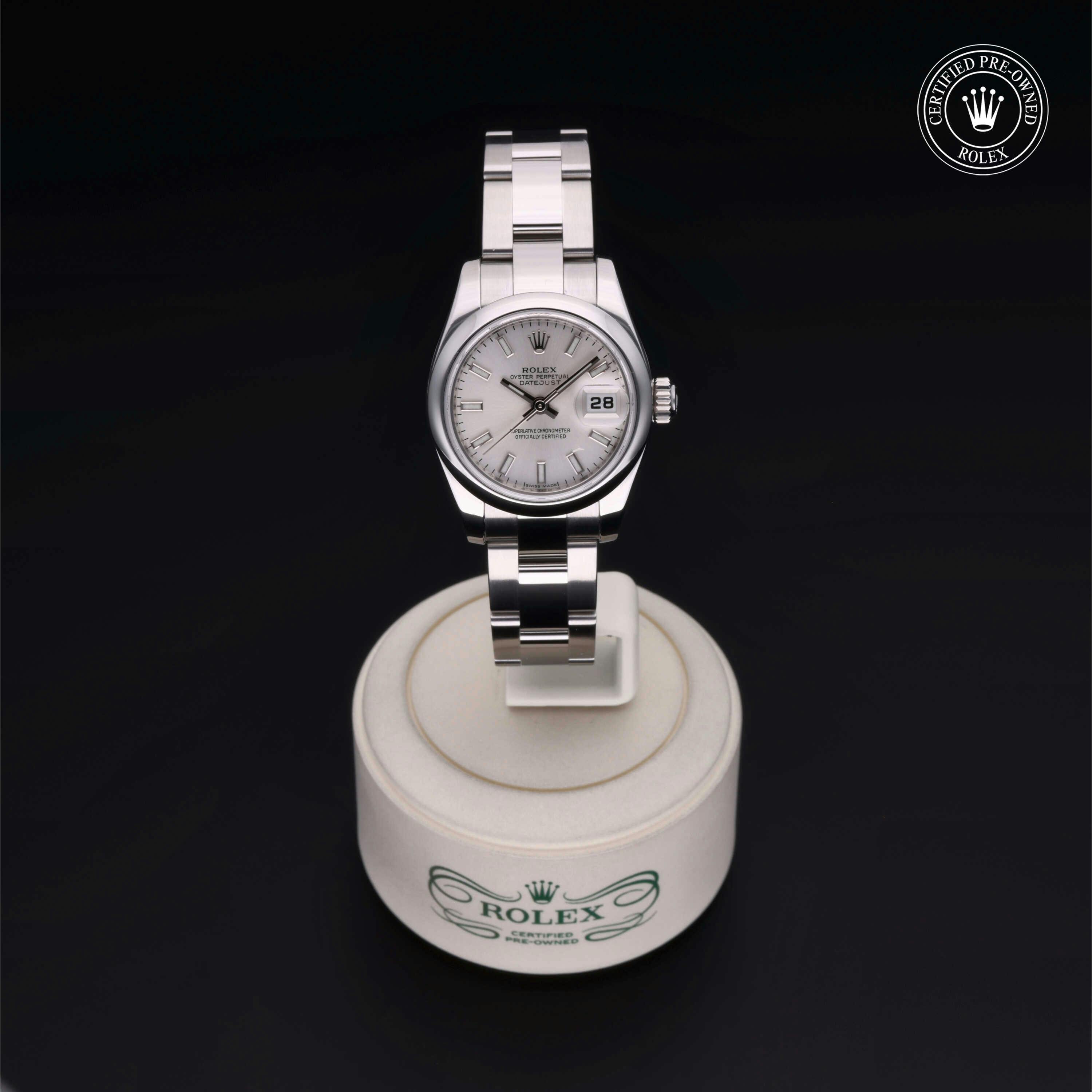 Rolex Certified Pre-Owned Datejust (179160) self - winding automatic watch, features a 26mm stainless steel case and domed bezel surrounding a silver dial on a stainless steel oyster bracelet. Functions include hours, minutes, seconds and date. This watch has received Rolex-authorized service and certification. It does not come with the original box or papers, but includes a custom Rolex Certified Pre-Owned hang tag, travel pouch and RCPO international warranty card.