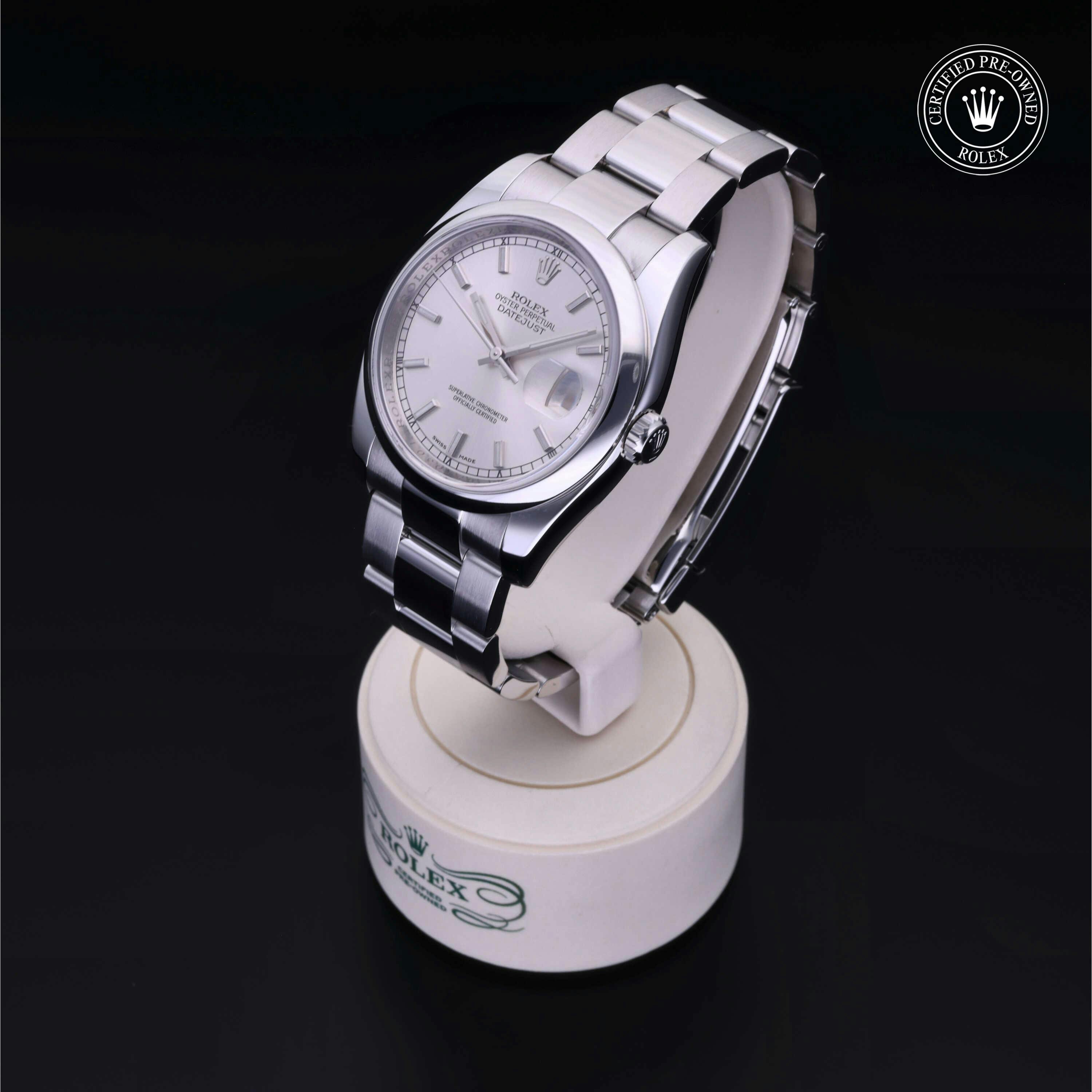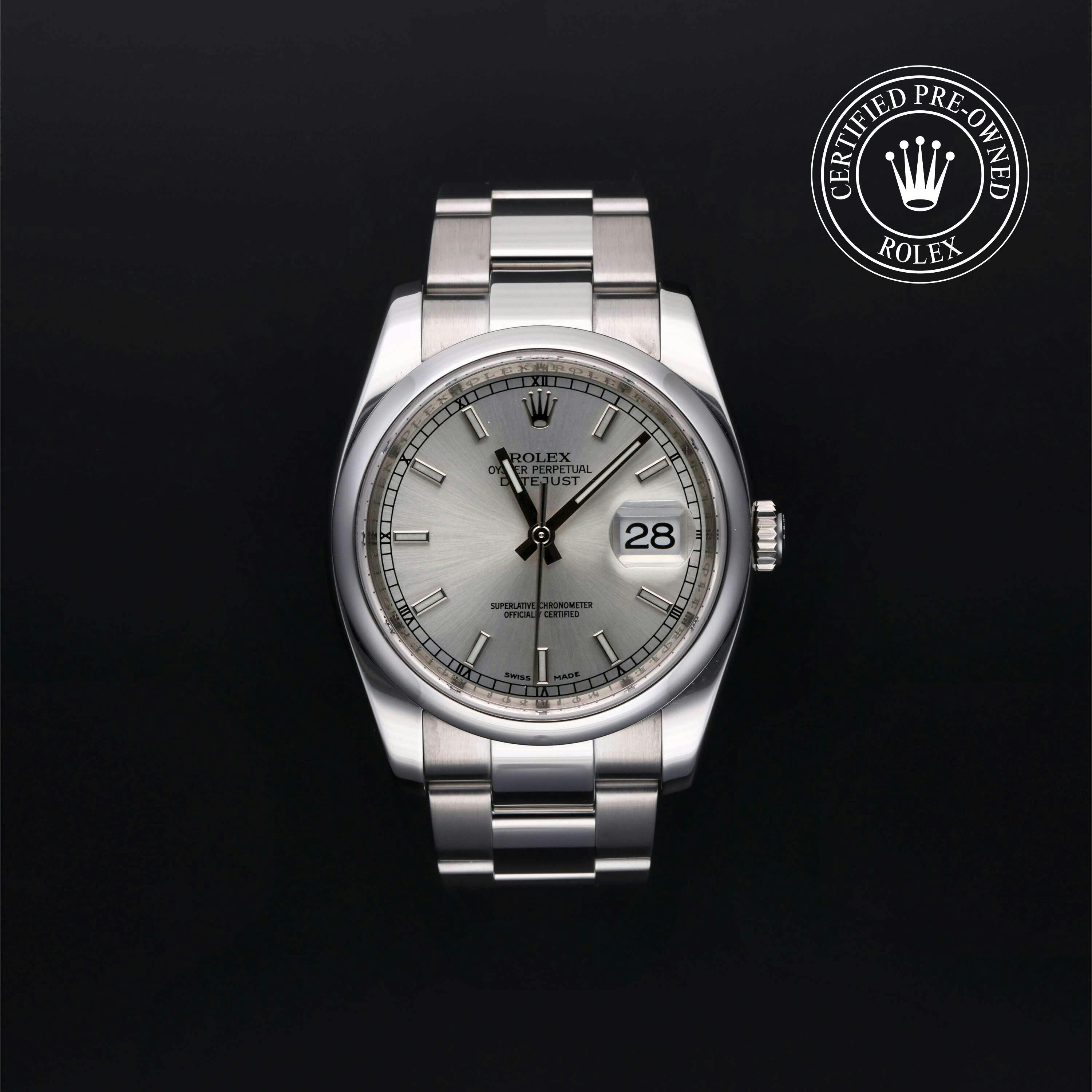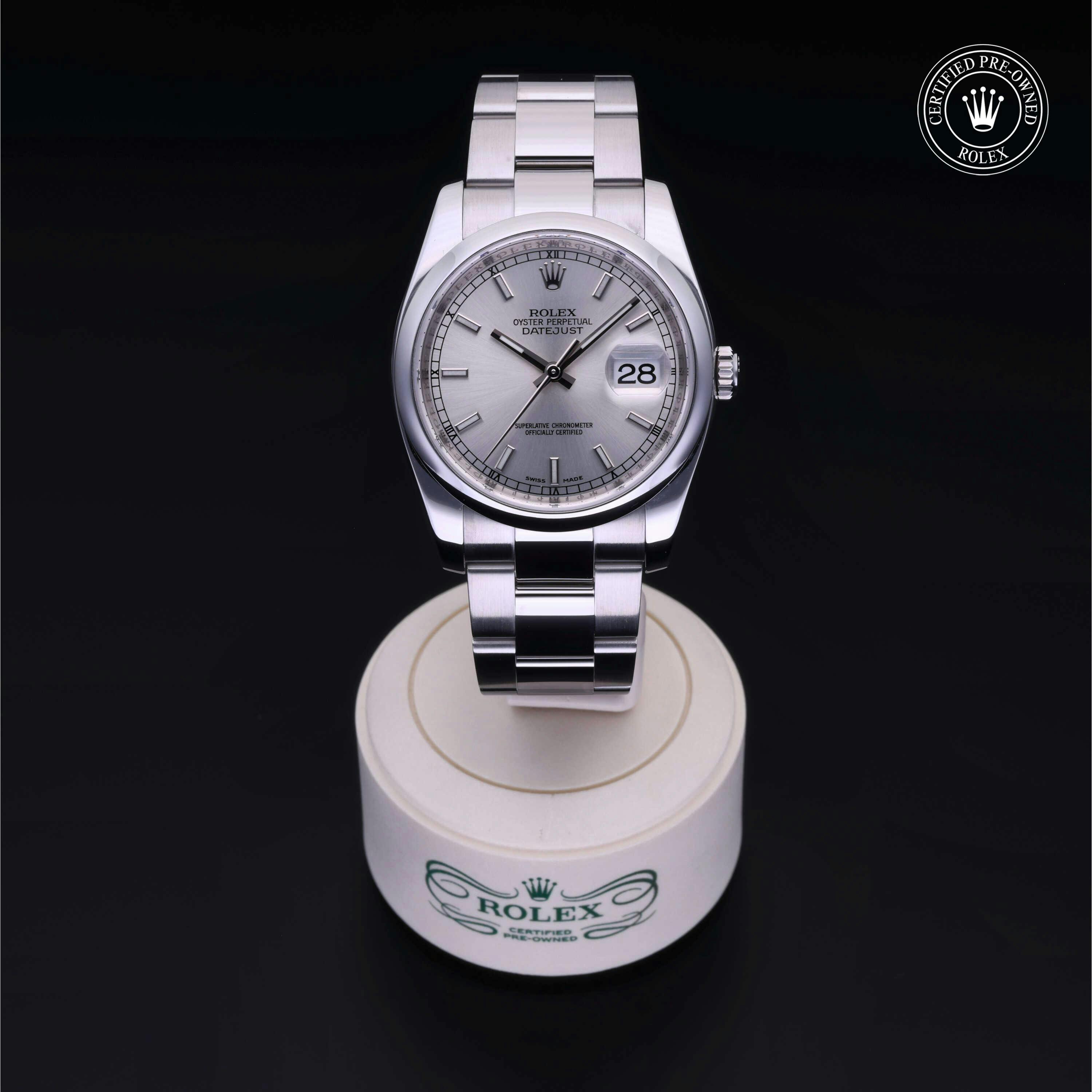 Rolex Certified Pre-Owned Datejust (116200) self - winding automatic watch, features a 36mm stainless steel case and domed bezel surrounding a silver dial on a stainless steel oyster bracelet. Functions include hours, minutes, seconds and date. This watch has received Rolex-authorized service and certification. It does not come with the original box or papers, but includes a custom Rolex Certified Pre-Owned hang tag, travel pouch and RCPO international warranty card.