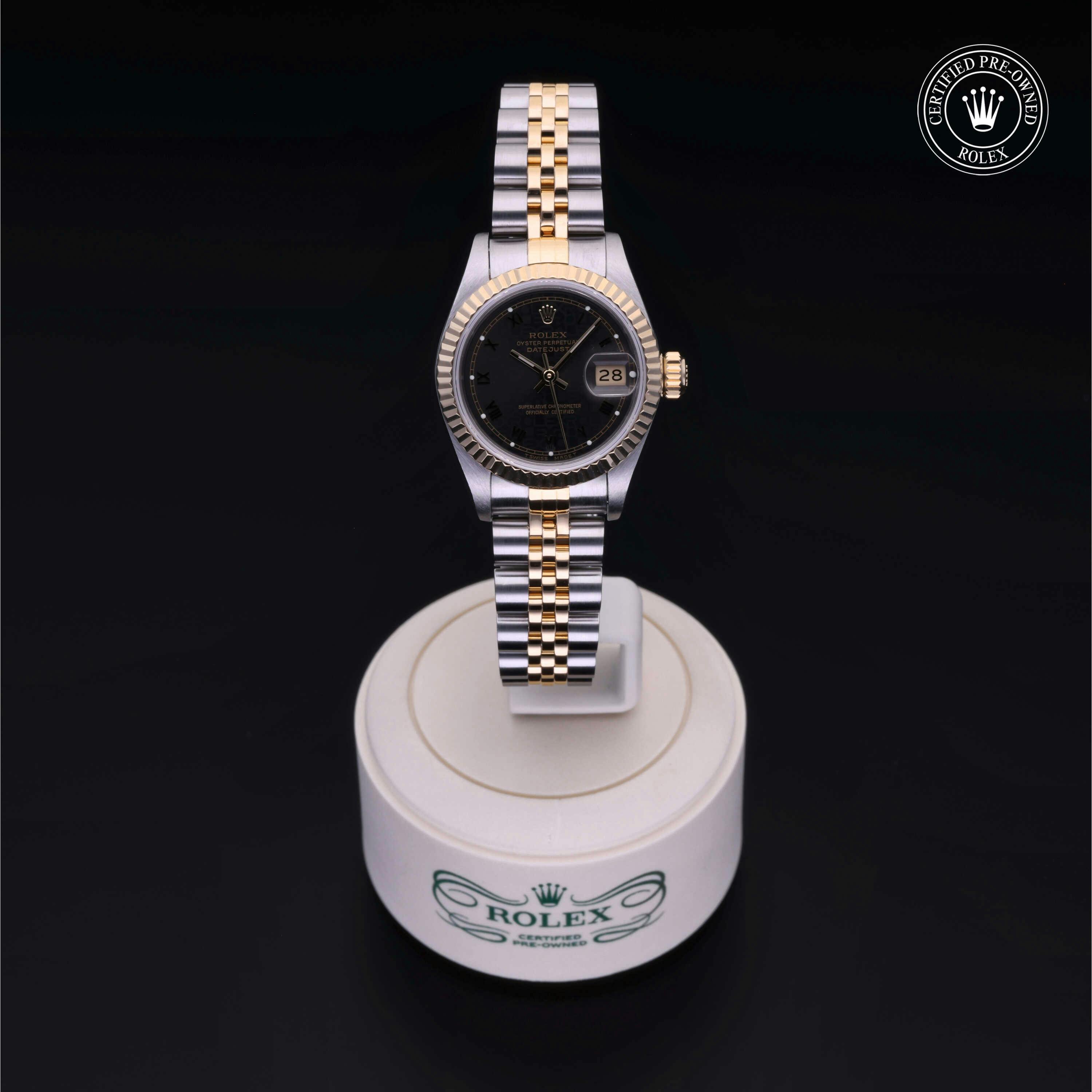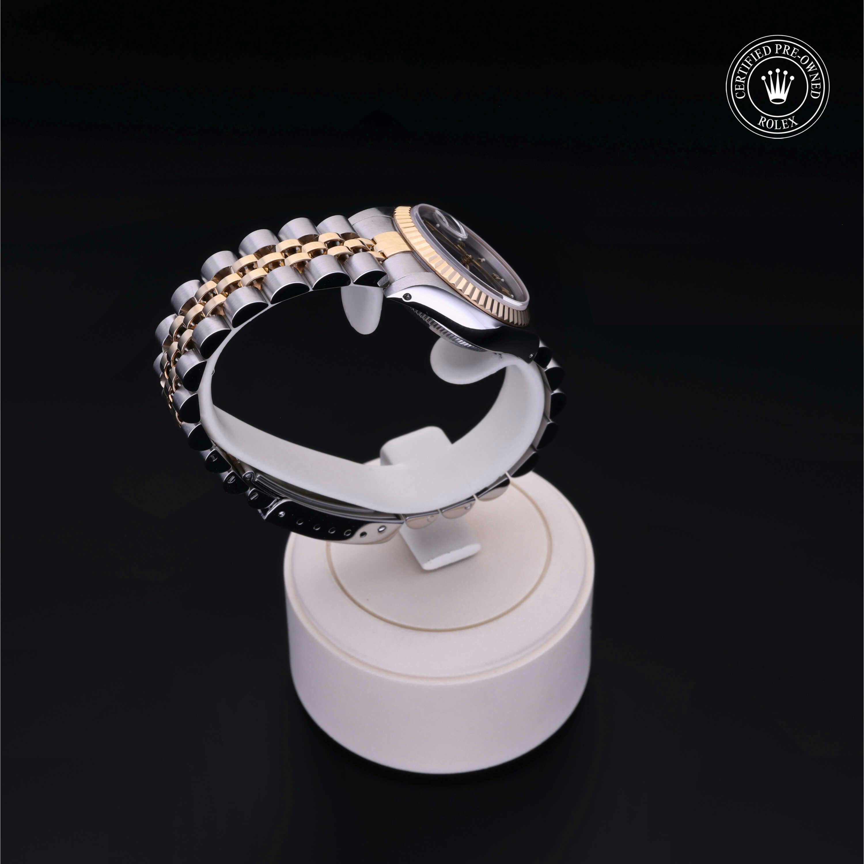 Rolex Certified Pre-Owned Datejust (69173) self - winding automatic watch, features a 26mm stainless steel case with an 18k yellow gold fluted surrounding a dark grey roman dial. The watch is paired on a stainless steel and 18k yellow gold Jubilee bracelet. Functions include hours, minutes, seconds and date. This watch has received Rolex-authorized service and certification. It does not come with the original box or papers, but includes a custom Rolex Certified Pre-Owned hang tag, travel pouch and RCPO international warranty card.
